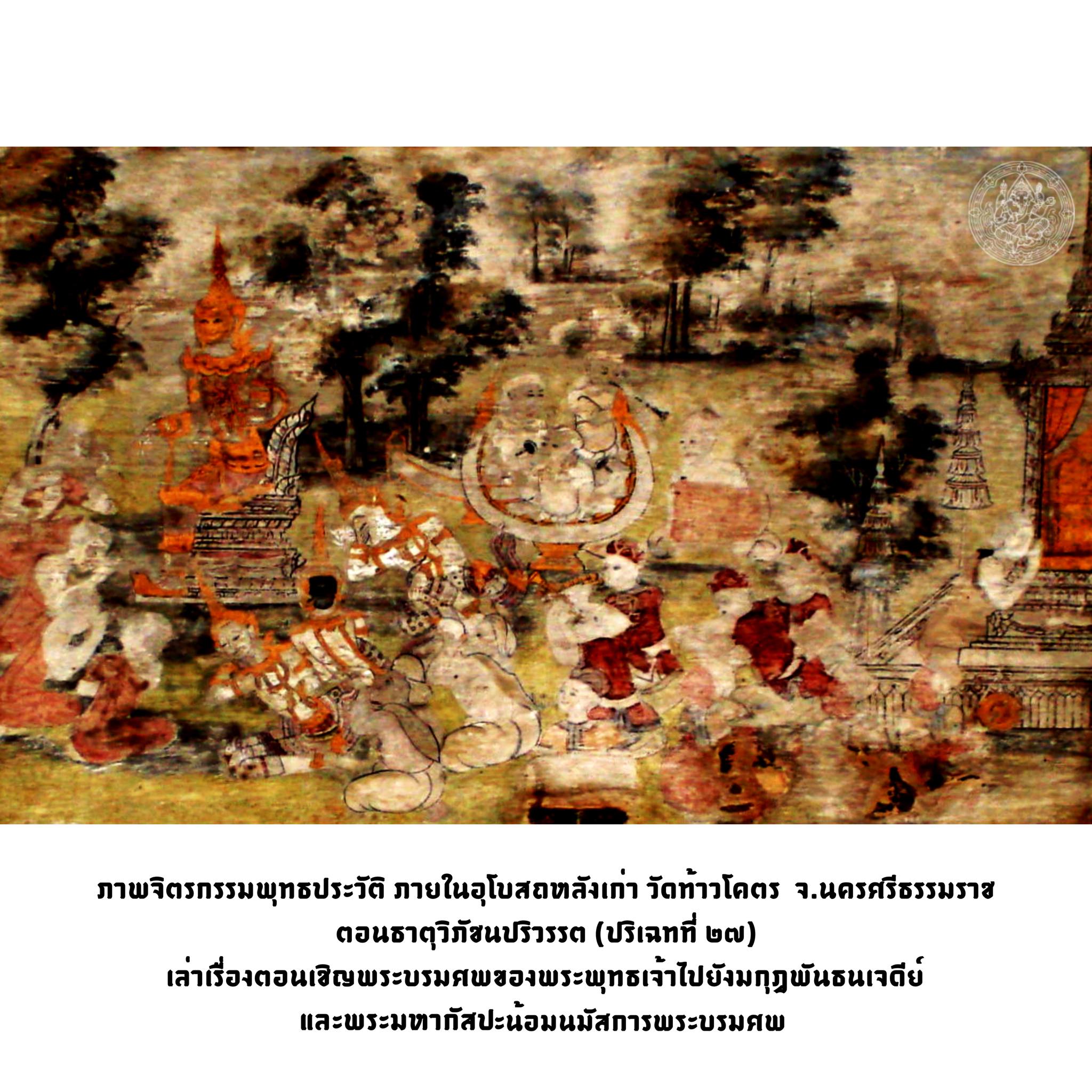 ภาพ: จิตรกรรมพุทธประวัติ เขียนบนไม้กระดานคอสอง ภายในอุโบสถหลังเก่า วัดท้าวโคตร อ.เมือง จ.นครศรีธรรมราช ปริเฉทที่ ๒๗ (ธาตุวิภัชนปริวัตต์) เล่าเรื่องตอนอัญเชิญพระบรมศพของพระพุทธเจ้าไปยังมกุฏพันธนเจดีย์ เมืองกุสินารา และพระมหากัสปะมานมัสการพระบรมศพ / ภาพด้านซ้ายเป็นขบวนแห่พระบรมศพซึ่งทรงเครื่องประดับอันมีชื่อว่ามหาลดาปสาธน์ แวดล้อมด้วยพระสงฆ์สาวก และเหล่ามัลลกษัตริย์ ภาพกลางเป็นภาพเครื่องดนตรีสมโภชน์พระบรมศพ และภาพด้านขวาเป็นภาพพระมหากัสปะน้อมนมัสการพระบรมศพของพระพุทธเจ้า