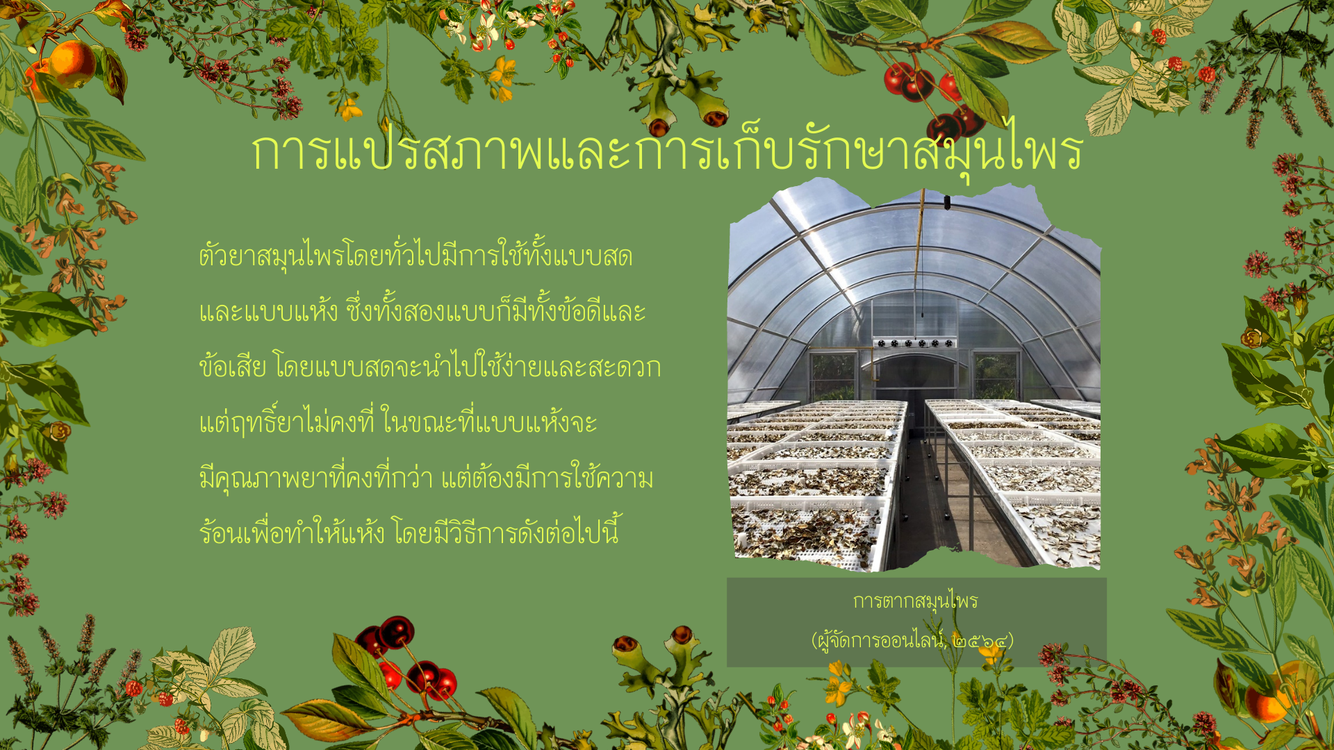 เรื่อง “ยาแผนไทย” : กรรมวิธีการแปรสภาพและเก็บสมุนไพร ตลอดจนการเตรียมเครื่องยาในการ ผลิตยาสมุนไพรไทยอย่างถูกวิธี