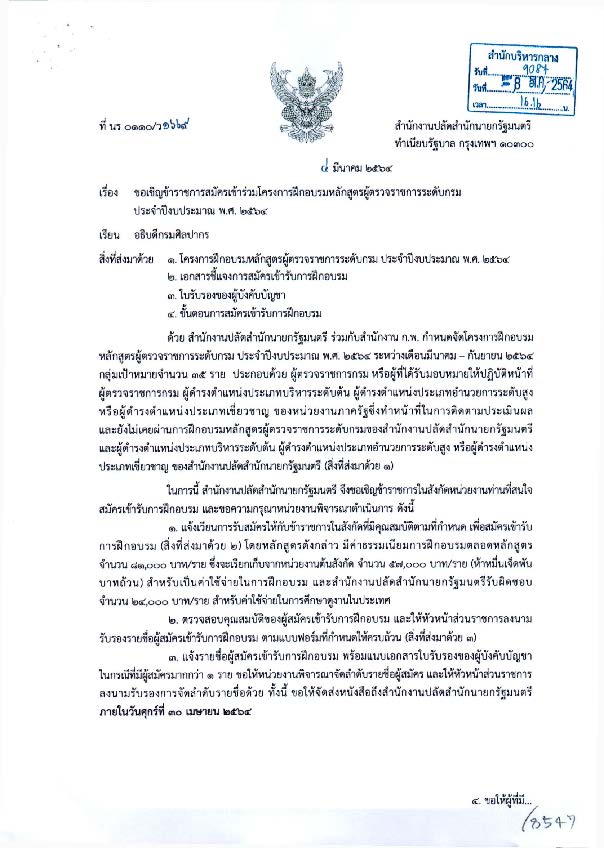 ขอเชิญข้าราชการสมัครเข้าร่วมโครงการฝึกอบรมหลักสูตรผู้ตรวจราชการระดับกรม ประจำปีงบประมาณ ๒๕๖๔