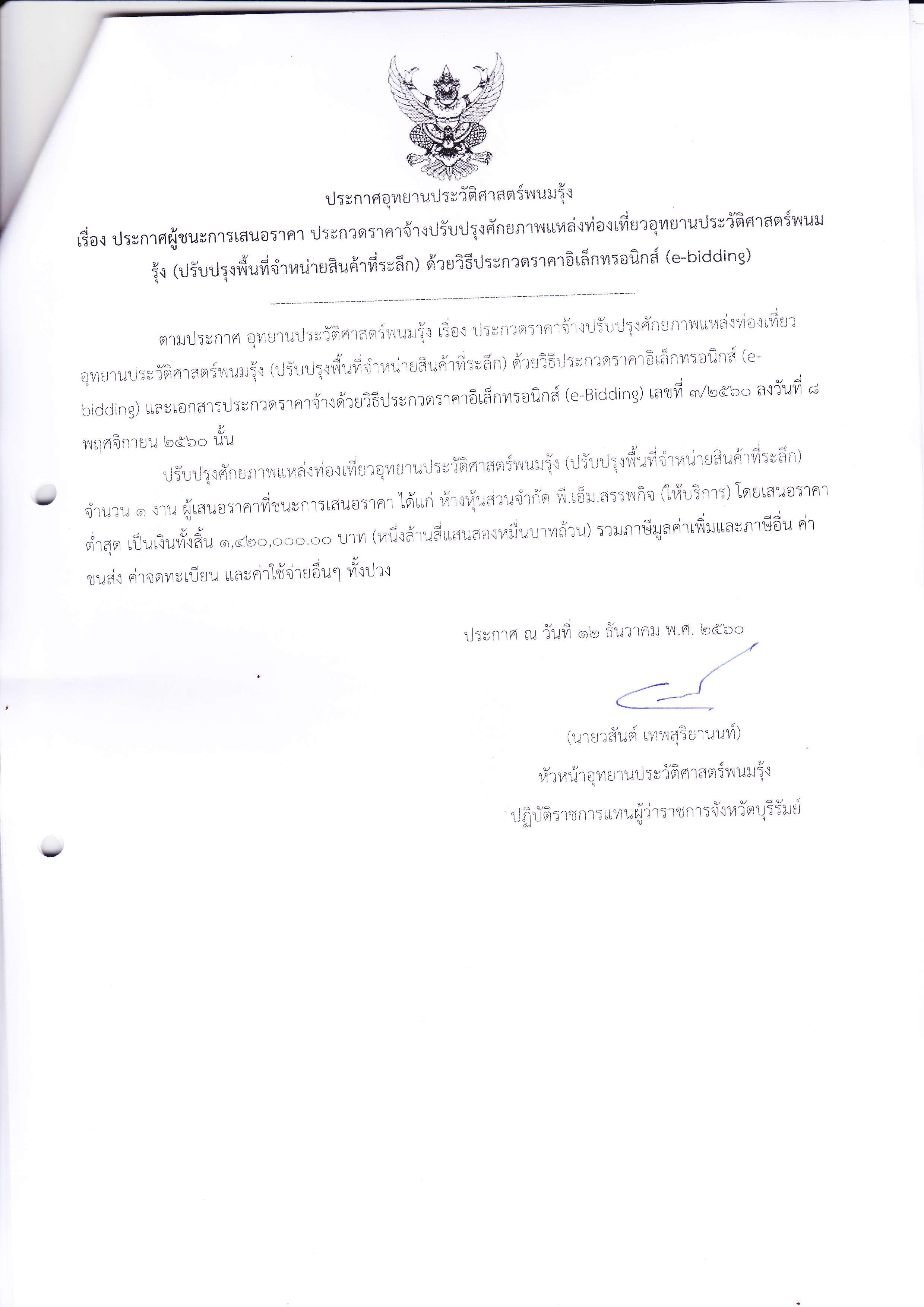 ประกาศผู้ชนะการเสนอราคา ประกวดราคาจ้างปรับปรุงศักยภาพแหล่งท่องเที่ยวอุทยานประวัติศาสตร์พนมรุ้ง (ปรับปรุงพื้นที่จำหน่ายสินค้าที่ระลึก) ด้วยวิธีประกวดราคาอิเล็กทรอนิกส์ (e-bidding)
