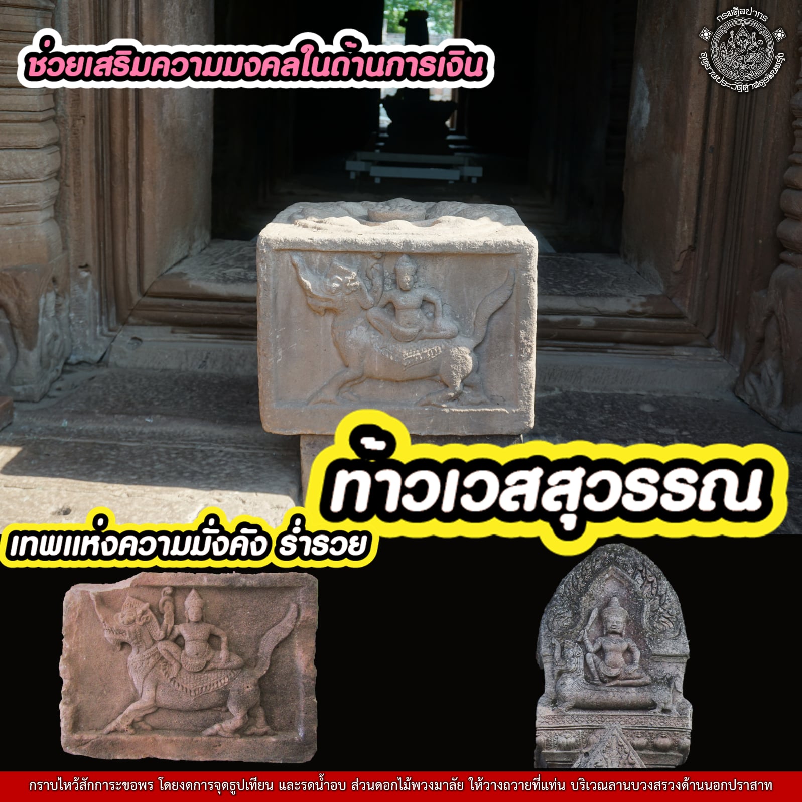 ๕. ท้าวกุเวร หรือท้าวเวสสุวรรณ เป็นแท่นหินทรายทรงลูกบาศ ตั้งอยู่ทางด้านทิศเหนือของปราสาทประธานปราสาทพนมรุ้ง (ใกล้กับท่อโสมสูตร) ตามคติในศาสนาพราหมณ์ - ฮินดู เป็นเทพประจำทิศเหนือและเทพเจ้าแห่งความมั่งคั่งร่ำรวย ดังการการขอพรสักการะกับท้าวกุเวร จึงเชื่อว่าจะช่วยเสริมความมงคลในด้านการเงิน โชคลาภ และเสริมบารมีความมั่งคั่งร่ำรวย