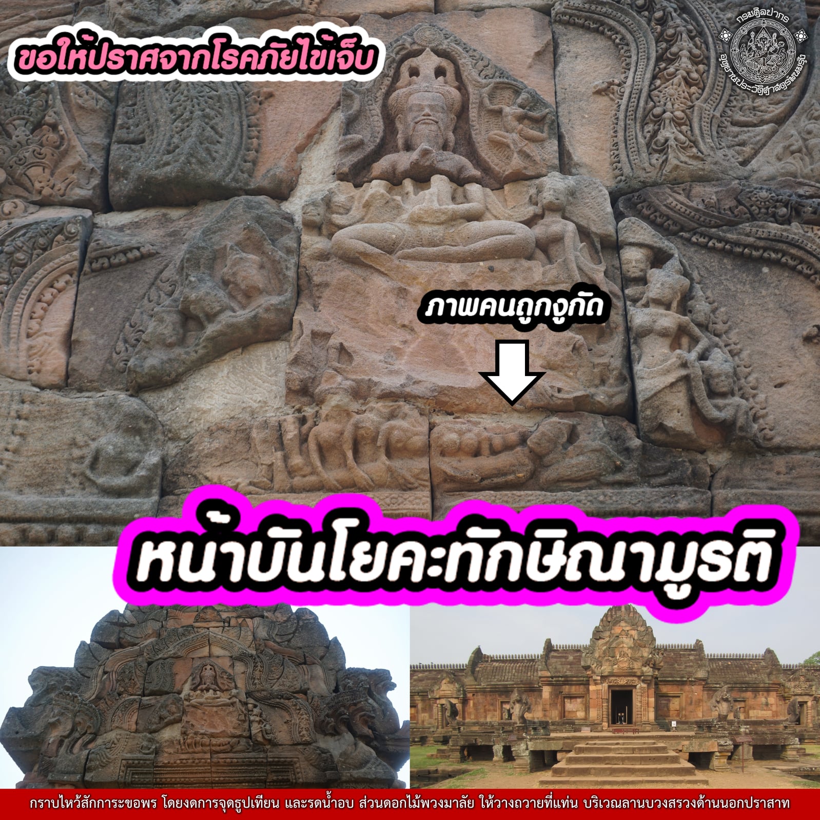 ๒. หน้าบันโยคะทักษิณามูรติ อยู่บริเวณโคปุระด้านทิศตะวันออกของปราสาทพนมรุ้ง เป็นภาพสลักพระศิวะในปางมหาโยคี หรือ ภาพสลักดังกล่าวอาจเป็นภาพสลักของนเรนทราทิตย์ ผู้สร้างปราสาทพนมรุ้ง ซึ่งออกบวชเป็นโยคีอยู่ที่ปราสาทพนมรุ้งแห่งนี้ก็เป็นได้ ด้านล่างของหน้าบัน พบการสลักภาพคนถูกงูกัด ซึ่งสอดคล้องกับเรื่องราวในจารึกพบที่ปราสาทพนมรุ้งเนื้อหากล่าวถึง นเรทราทิตย์เป็นผู้วิเศษสามารถรักษาผู้คนที่ถูกงูกัดให้ฟื้นคืนจากความตายได้ ดังนั้นการขอพรสักการะที่หน้าบันดังกล่าว จึงมีความเชื่อว่าช่วยรักษาความเจ็บป่วย หรือโรคภัยไข้เจ็บต่าง ๆ ได้