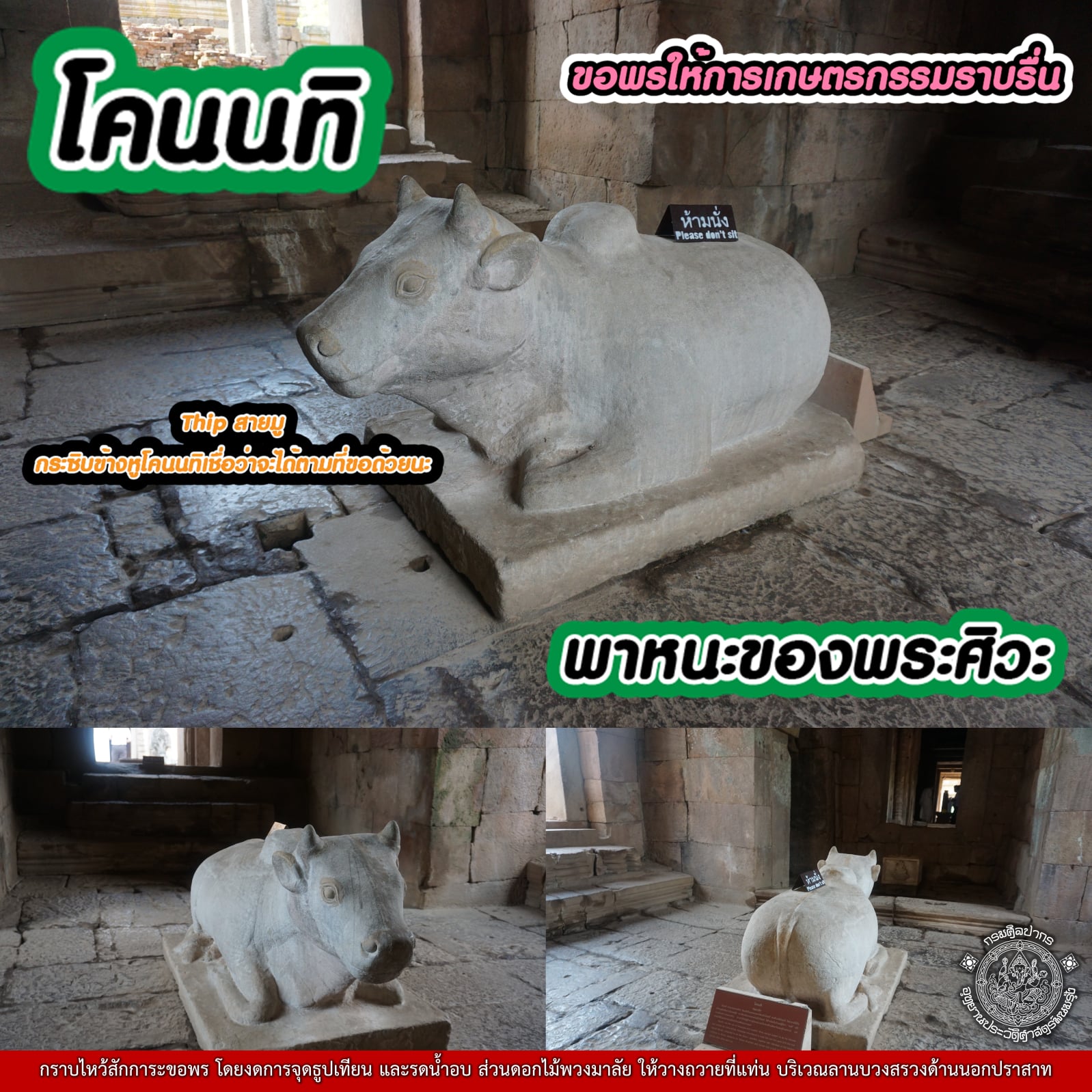 ๔. ประติมากรรมโคนนทิ ตั้งอยู่ภายในมณฑปทิศตะวันออกของปราสาทประธาน โคนนทิเป็นพาหนะของพระศิวะ หันหน้าไปยังศิวลึงค์ซึ่งเป็นสัญลักษณ์แทนองค์พระศิวะที่ประดิษฐานเป็นประธานของเทวาลัย ในคติศาสนาพราหมณ์ฮินดู วัวถือว่าเป็นสัตว์ศักดิ์สิทธิ์เป็นเนื่องจากเป็นพาหนะของพระศิวะ หรือตัวแทนของการเกษตรกรรม ดังนั้นเชื่อว่าการขอพรกับโคนนทิ สามารถช่วยให้การเพาะปลูก การเกษตรกรรมต่าง ๆ ราบรื่นและอุดมสมบูรณ์