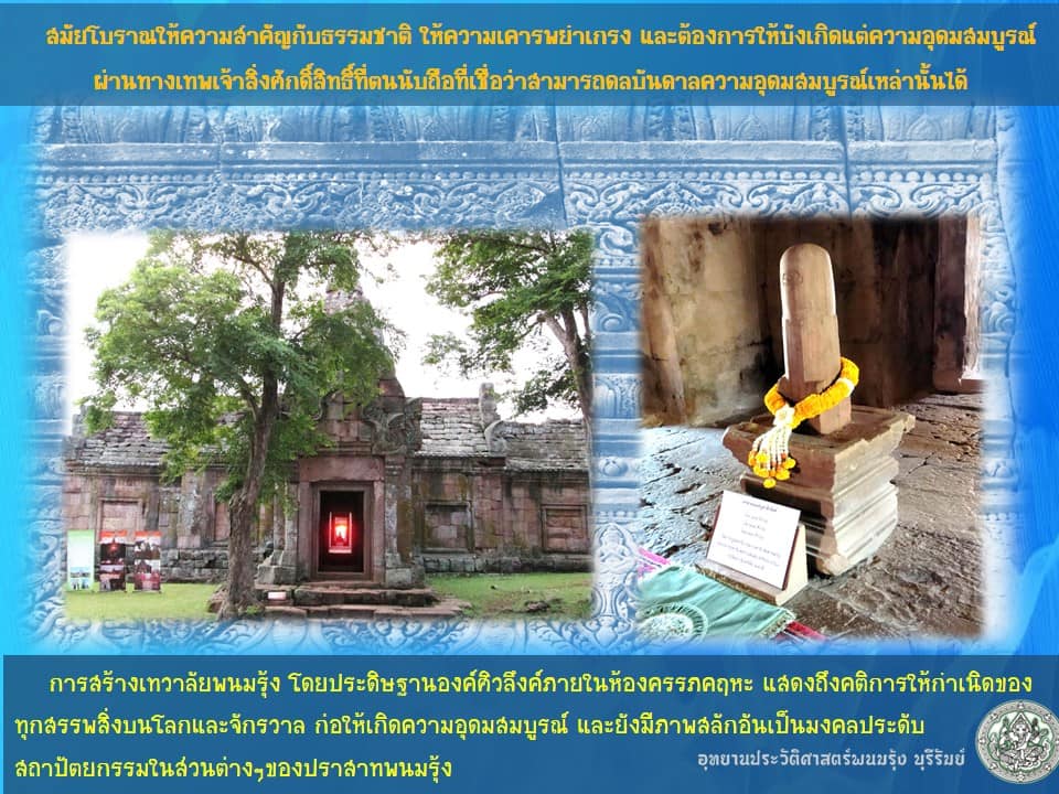 การสร้างเทวาลัยถวายองค์พระศิวะเหนือยอดเขาพนมรุ้ง โดยมีผังปราสาทประธานอยู่ใจกลางเพื่อประดิษฐานองค์ศิวลึงค์ภายในห้องครรภคฤหะ แสดงถึงคติการให้กำเนิดของทุกสรรพสิ่งบนโลกและจักรวาล ก่อให้เกิดความอุดมสมบูรณ์ และยังมีภาพสลักประดับสถาปัตยกรรม ณ ปราสาทพนมรุ้ง ตัวอย่างภาพสลักที่เสาติดผนังซุ้มประตูมณฑปปราสาทพนมรุ้งด้านทิศตะวันออก แสดงถึงพิธีกรรมอันเกี่ยวเนื่องกับการเกษตรกรรมและความอุดมสมบูรณ์ ที่เรียกว่า “พิธีปูราณะธัณยกา” ปรากฏภาพสตรีสูงศักดิ์ยืนอยู่ที่ใต้ต้นไม้ใช้มือซ้ายเหนี่ยวกิ่งไม้ มือขวายื่นไปคล้ายจะหยิบหรือหว่านธัญพืชในพานที่สาวบริวารนั่งถือถวาย มีฤาษีกำลังสวดประกอบพิธีกรรม ซึ่งคาดว่าภาพนี้อาจแสดงถึงพิธีกรรมการเพาะปลูกการทำเกษตรกรรมเพื่อให้ได้ผลผลิตที่ดี เช่นเดียวกับพิธีจรดพระนังคัลแรกนาขวัญ ในปัจจุบัน นอกจากนี้ปราสาทพนมรุ้งยังพบประติมากรรมรูป พระวรุณ เทพเจ้าแห่งสายฝน เทพผู้รักษาทิศตะวันตก สลักอยู่ที่บรรพแถลงประดับชั้นเรือนยอดปราสาทพนมรุ้งและที่แท่นลูกบาศก์หินทราย ที่หน้าบันชั้นลดปราสาทประธานพนมรุ้งยังพบภาพสลักพิธีกรรมมีบุคคลเทินหม้อน้ำมงคลหรือที่เรียกว่ากลศ เป็นหม้อใส่น้ำศักดิ์สิทธิ์ ลักษณะคล้ายแจกันใส่น้ำและดอกบัว สัญลักษณ์ของความเจริญงอกงามและความเป็นอมตะด้วย ส่วนภาพสลักที่เป็นสัญลักษณ์ความอุดมสมบูรณ์ ที่สำคัญอีกประการ คือ ภาพสลักดอกบัวแปดกลีบ ซึ่งเป็นที่นิยมอย่างมาก ยังแสดงถึงมีความบริสุทธิ์หลุดพ้น นอกจากนี้ยังเป็นสัญลักษณ์แผนผังศูนย์กลางจักรวาล โดยมีกลีบบัวแปดกลีบเปรียบดั่งทิศทั้งแปดล้อมรอบเขาพระสุเมรุนั่นเอง ที่ปราสาทพนมรุ้งพบทั้งแผ่นทองคำสลักลายดอกบัวแปดกลีบ ภาพสลักใจกลางสะพานนาคราช และภาพสลักนูนต่ำบนแท่นลูกบาศก์หินทรายเทพประจำทิศ ซึ่งลายดอกบัวเหล่านี้เป็นกลีบดอกบัวหลวงมีฝักเกสรอยู่กึ่งกลางดอก นอกจากนี้ยังพบภาพสลักดอกบัวขาบและบัวกุมุท ซึ่งเป็นพันธ์บัวสายชนิดหนึ่ง และลายดอกไม้พันธุ์พฤกษาต่างๆ สลักเป็นลายประดับที่ปราสาทประธานพนมรุ้งด้วย