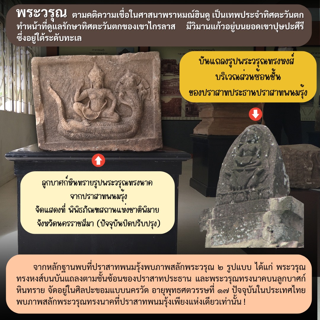 จากหลักฐานพบที่ปราสาทพนมรุ้ง พบการสลักภาพ “พระวรุณทรงนาค” บนลูกบาศก์หินทราย และ “พระวรุณทรงหงส์” บนบันแถลงซึ่งเป็นส่วนประดับบนส่วนเรือนยอดของปราสาทประธานด้านทิศตะวันตก จำนวน ๔ ภาพลดหลั่นขึ้นไปตามลำดับชั้น โดยจัดอยู่ในศิลปะขอมแบบนครวัด พุทธศตวรรษที่ ๑๗ เป็นที่น่าสนใจว่าปราสาทหินในวัฒนธรรมขอมโบราณภาพสลักพระวรุณทรงนาคนั้นพบที่ปราสาทพนมรุ้งเพียงแห่งเดียวเท่านั้น