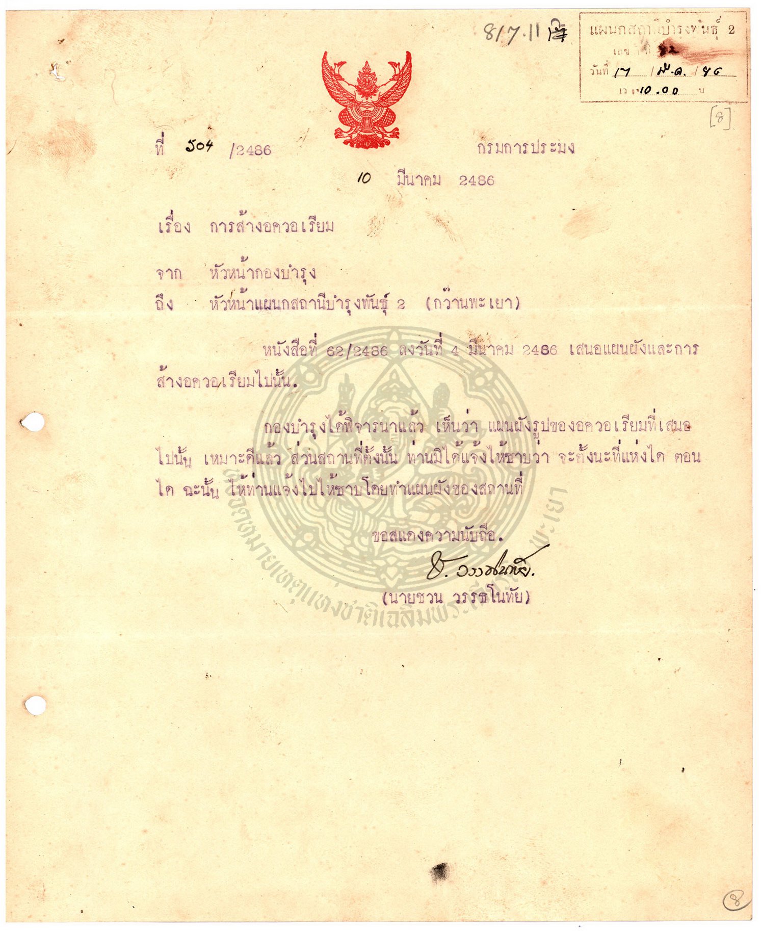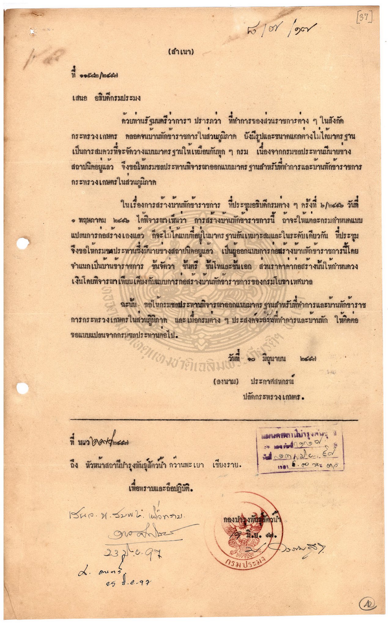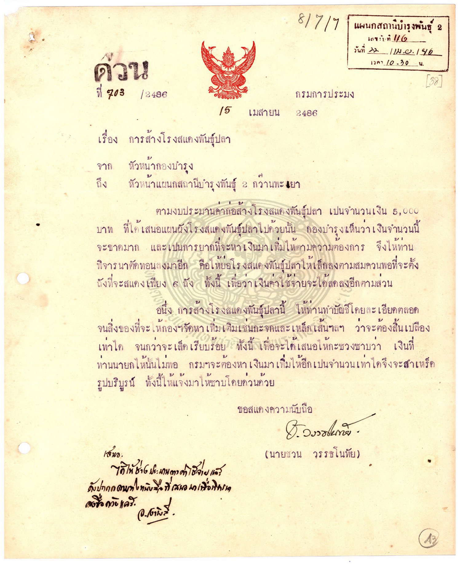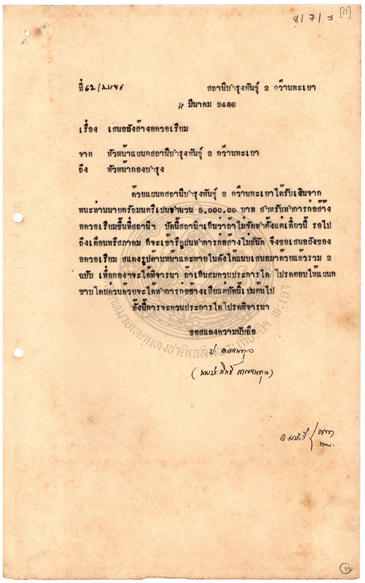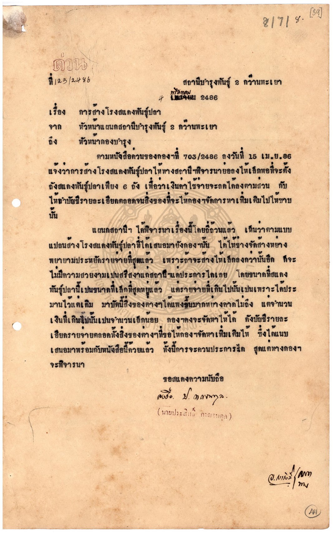 เอกสารอ้างอิง : หจช.พย. เอกสารสถานีประมงน้ำจืดจังหวัดพะเยา กระทรวงเกษตรและสหกรณ์ (2) กษ 1.1.1.1.3 / 1 เรื่องการปลูกบ้านพักและซ่อมแซมภายในสถานีประมงน้ำจืดจังหวัดพะเยา ( 29 ก.ย. 2482 - 20 ก.ค. 2503 )
