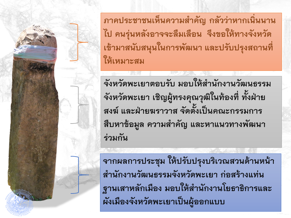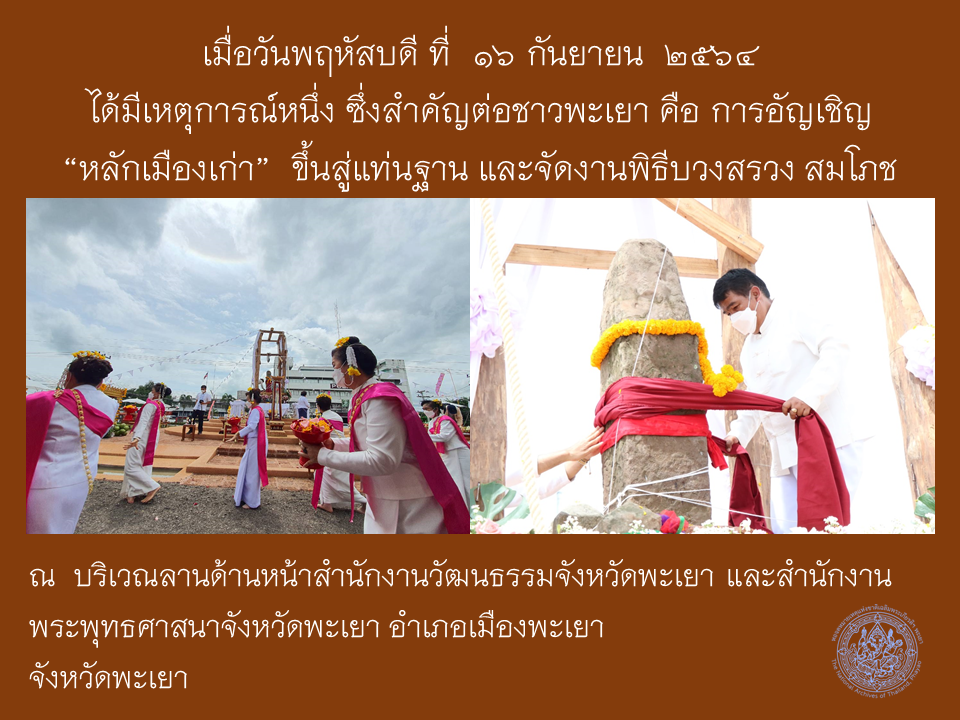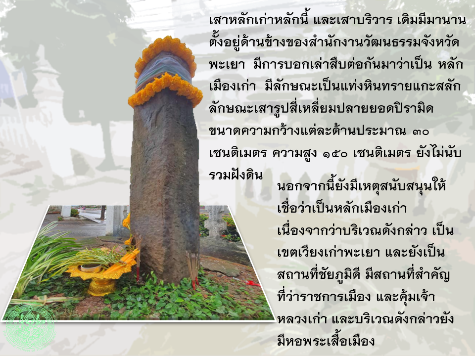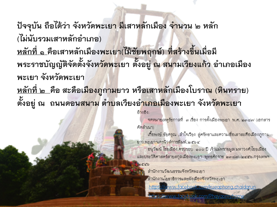ต่อเนื่องจากอาทิตย์ก่อนที่ลงเรื่อง เสาหลักเมืองจังหวัดพะเยาที่สร้างมาจากไม้มงคล เพื่อเป็นเสาหลักของเมือง โดยเป็นเสาหลักเมืองที่ดำริสร้างขึ้นเมื่อมีพระราชบัญญัติจัดตั้งจังหวัดพะเยา แต่ในที่นี้จะกล่าวถึงเสาหลักเมืองอีกหนึ่งหลักของจังหวัดพะเยา ที่สร้างมาจากหินทราย กล่าวว่ามีประวัติความเป็นมายาวนาน จากการสันนิษฐานและการสืบค้นข้อมูลของนักวิชาการ นักประวัติศาสตร์ท้องถิ่นของจังหวัดพะเยา