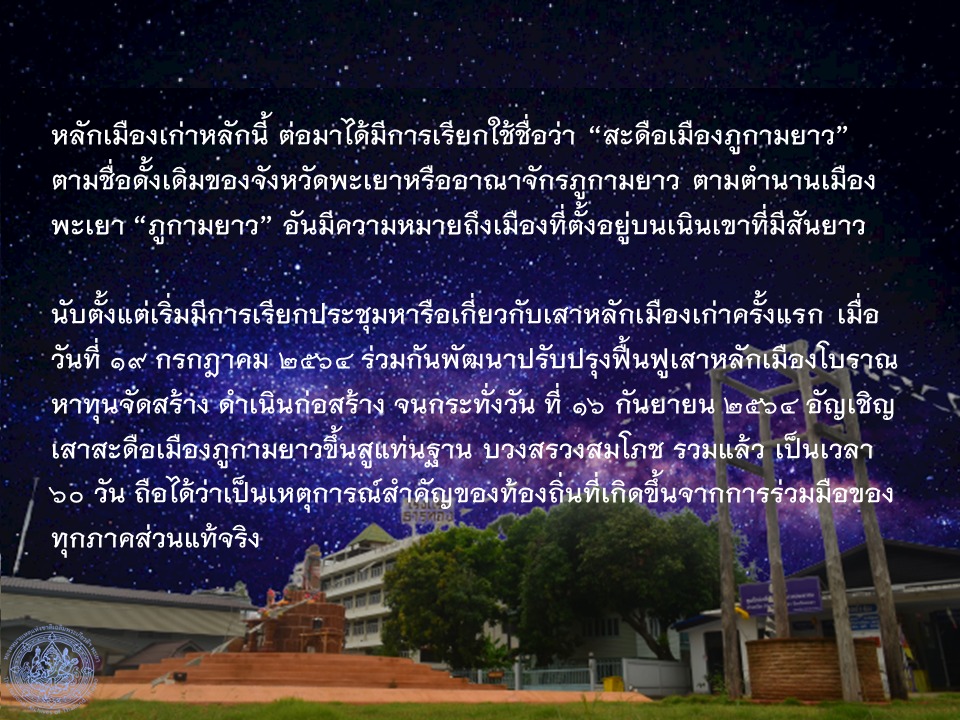 ในวันที่ ๑๖ กันยายน ๒๕๖๕ ที่จะถึงนี้ ถือเป็นการครบรอบ ๑ ปี ของการอัญเชิญเสาหลักเมืองโบราณนี้ หรือที่เรียกกันว่าสะดือเมืองภูกามยาวขึ้นสู่แท่นฐานและจัดพิธีบวงสรวงสมโภช ซึ่งถือเป็นหนึ่งเหตุการณ์สำคัญของจังหวัดพะเยา