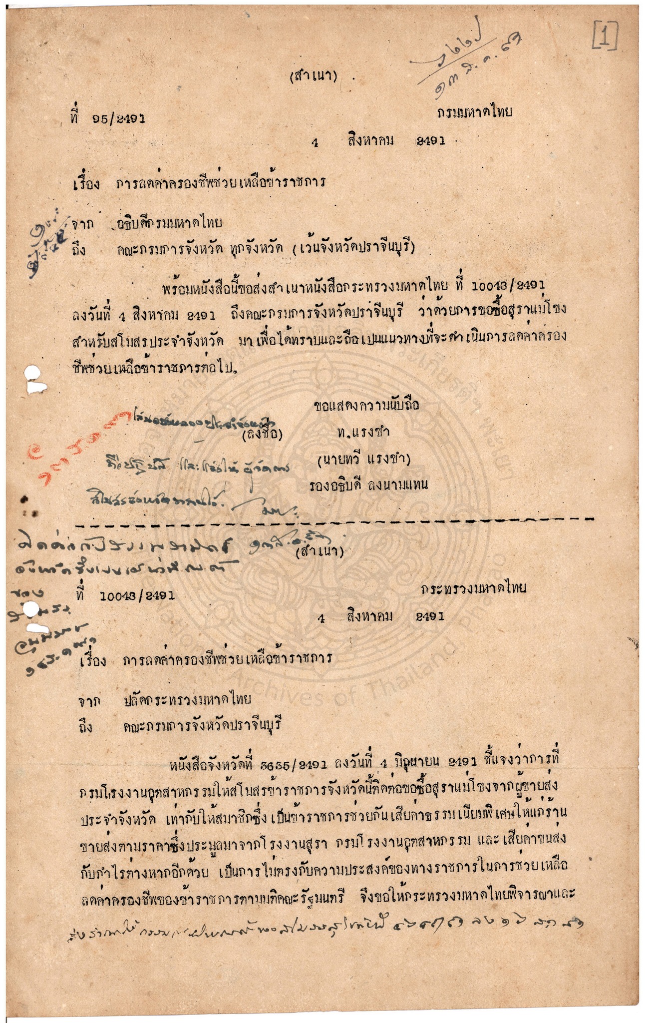 หอจดหมายเหตุแห่งชาติเฉลิมพระเกียรติฯ พะเยา. สท 1.2.2/26 เอกสารสำนักงานปกครองจังหวัดสุโขทัย เรื่อง การลดค่าครองชีพช่วยเหลือข้าราชการ [ 4 ส.ค. 2491 ].