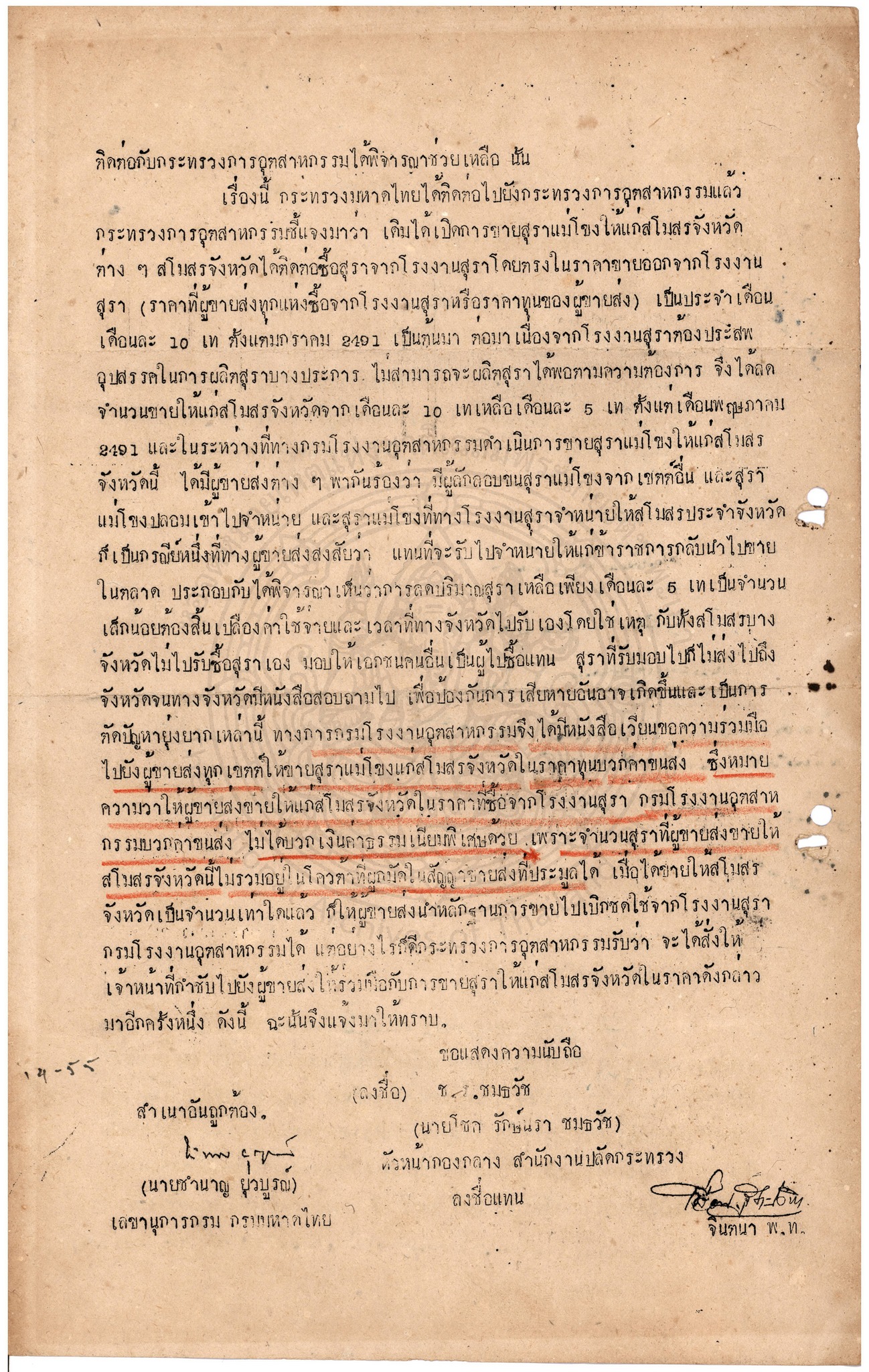 กระทรวงอุตสาหกรรมชี้แจงว่า โรงงานสุราเกิดอุปสรรคบางประการ ไม่สามารถผลิตส่งได้ตามความต้องการดังเดิม จึงลดจำนวนการขายให้สโมสรประจำจังหวัดก่อน กอปรกับมีผู้ลักลอบขนสุราจากที่อื่นและสุราปลอมไปขาย ดังนั้น จึงขอแก้ไขปัญหาโดยให้ผู้ขายส่งทุกพื้นที่ขายสุราแก่สโมสรประจำจังหวัดในราคาทุน บวกค่าขนส่ง ไม่ต้องจ่ายค่าธรรมเนียมพิเศษอีกต่อไป