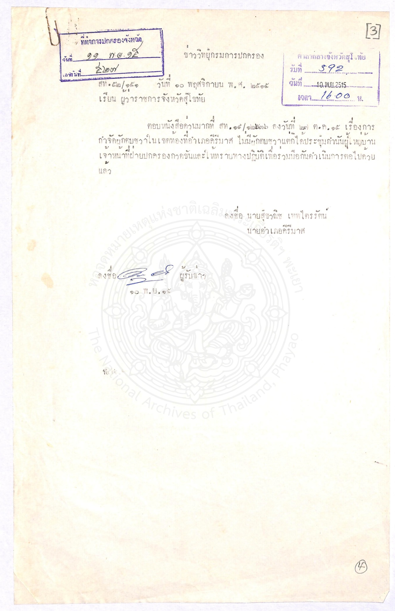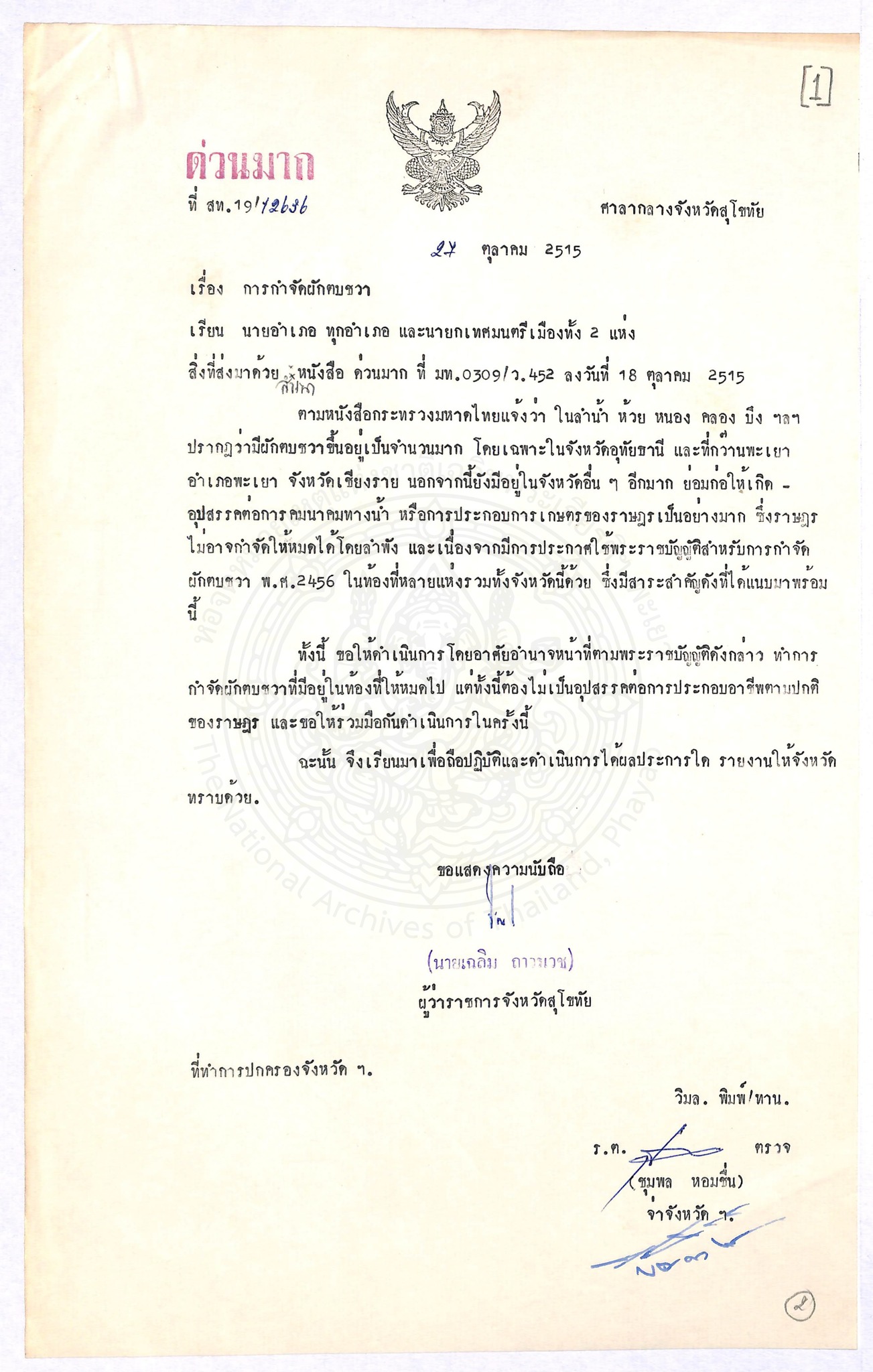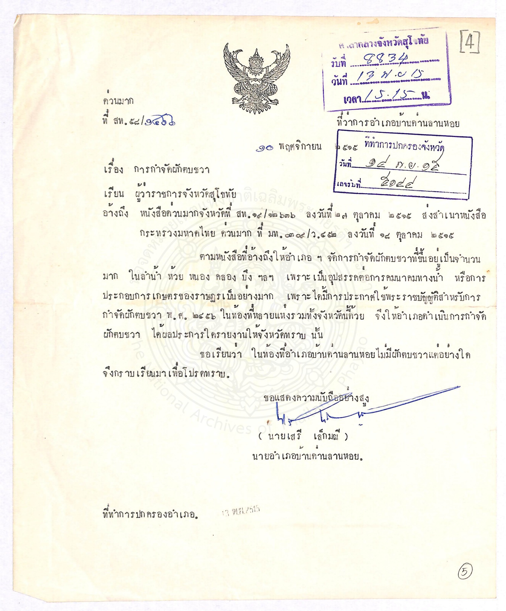 หอจดหมายเหตุแห่งชาติเฉลิมพระเกียรติฯ พะเยา. เอกสารสำนักงานปกครองจังหวัดสุโขทัย สท 1.2.1/85 เรื่อง การกำจัดผักตบชวา [ 18 ต.ค. - 21 พ.ย. 2515 ].