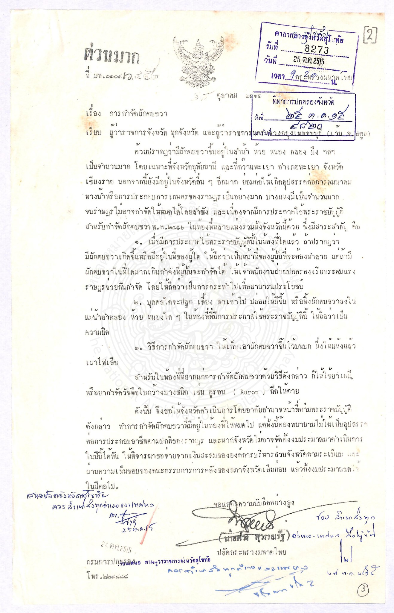 ปี 2515 กระทรวงมหาดไทยมีหนังสือราชการแจ้งเวียนถึงผู้ว่าราชการทุกจังหวัดให้ใช้พระราชบัญญัติสำหรับกำจัดผักตบชวา พ.ศ. 2456 กำจัดให้หมดสิ้นทั้งประเทศ โดยระบุสาระสำคัญตอนหนึ่งว่า " หากผักตบชวามีขึ้นในที่ของผู้ใด ให้ถือว่าเป็นหน้าที่ของผู้นั้นต้องทำลาย " อีกทั้ง " บุคคลใดปลูกเลี้ยง ปล่อยให้มีขึ้น หรือทิ้งลงแม่น้ำ ห้วย หนอง คลอง บึง มีความผิด " ส่วนวิธีการกำจัดนั้น " ให้เอาขึ้นบกตากแห้งแล้วเผาไฟ หรือใช้ยากำจัดศัตรูพืชฉีดพ่นให้ตาย "