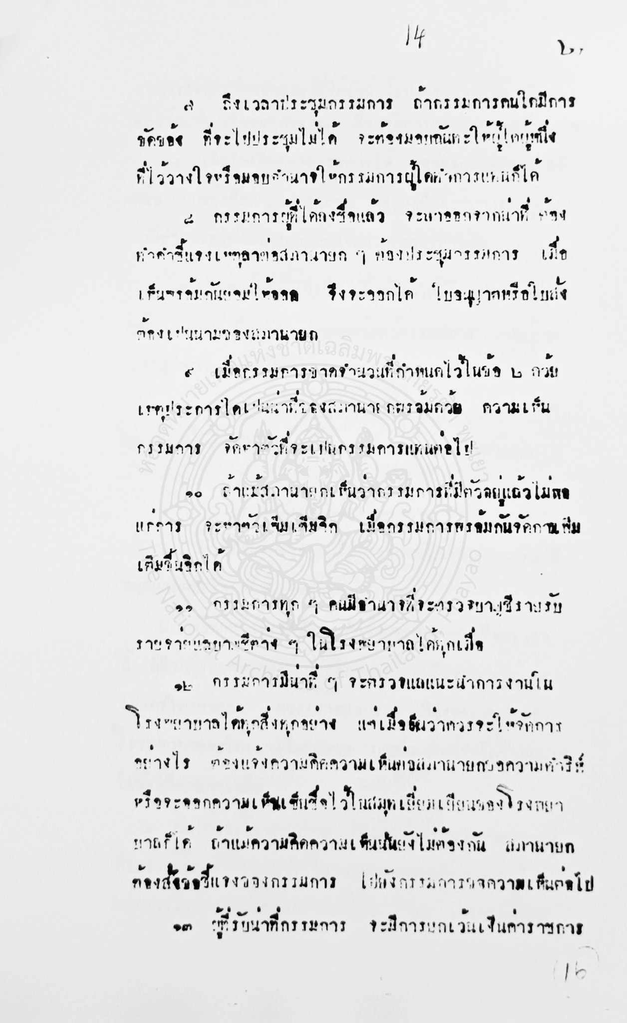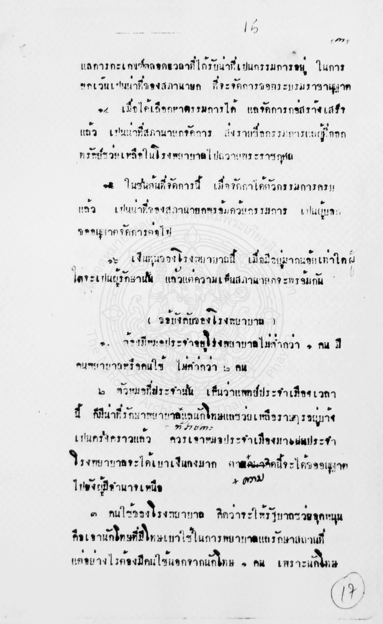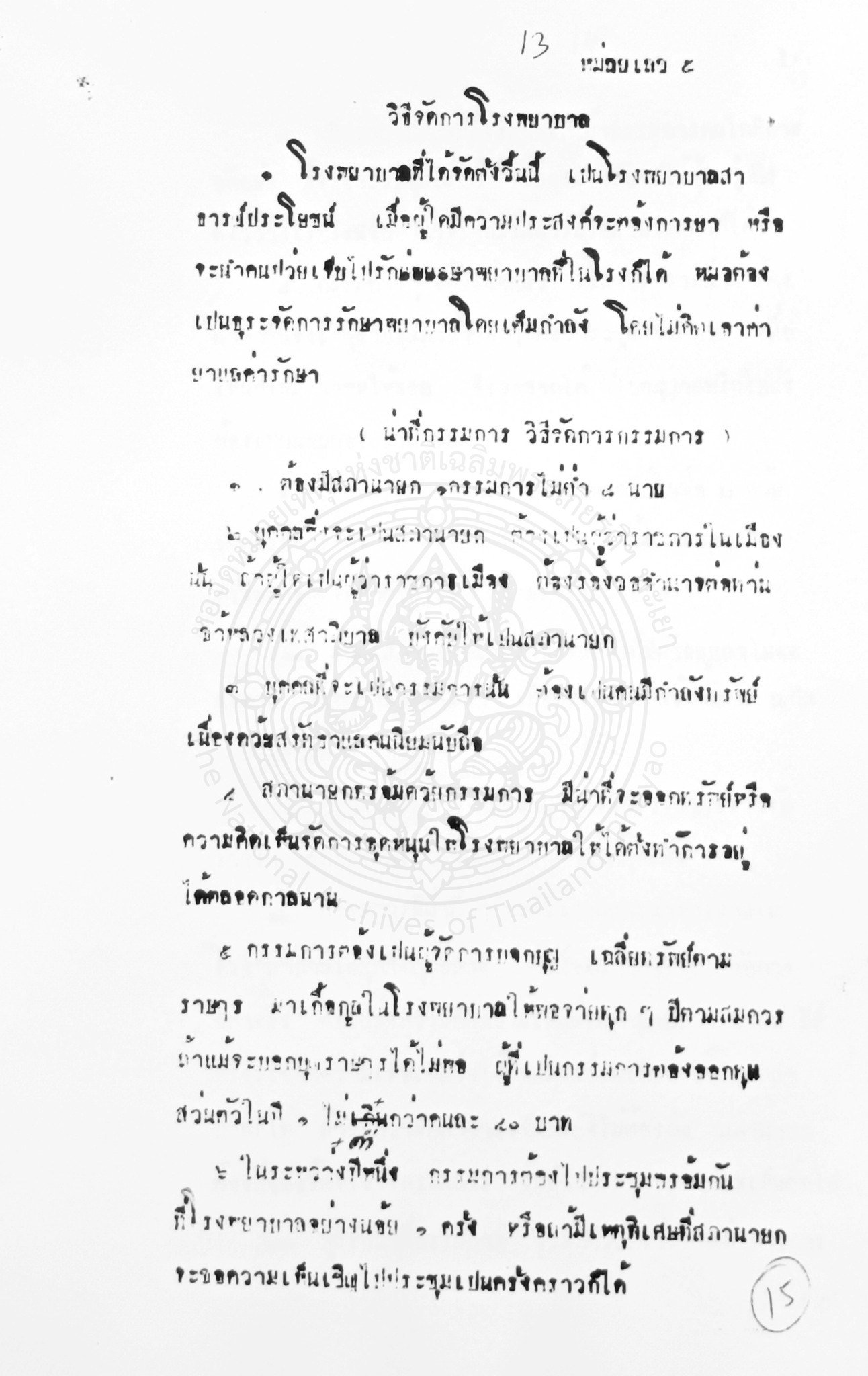 1. หน้าที่กรรมการและวิธีจัดการกรรมการ กำหนดให้มีสภานายก 1 คน และกรรมการไม่ต่ำกว่า 8 คน ผู้ที่เป็นสภานายกจะต้องเป็นผู้ว่าราชการเมืองโดยตำแหน่ง ส่วนคนที่เป็นกรรมการต้องเป็นผู้มีกำลังทรัพย์เพราะจะมีคนนิยมนับถือ กรรมการมีหน้าที่หลักคือต้องตรวจและแนะนำการงานทุกอย่างของโรงพยาบาล มีอำนาจตรวจสอบบัญชีรายรับรายจ่ายของโรงพยาบาล รวมทั้งเป็นผู้บอกบุญขอรับบริจาคจากราษฎรเพื่ออุดหนุนโรงพยาบาล หากทุนทรัพย์ไม่พอกรรมการต้องออกทุนส่วนตัวคนละไม่ต่ำกว่า 40 บาทต่อปี
