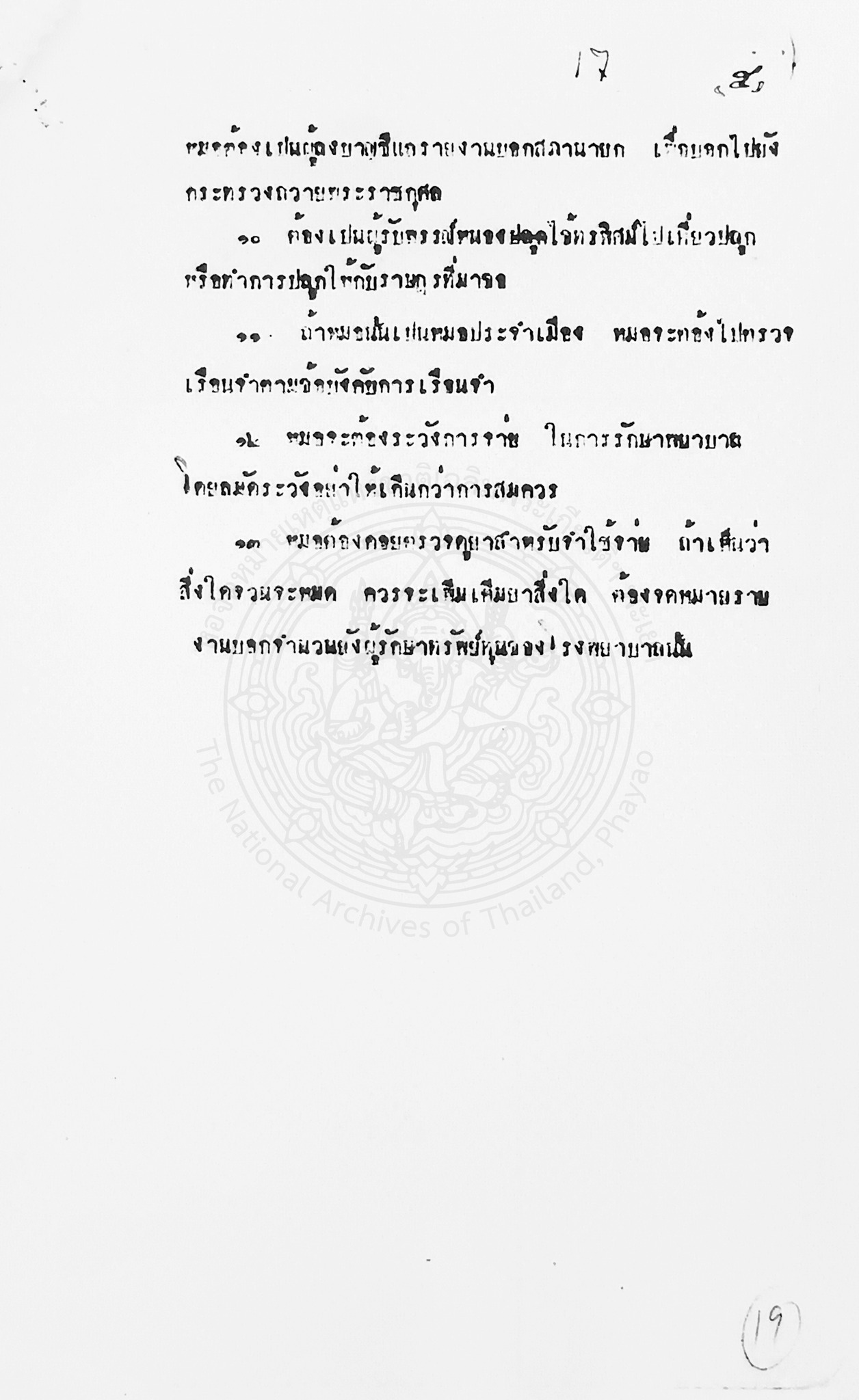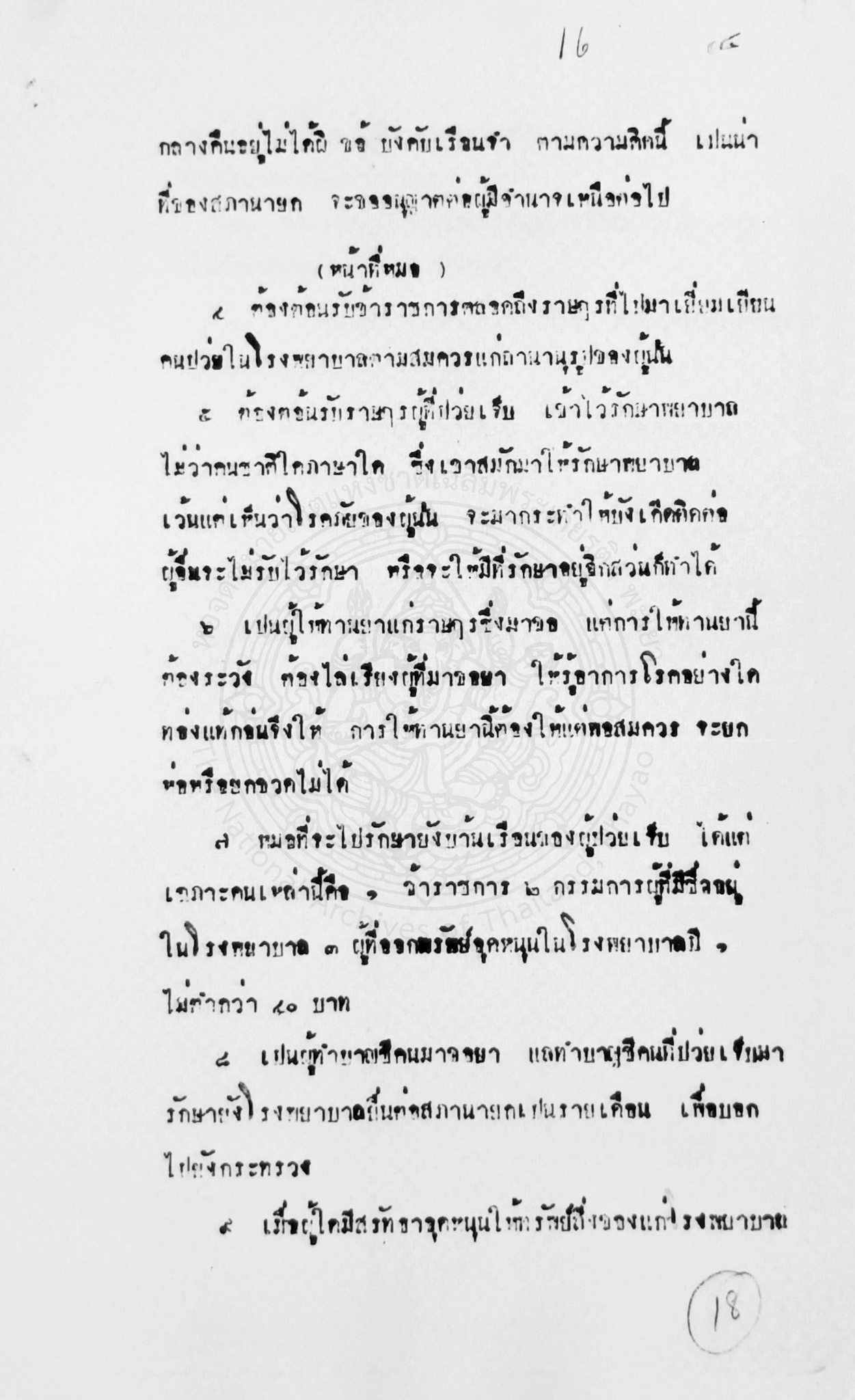 3. หน้าที่หมอ หมอในโรงพยาบาลแห่งนี้ต้องทำหน้าที่หลายๆ อย่างที่เกี่ยวข้องกับงานสาธารณสุข เช่น ต้องรักษาพยาบาลราษฎรโดยไม่เลือกชาติและภาษา ต้องพิจารณาจัดยาให้แก่ราษฎรตามอาการในปริมาณที่เหมาะสม ต้องปลูกฝีไข้ทรพิษให้กับราษฎร ถ้าเป็นหมอประจำเมืองก็ต้องไปตรวจรักษาในเรือนจำตามข้อบังคับด้วย เป็นต้น