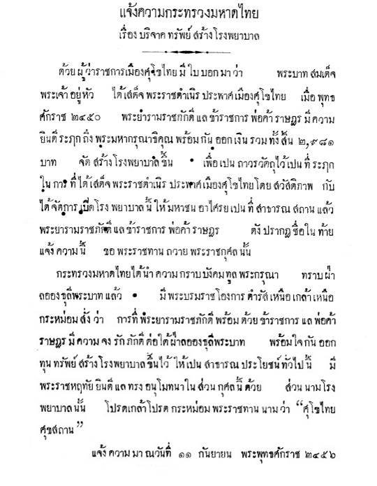 ปีพุทธศักราช 2455 มีการจัดตั้งโรงพยาบาลแห่งใหม่ขึ้นที่จังหวัดสุโขทัย เรื่องราวเกี่ยวกับการจัดตั้งโรงพยาบาลแห่งนี้มีหลักฐานปรากฏอยู่ในเอกสารจดหมายเหตุชุดกรมราชเลขาธิการ รัชกาลที่ 6 กระทรวงมหาดไทย โดยนอกจากจะกล่าวถึงมูลเหตุของการจัดตั้ง การบริจาคทรัพย์ของผู้มีจิตศรัทธา และการก่อสร้างอาคารโรงพยาบาลแล้ว ในเอกสารจดหมายเหตุชุดนี้กล่าวถึงวิธีการจัดการโรงพยาบาลที่ตั้งขึ้นใหม่ ทั้งในเรื่องการบริหาร ข้อบังคับ และหน้าที่ของแพทย์ประจำโรงพยาบาล ซึ่งน่าสนใจว่า คนเมื่อร้อยกว่าปีก่อนมีแนวคิดในการจัดการโรงพยาบาลที่ตั้งขึ้นใหม่อย่างไร