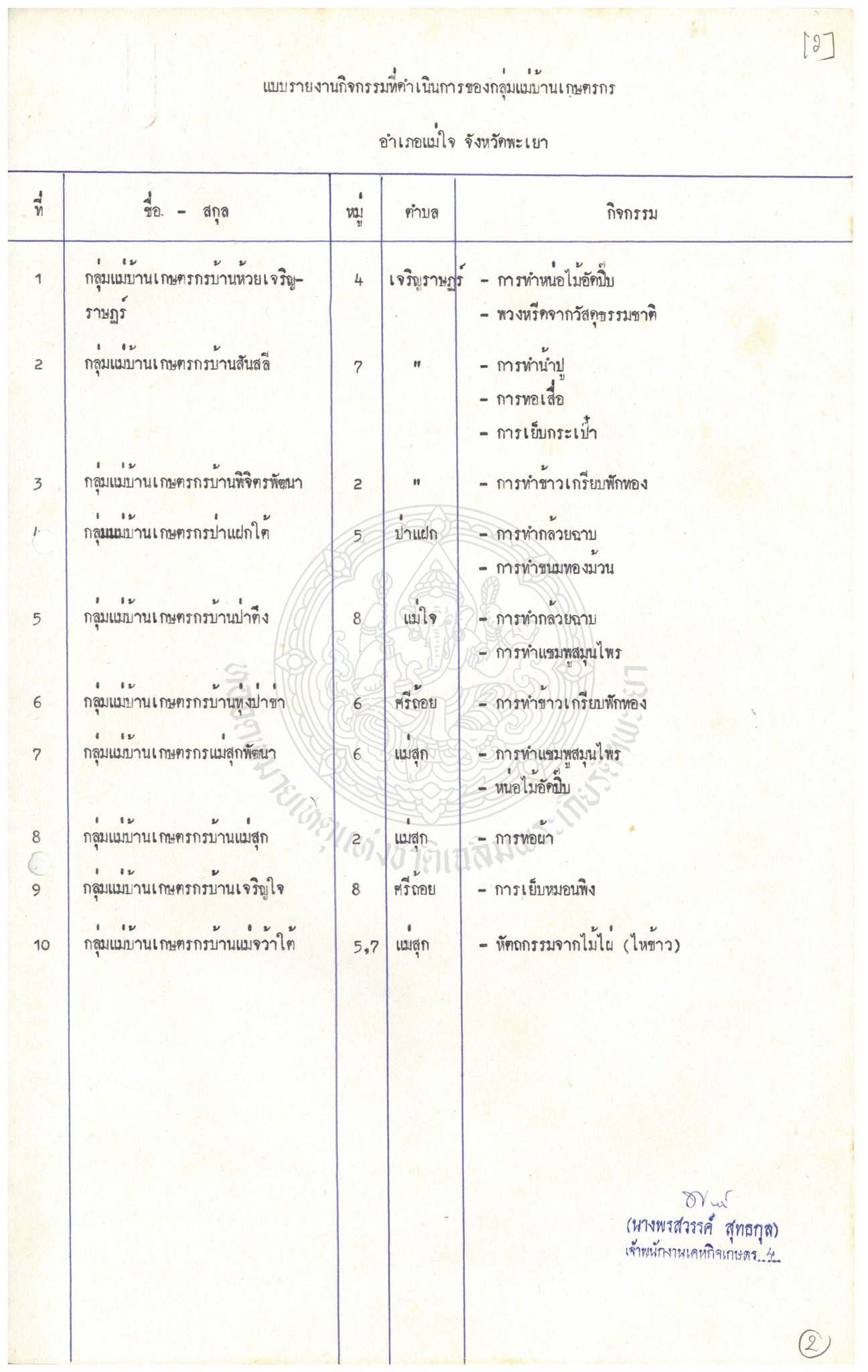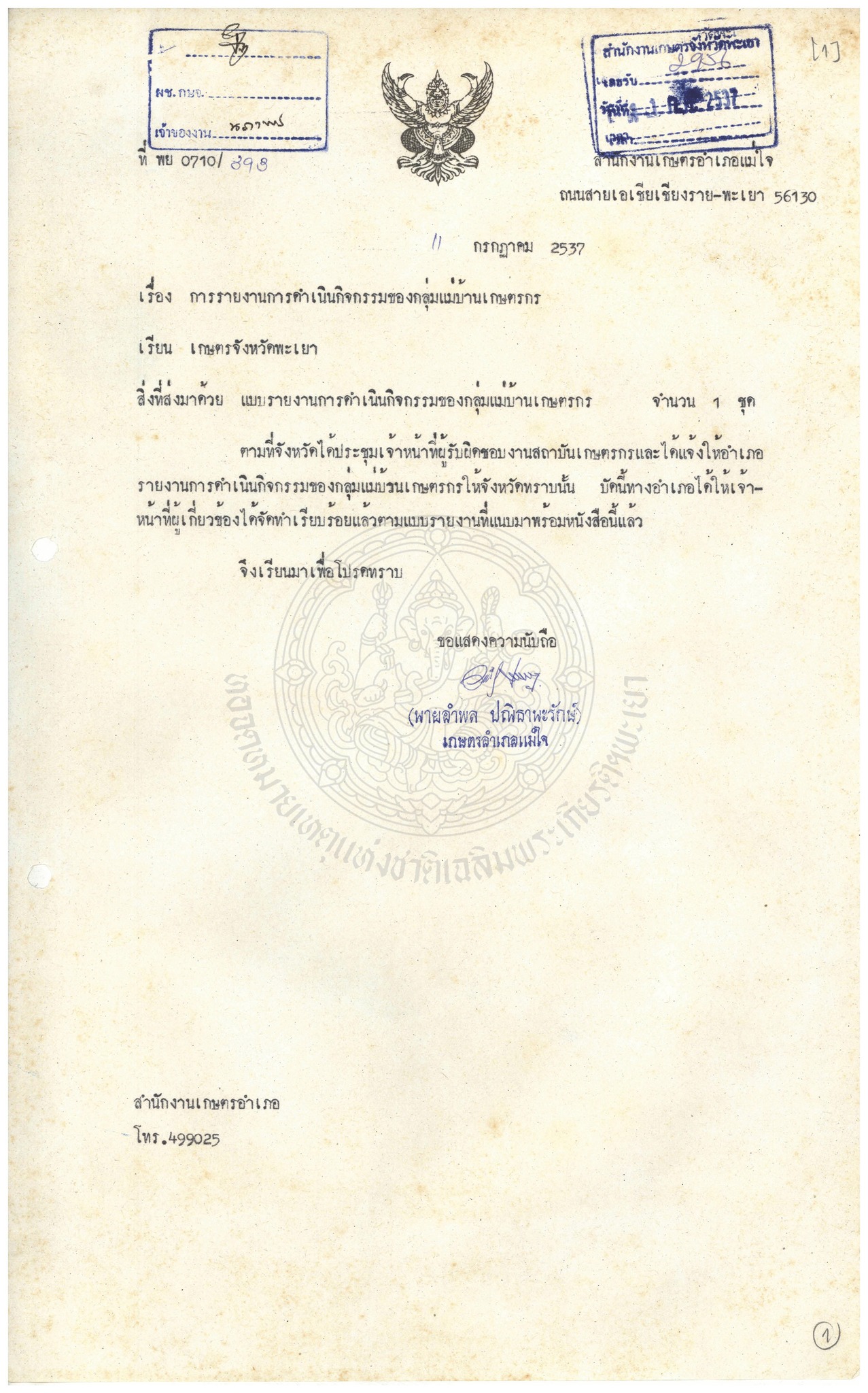 หอจดหมายเหตุแห่งชาติเฉลิมพระเกียรติฯ พะเยา. เอกสารสำนักงานเกษตรจังหวัดพะเยา พย 1.13.1/40 เรื่อง รายงานการดำเนินกิจกรรมของกลุ่มแม่บ้านเกษตรกรของอำเภอแม่ใจ [ 11 ก.ค. 2537 ].