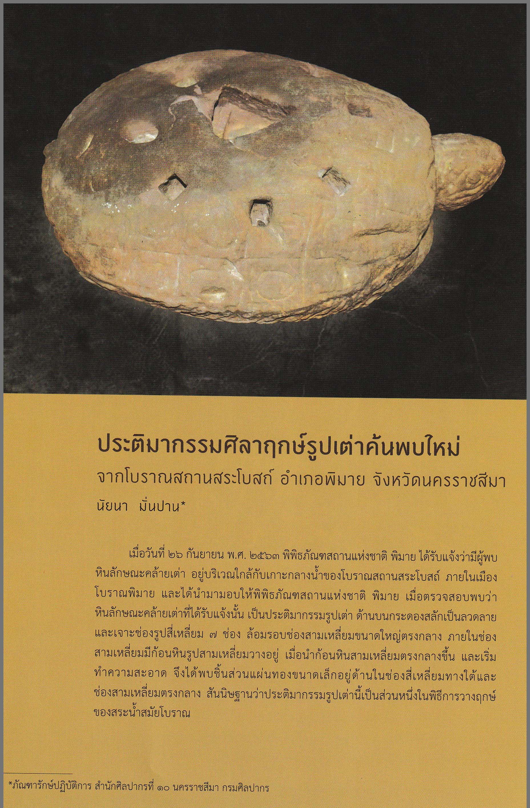 บทความเต่าศิลาฤกษ์ พบใหม่ จากโบราณสถานสระโบสถ์ อำเภอพิมาย จังหวัดนครราชสีมา (นิตยสารศิลปากร)