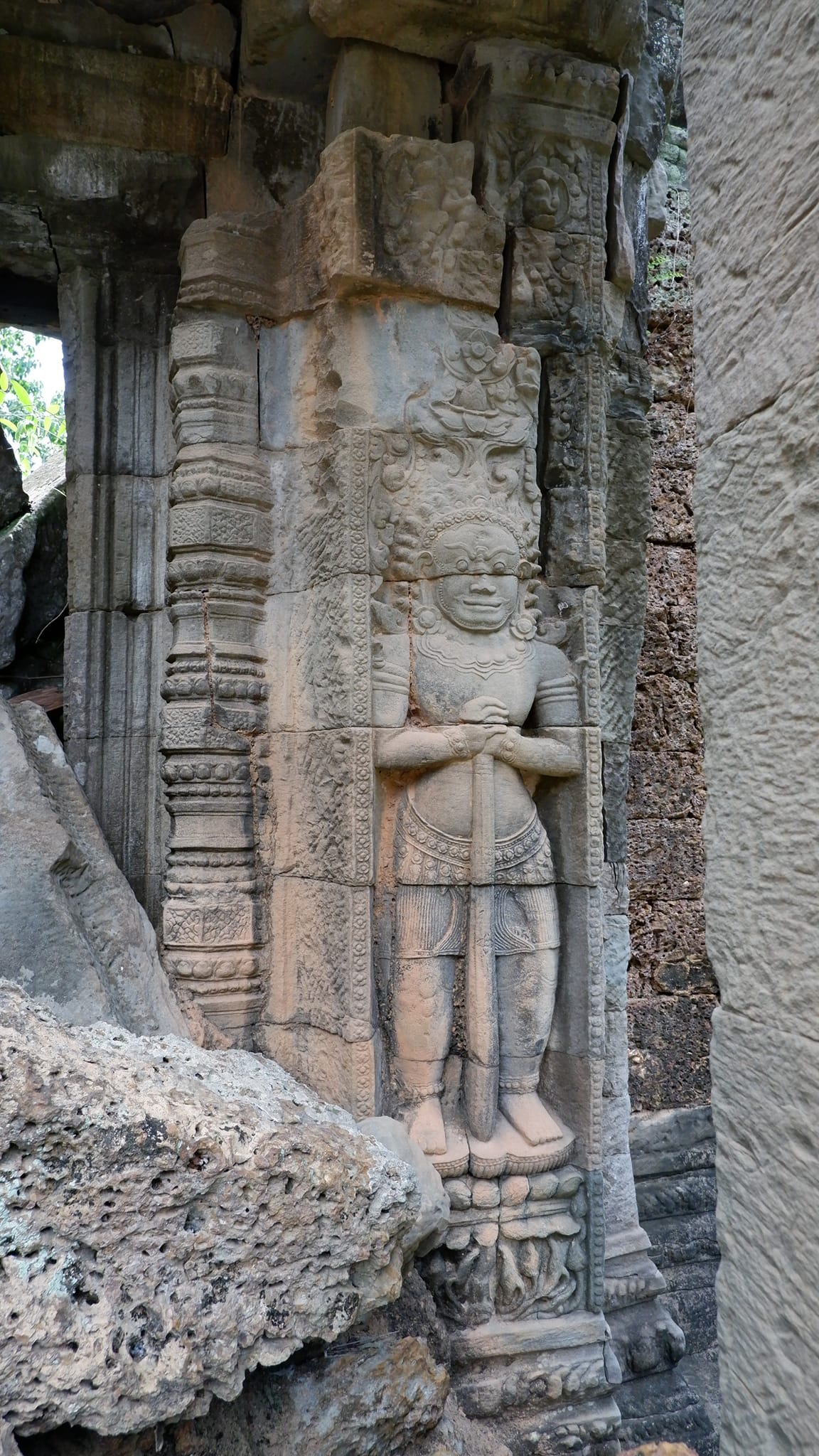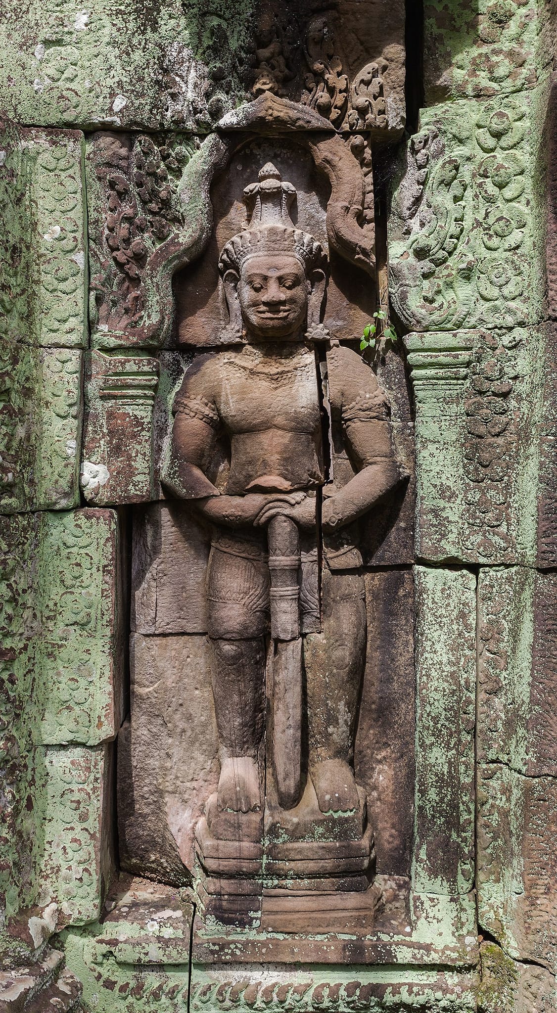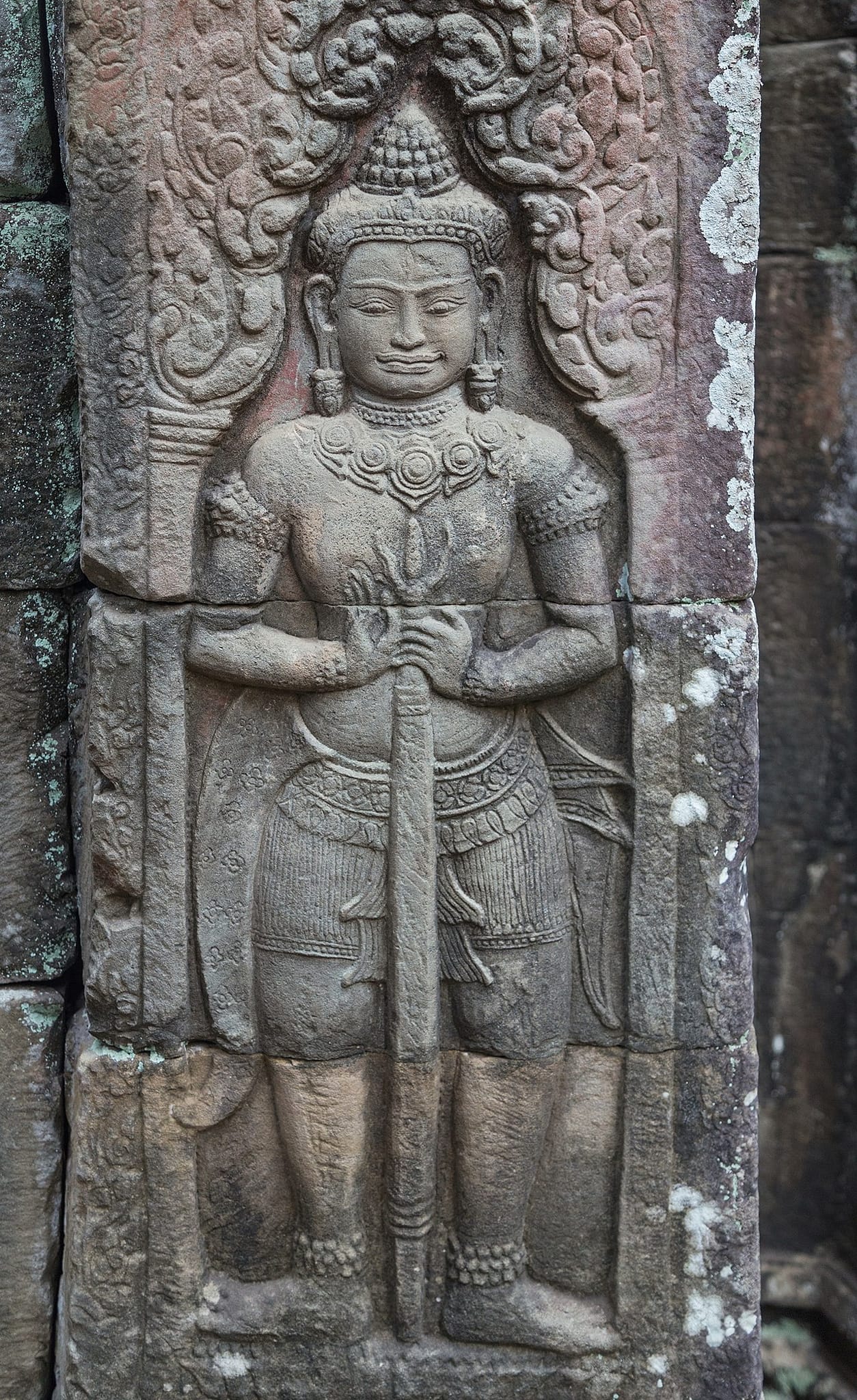 ยืนถืออาวุธคือตรีศูลย์ สันนิษฐานว่าเป็นทวารบาลที่คอยดูแลรักษาศาสนสถาน