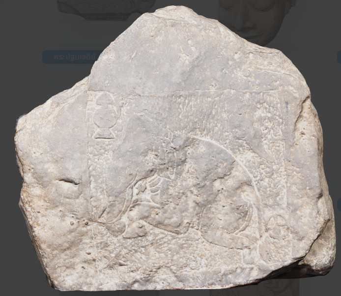 พบที่วัดพระงาม อำเภอเมืองนครปฐม จังหวัดนครปฐม แผ่นหินจำหลักลายนูนต่ำในกรอบสี่เหลี่ยมเป็นรูปช้างหมอบหันหน้าไปทางขวาของภาพ โดยที่มุมทั้ง ๔ มีรูปสิ่งของมงคล ได้แก่ หม้อปูรณฆฏะ สังข์ จักร และดาว ๕ แฉก โดยแผ่นหินจำหลักรูปช้าง อาจเป้นภาพช้างแก้วหนึ่งในแก้ว ๗ ประการของพระเจ้าจักรพรรดิในคัมภีร์พระพุทธศาสนา ได้แก่ช้างแก้ว จักรแก้ว ม้าแก้ว แก้วมณี นางแก้ว ขุนคลังแก้ว และขุนพลแก้ว