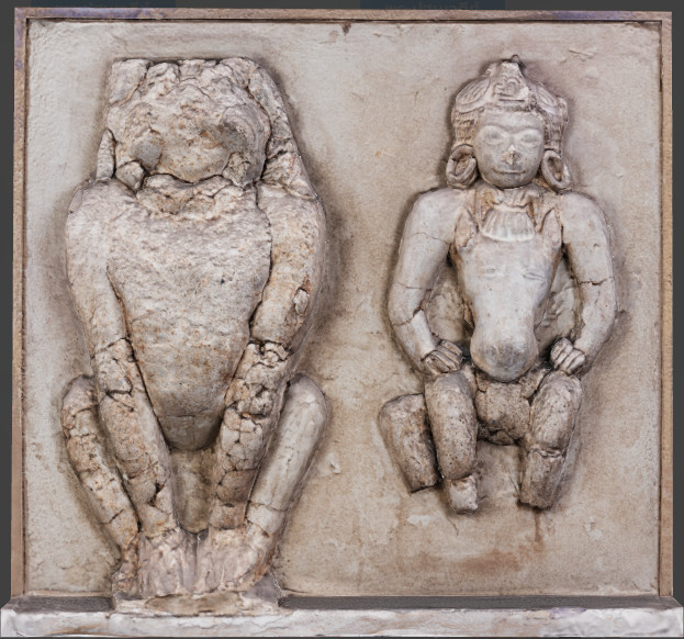 ภาพปูนปั้นรูปบุรุษขี่ม้า (อัศวิน หรือ เสด็จออกมหาภิเษกกรมณ์ ) และรูปสิงห์