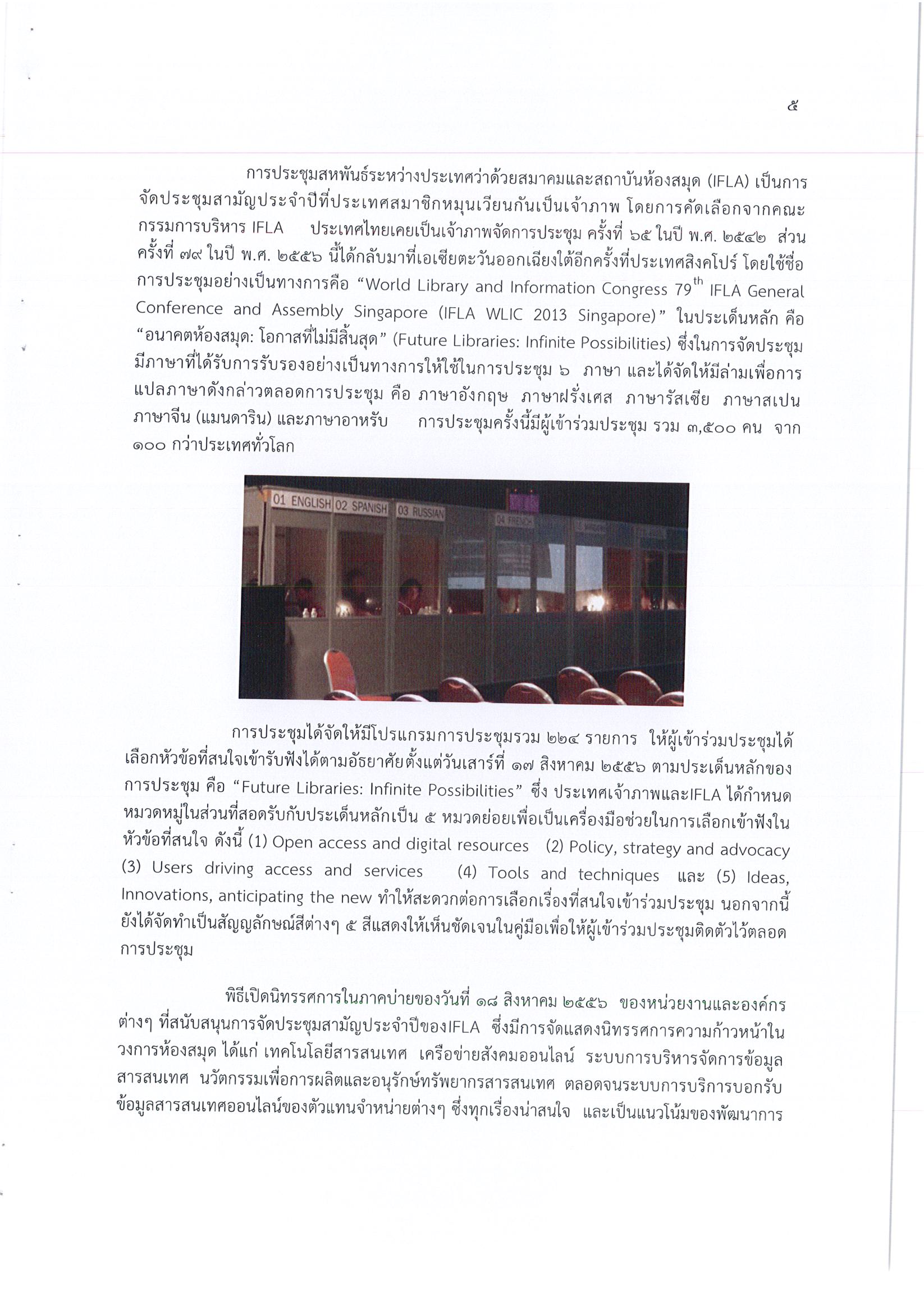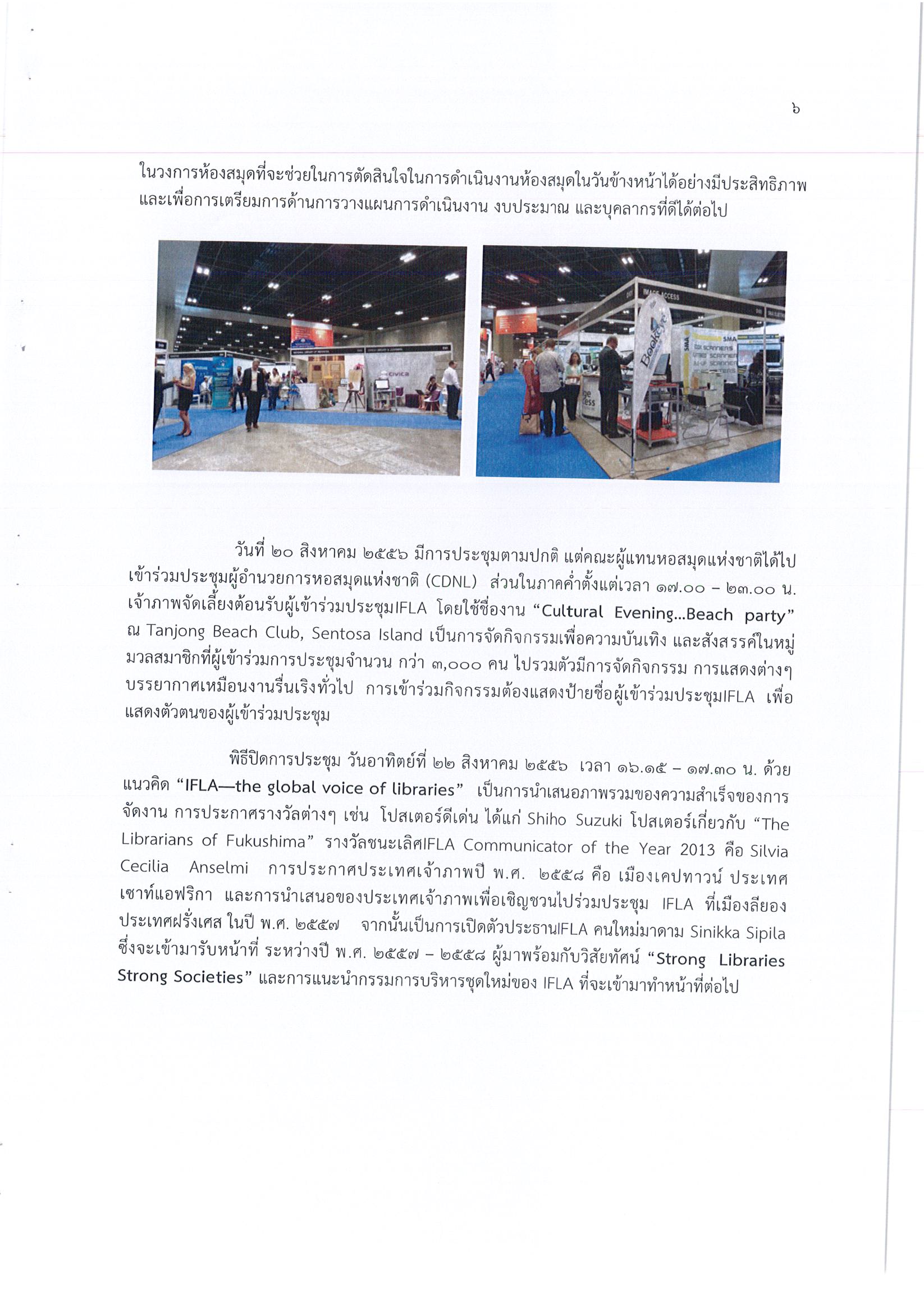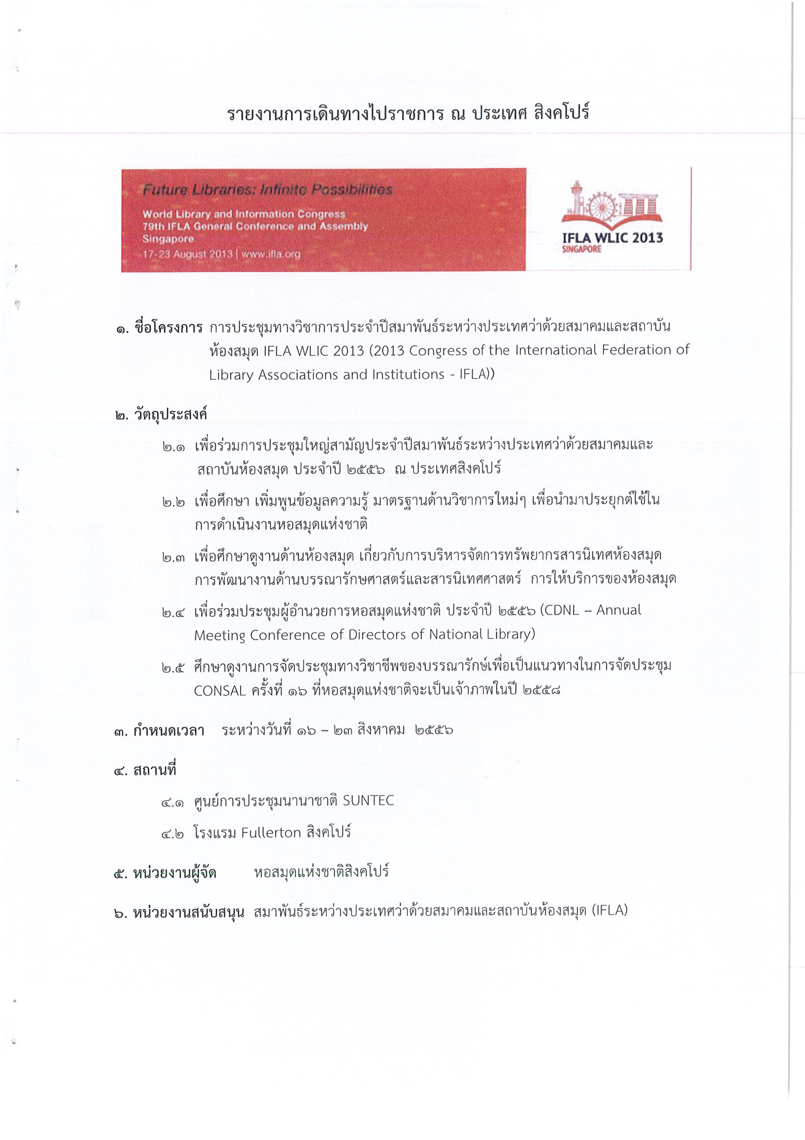 รายงานการเดินทางไปราชการ ณ ประเทศสิงคโปร์ ระหว่างวันที่ 16 – 23 สิงหาคม 2556 โครงการประชุมทางวิชาการประจำปีสมาพันธ์ระหว่างประเทศว่าด้วยสมาคมและสถาบันห้องสมุด IFLA WLIC 2013
