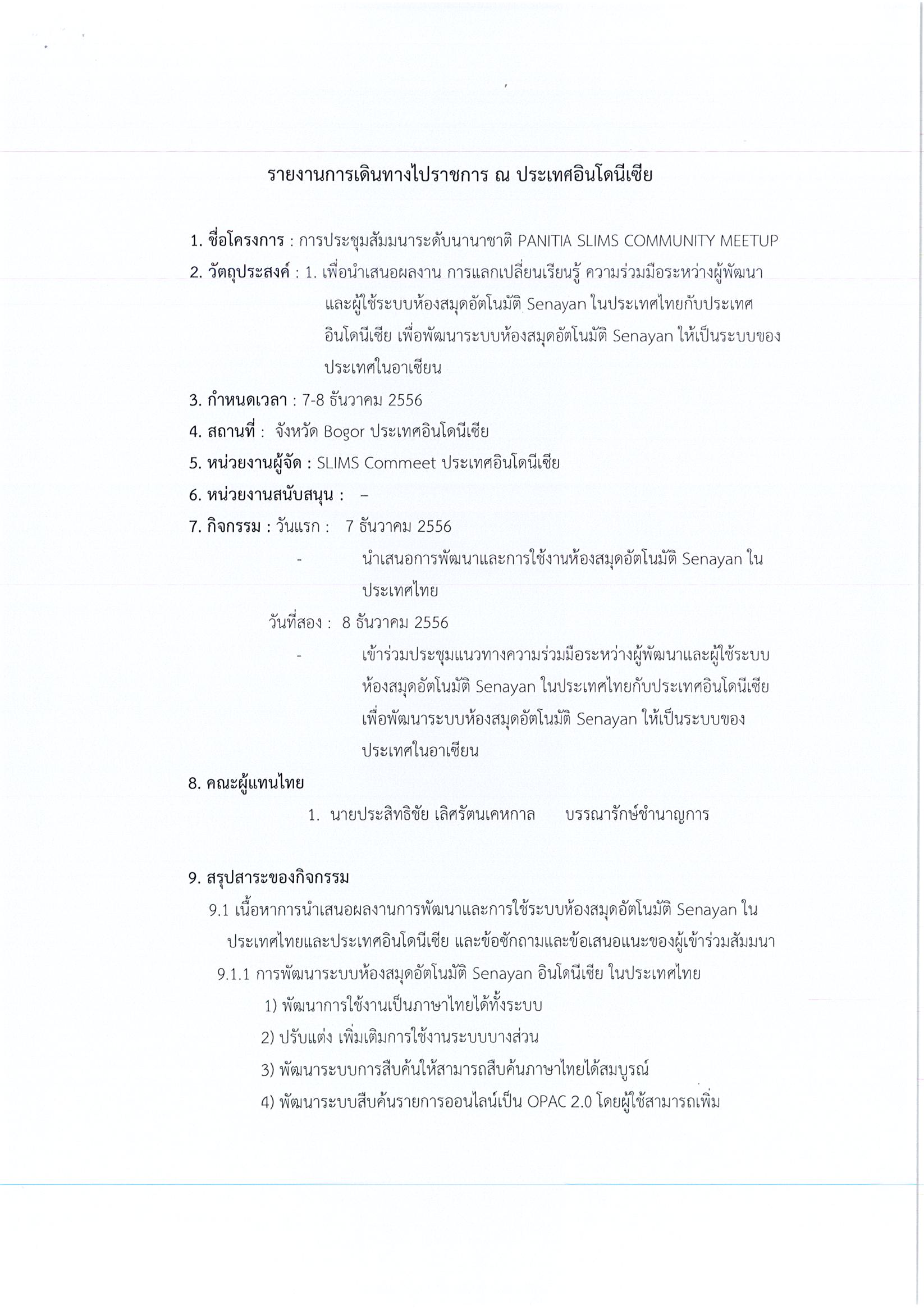 รายงานการเดินทางไปราชการ ณ สาธารณรัฐอินโดนีเซีย ระหว่างวันที่ 7 – 8 ธันวาคม 2556 โครงการประชุมสัมมนาระดับนานาชาติ PANITIA SLIMS COMMUNITY MEETUP