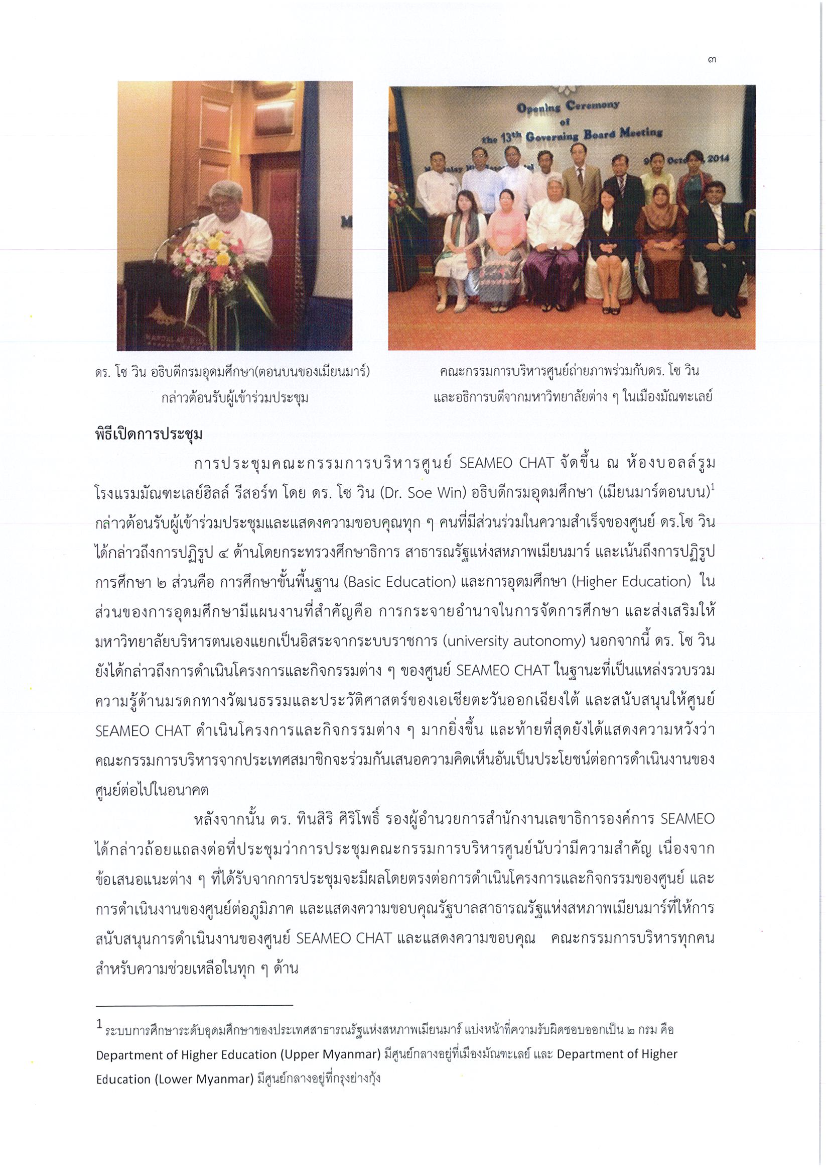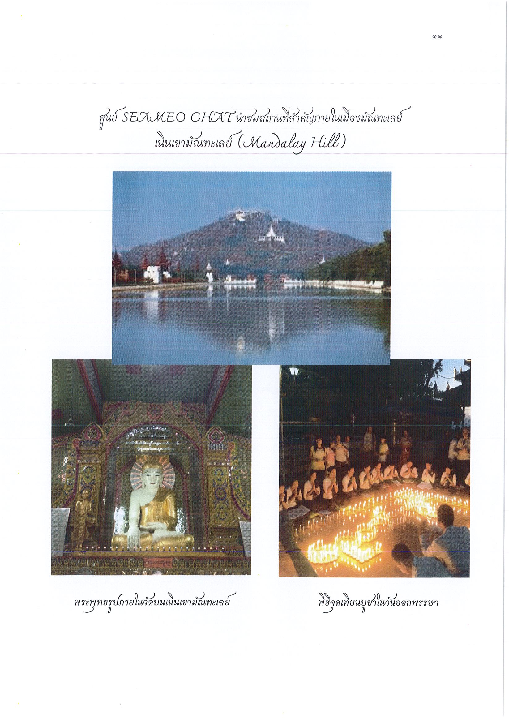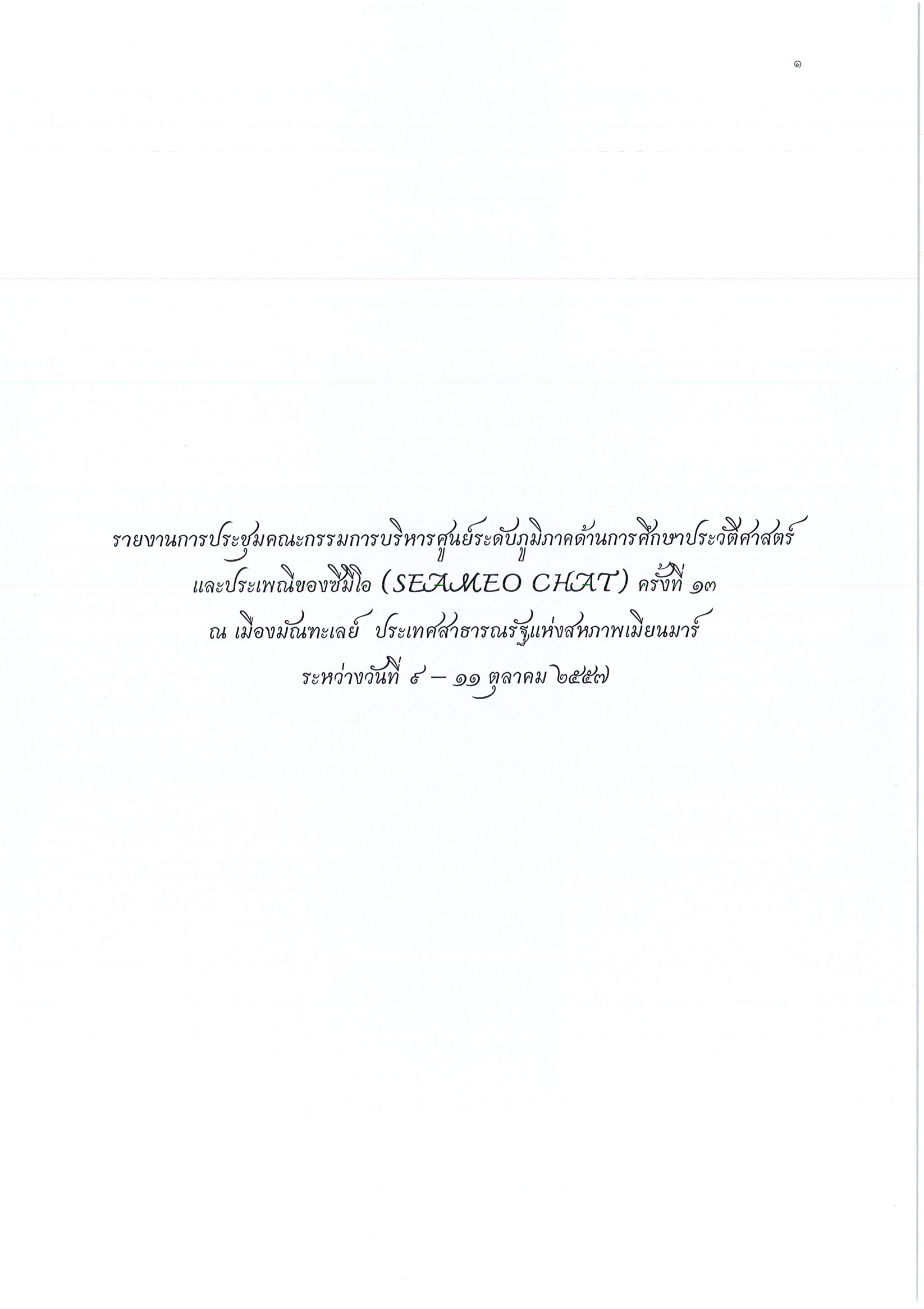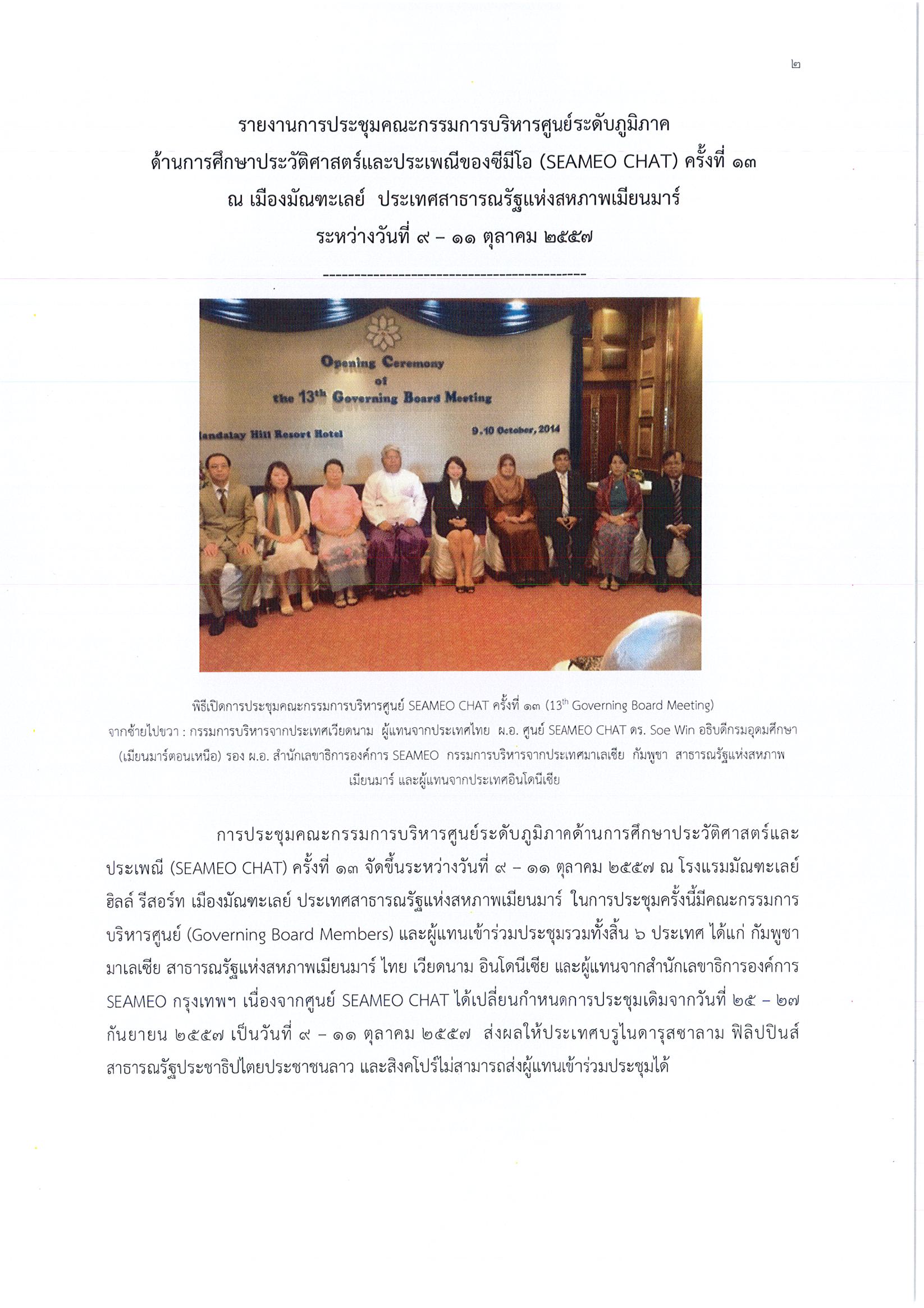 รายงานการเดินทางไปราชการเพื่อเข้าร่วมประชุมคณะกรรมการบริหารศูนย์ระดับภูมิภาคด้านการศึกษาประวัติศาสตร์ และประเพณีของซีมีโอ (SEAMEO CHAT) ครั้งที่ 13 ณ เมืองมัณฑะเลย์ ประเทศสาธารณรัฐแห่งสหภาพเมียนมาร์ ระหว่างวันที่ 9 – 11 ตุลาคม 2557