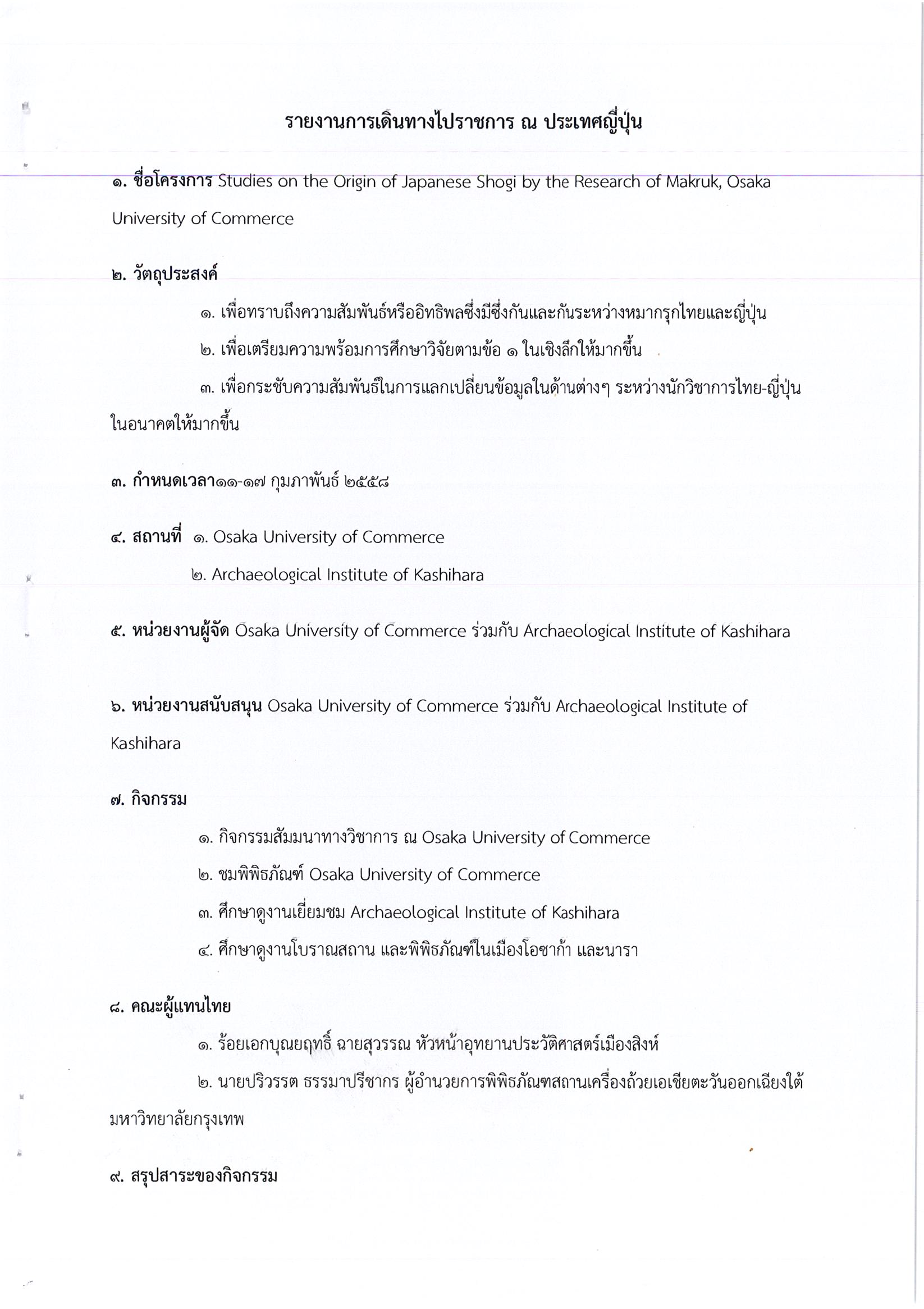 รายงานการเดินทางไปราชการ ณ ประเทศญี่ปุ่น โครงการ Studies on the Origin of Japanese Shogi by the Research of Makruk, Osaka University of Commerce