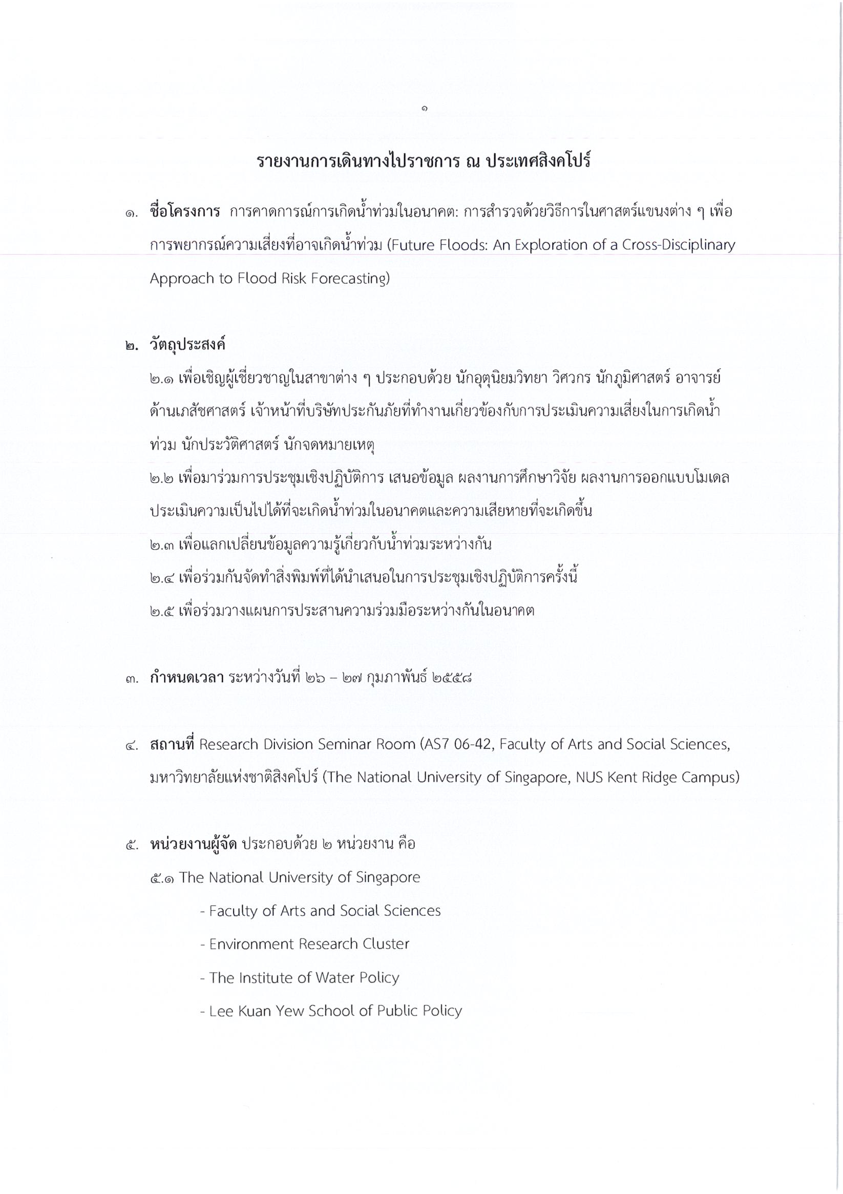 รายงานการเดินทางไปราชการ ณ สาธารณรัฐสิงคโปร์ ระหว่างวันที่ 26 – 27 กุมภาพันธ์ 2558 โครงการการคาดการณ์การเกิดน้ำท่วมในอนาคต : การสำรวจด้วยวิธีในศาสตร์แขนงต่างๆ เพื่อการพยากรณ์ความเสี่ยงที่อาจเกิดน้ำท่วม