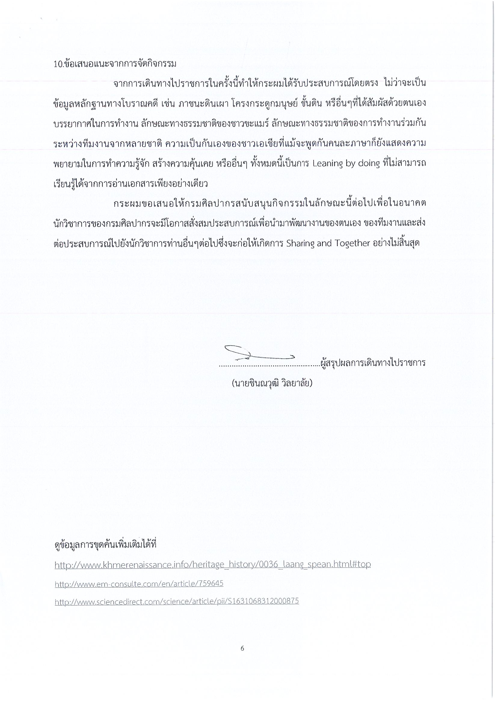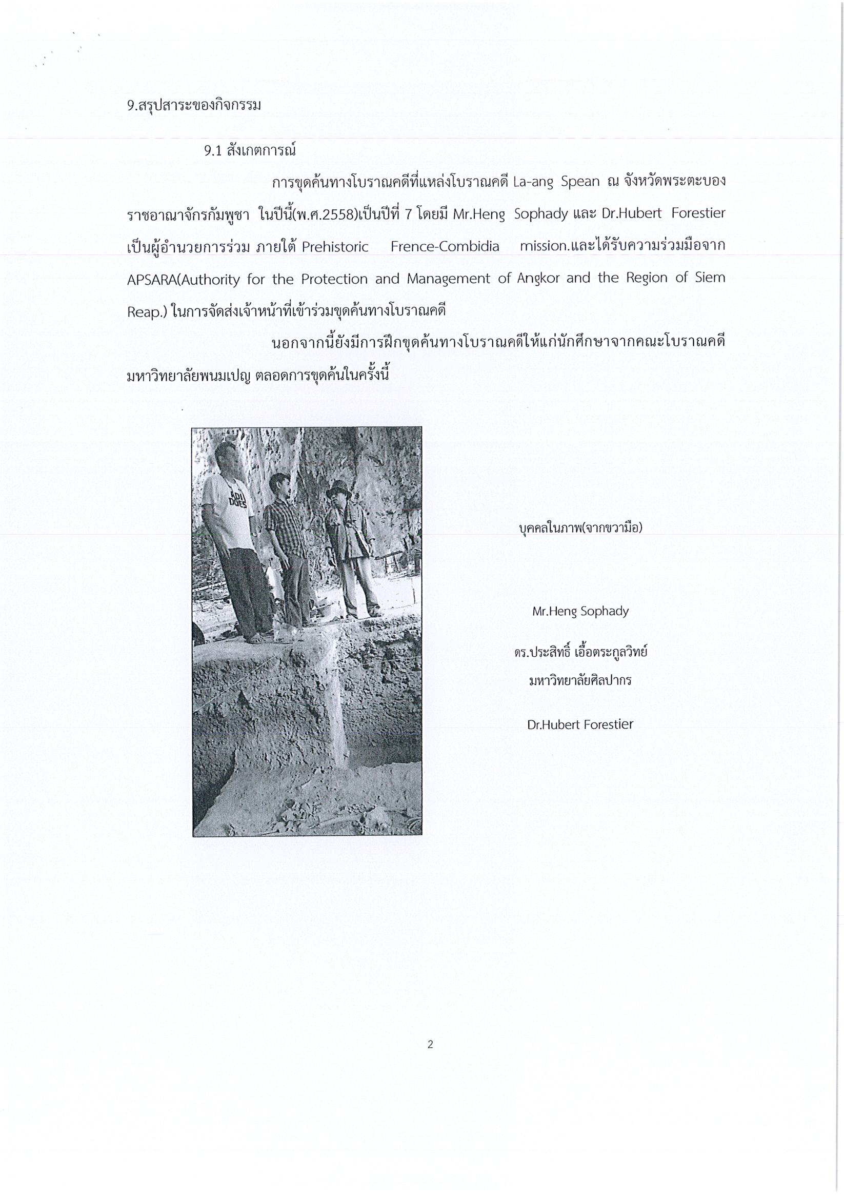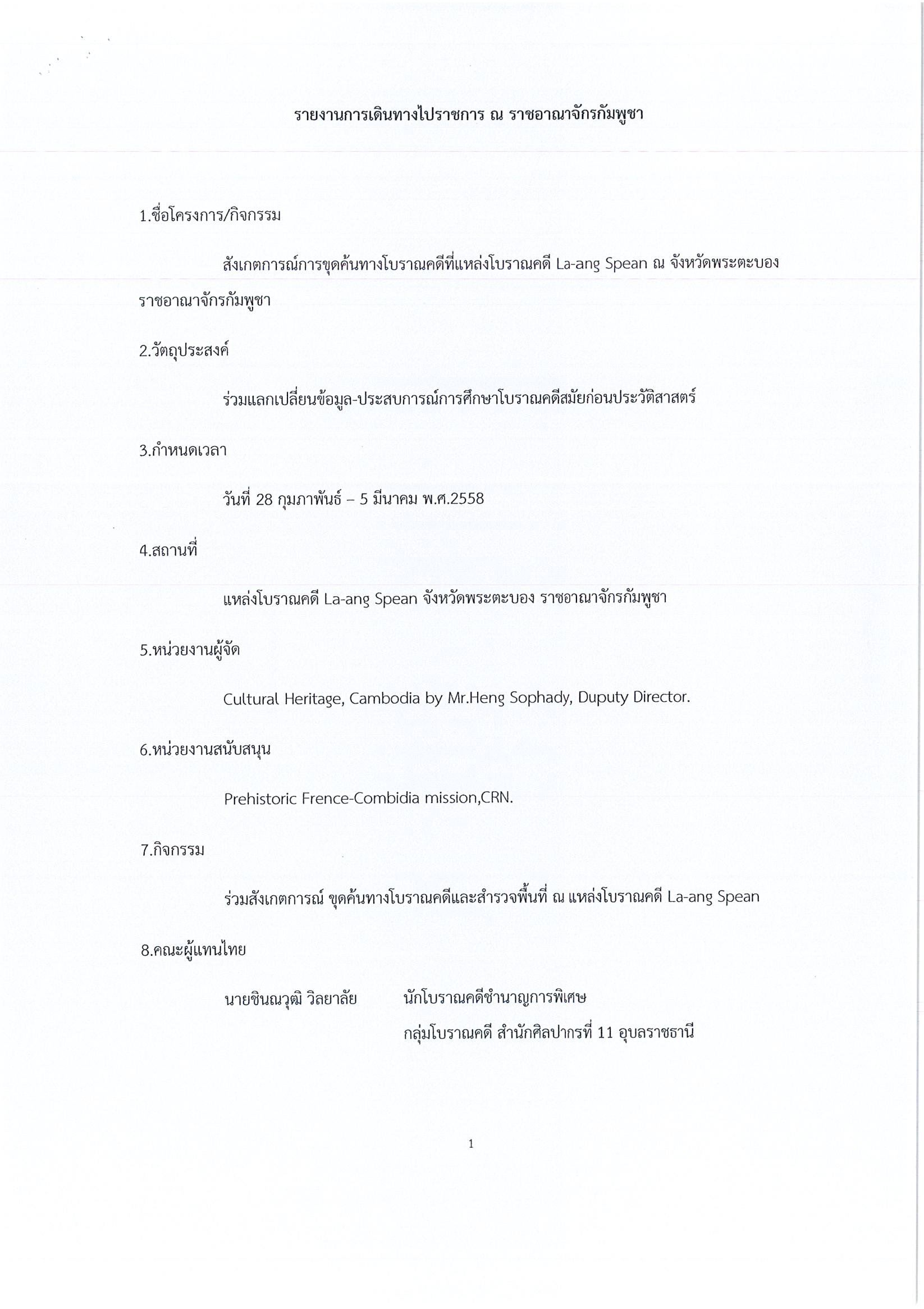 รายงานการเดินทางไปราชการ ณ ราชอาณาจักรกัมพูชา ระหว่างวันที่ 28 กุมภาพันธ์ – 5 มีนาคม 2558 เพื่อสังเกตการณ์การขุดค้นทางโบราณคดีที่แหล่งโบราณคดี La-ang Spean จังหวัดพระตะบอง