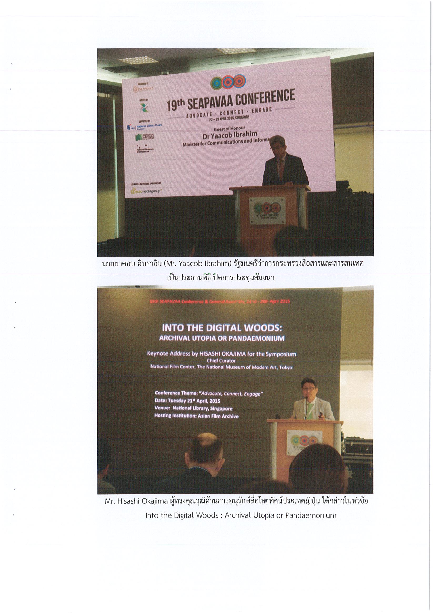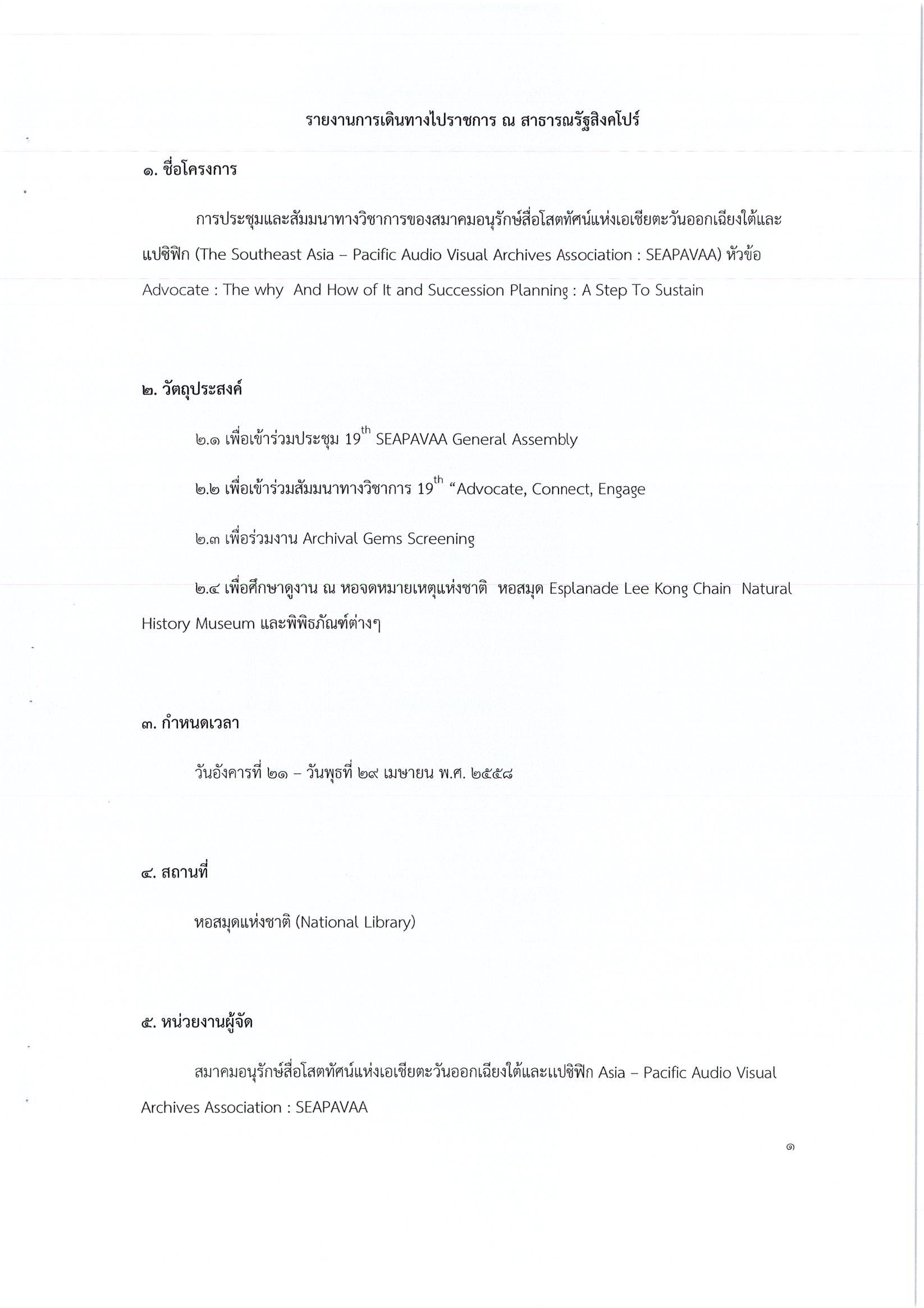 รายงานการเดินทางไปราชการ ณ สาธารณรัฐสิงคโปร์ ระหว่างวันที่ 21 – 29 เมษายน 2558 โครงการประชุมและสัมมนาทางวิชาการของสมาคมอนุรักษ์สื่อโสตทัศน์แห่งเอเชียตะวันออกเฉียงใต้และแปซิฟิก