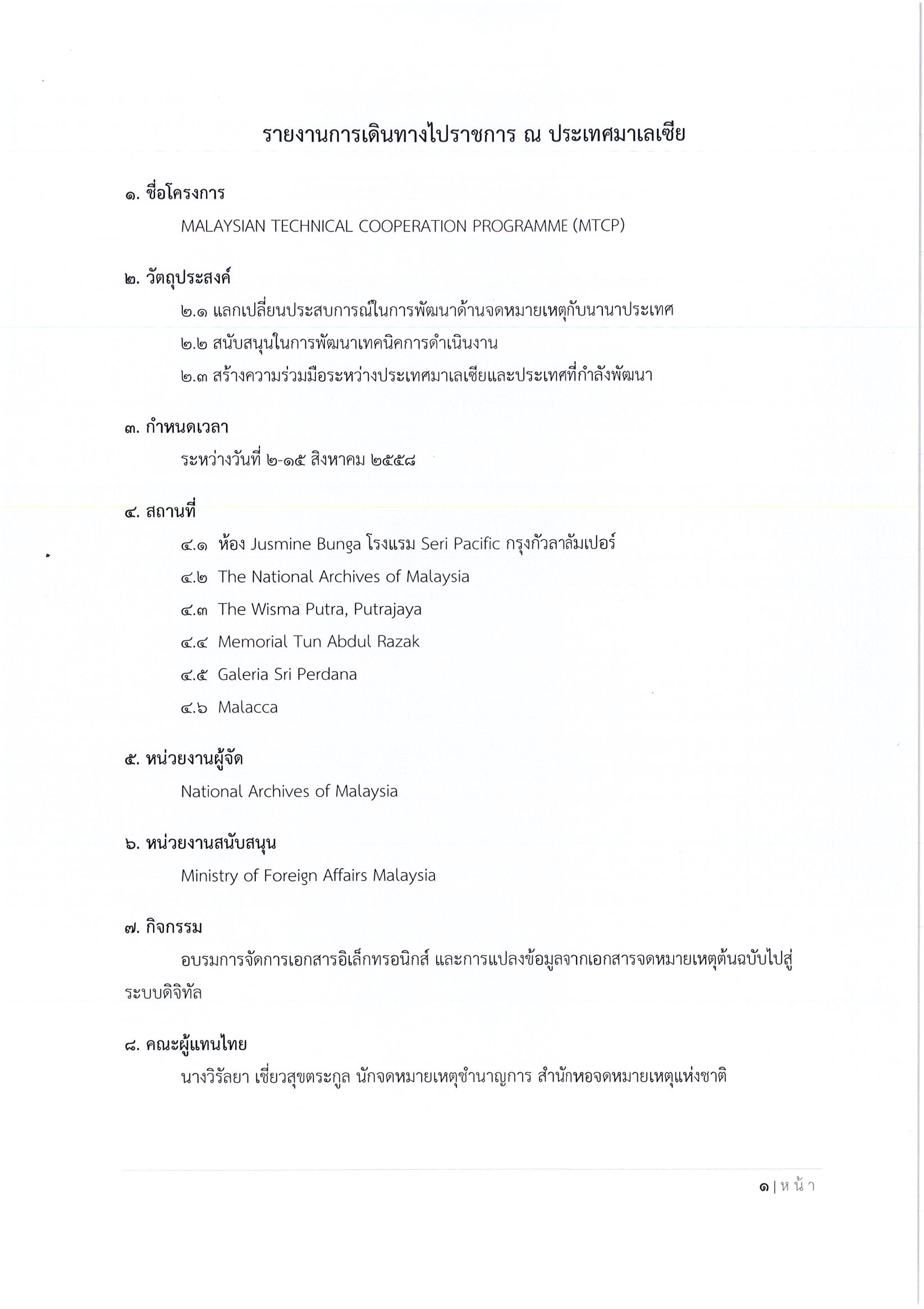 รายงานการเดินทางไปราชการ ณ สหพันธรัฐมาเลเซีย ระหว่างวันที่ 2 – 15 สิงหาคม 2558 โครงการ Malaysian Technical Cooperation Programme (MTCP)