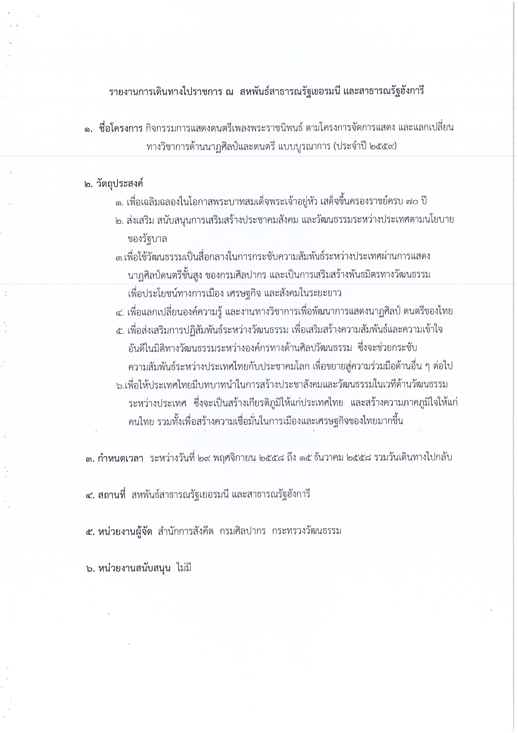 รายงานการเดินทางไปราชการ ณ สหพันธ์สาธารณรัฐเยอรมนี และสาธารณรัฐฮังการี ระหว่างวันที่ 30 พฤศจิกายน – 15 ธันวาคม 2558 โครงการกิจกรรรมการแสดงดนตรีพระราชนิพนธ์ ตามโครงการจัดการแสดงและแลกเปลี่ยนทางวิชาการด้านนาฏศิลป์และดนตรีแบบบูรณาการ ประจำปี 2559