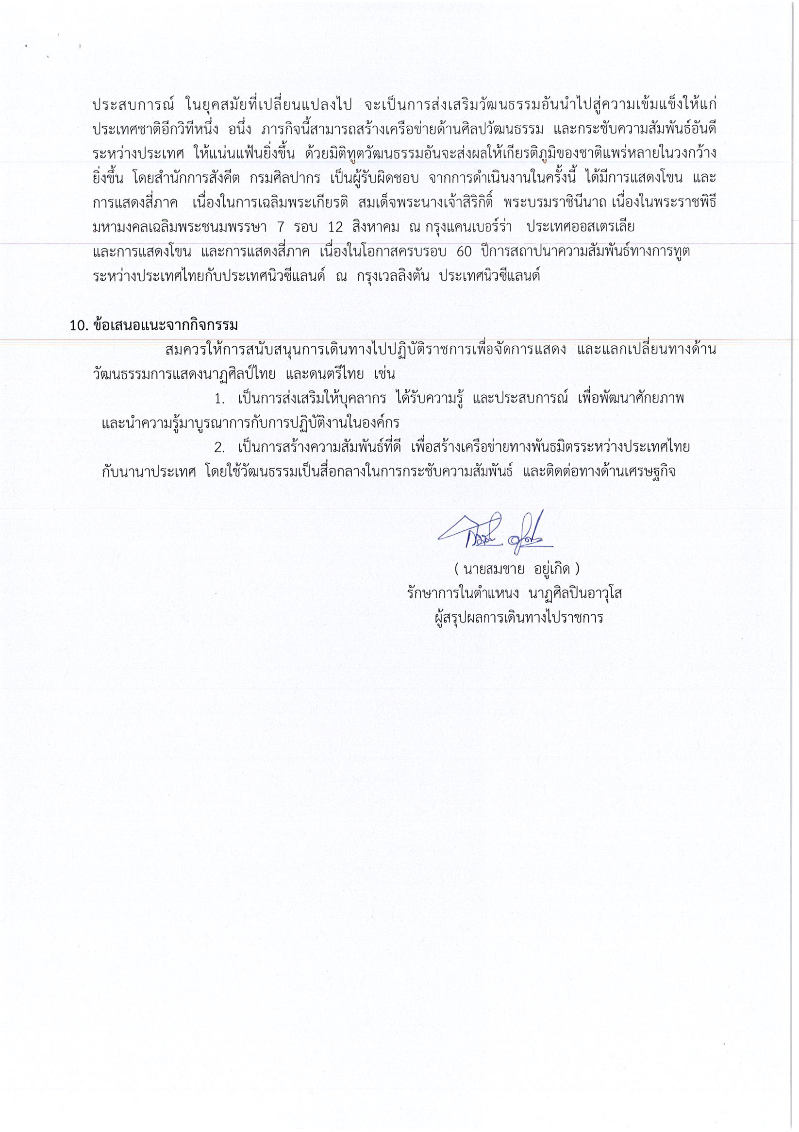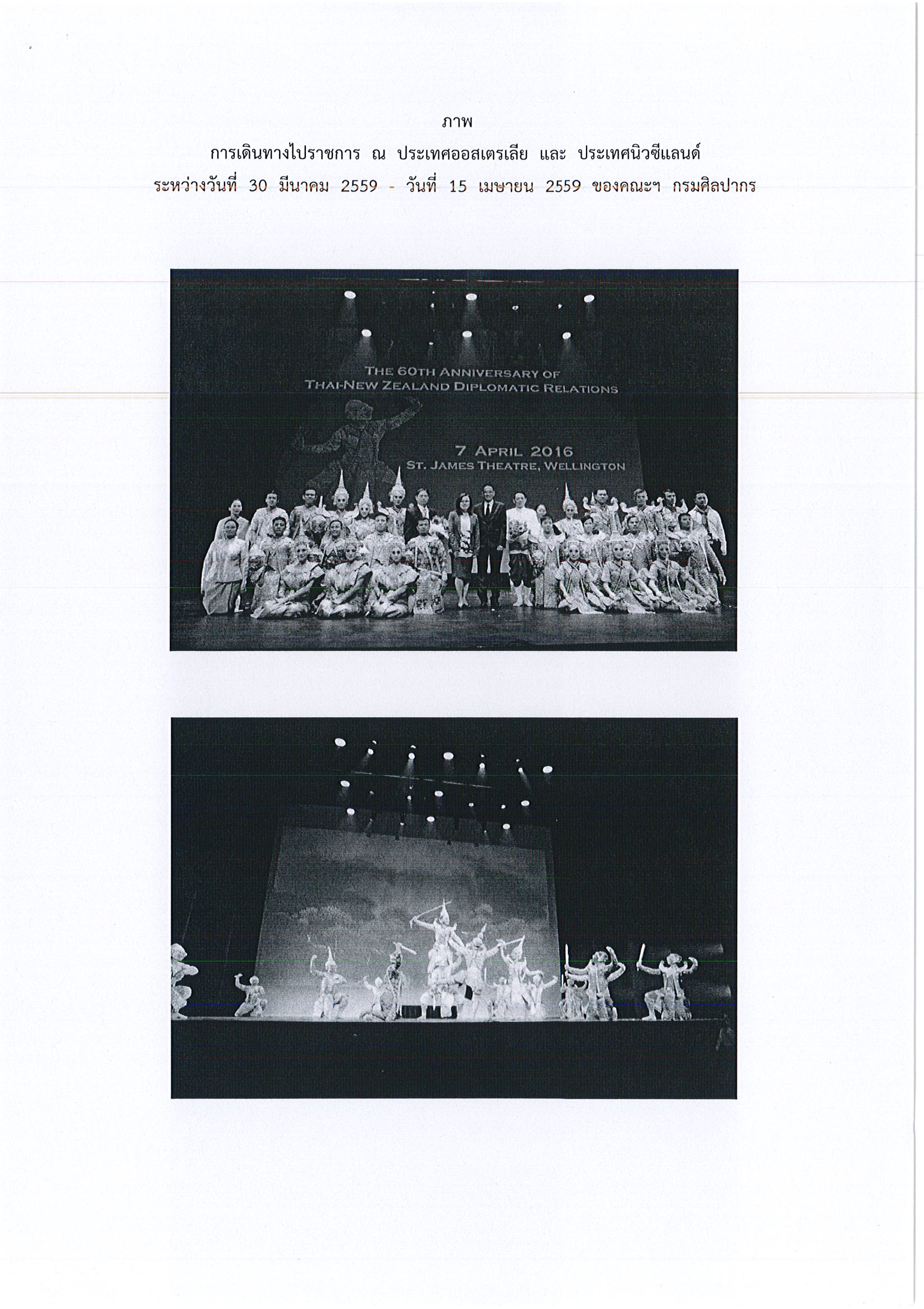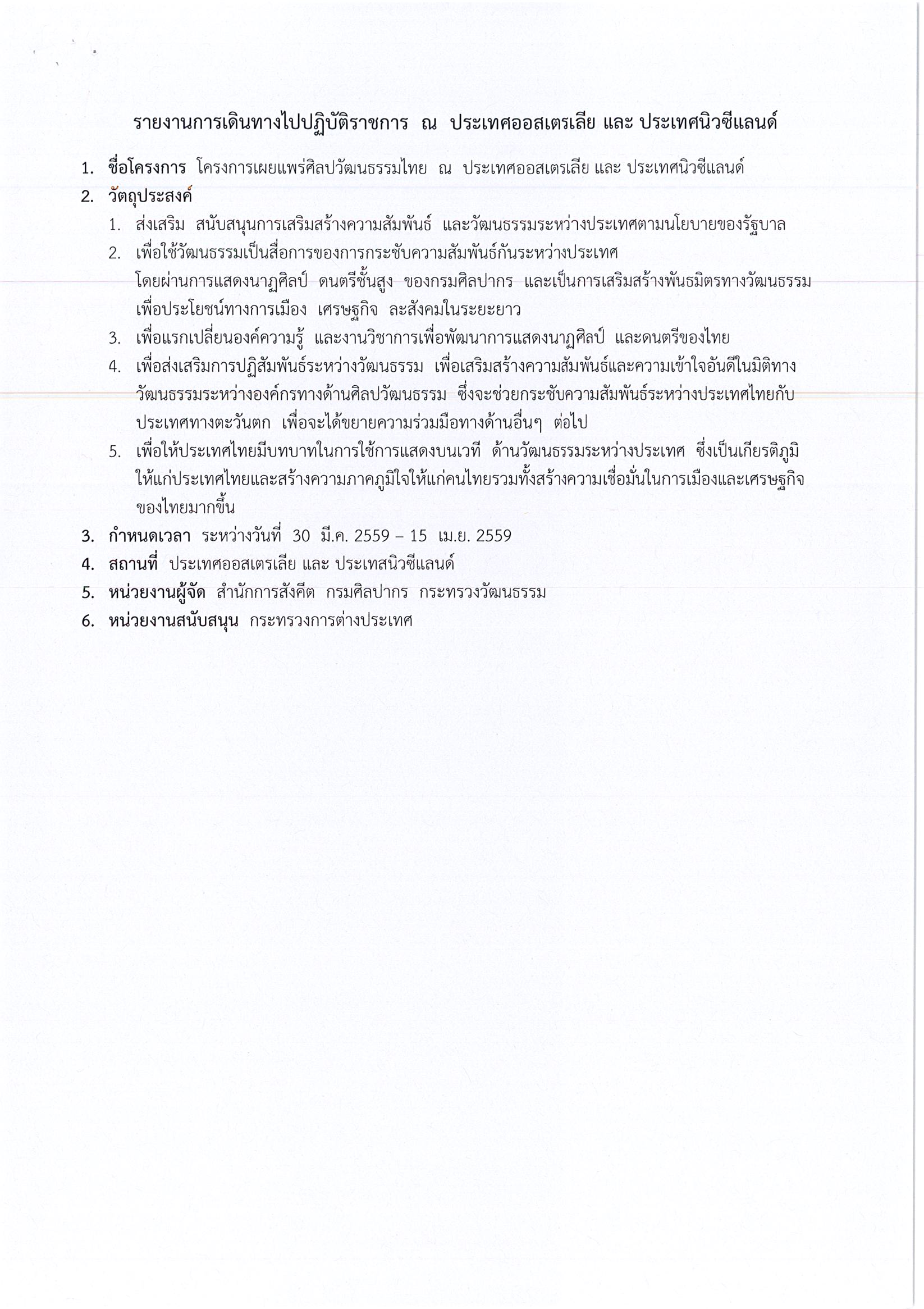 รายงานการเดินทางไปราชการ ณ เครือรัฐออสเตรเลีย และประเทศนิวซีแลนด์ ระหว่างวันที่ 30 มีนาคม – 15 เมษายน 2559 โครงการมหกรรมการแสดงด้านนาฏศิลป์ ดุริยางคศิลป์ และดนตรีแบบบูรณาการ ภายใต้โครงการส่งเสริมอุตสาหกรรมวัฒนธรรมสร้างสรรค์ เพื่อเพิ่มศักยภาพในการแข่งขันกิจกรรมการแสดงนาฏศิลป์และดนตรีไทย ปี 2559