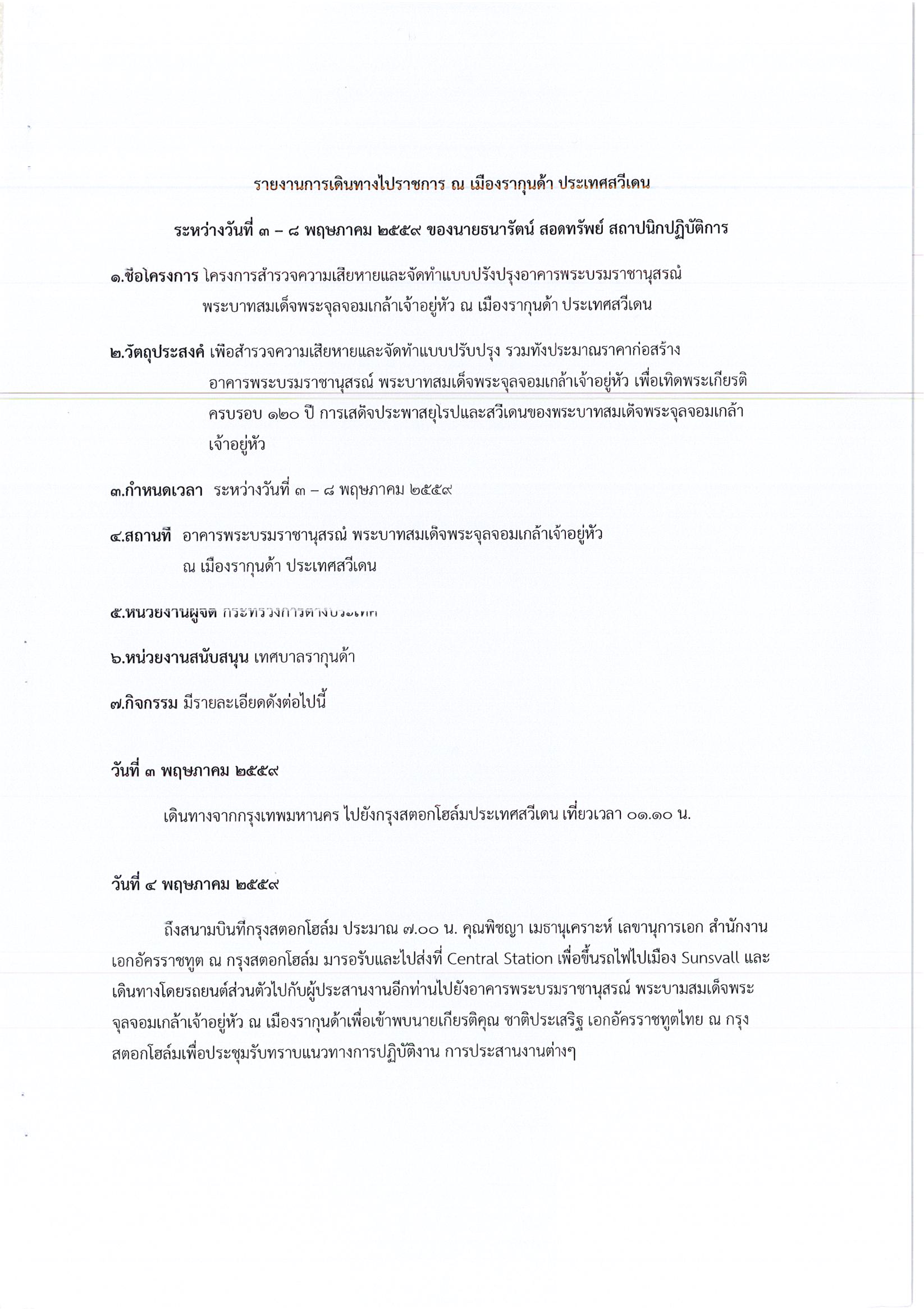 รายงานการเดินทางไปราชการ ณ ราชอาณาจักรสวีเดน ระหว่างวันที่ 3 – 8 พฤษภาคม 2559 โครงการสำรวจความเสียหายและจัดทำแบบปรับปรุงอาคารพระบรมราชานุสรณ์พระบาทสมเด็จพระจุลจอมเกล้าเจ้าอยู่หัว ณ เมืองรากุนด้า