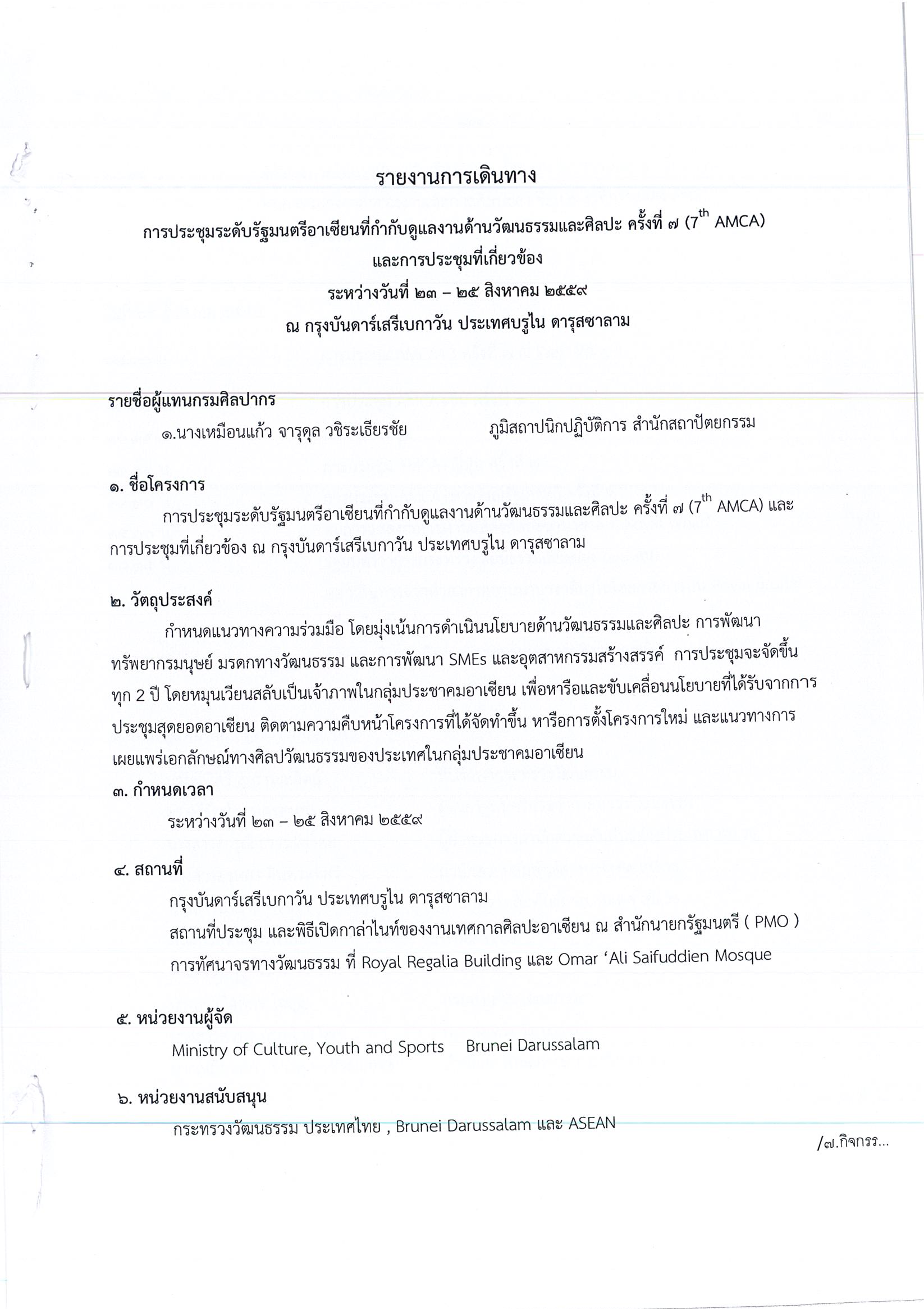 รายงานการเดินทางไปราชการ ณ เนการาบรูไนดารุสซาลาม ระหว่างวันที่ 23 – 25 สิงหาคม 2559 โตน การประชุมระดับรัฐมนตรีอาเซียนที่กำกับดูแลงานด้านวัฒนธรรมและศิลปะครั้งที่ 7 และการประชุมที่เกี่ยวข้อง