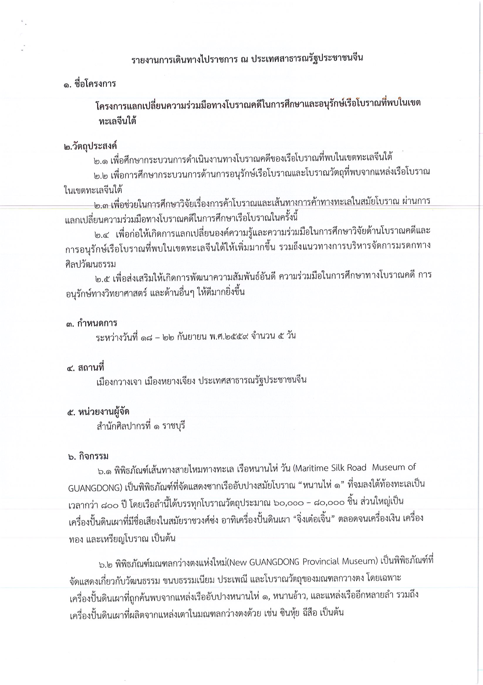 รายงานการเดินทางไปราชการ ณ สาธารณรัฐประชาชนจีน ระหว่างวันที่ 18 – 22 กันยายน 2559 โครงการแลกเปลี่ยนความร่วมมือทางโบราณคดีในการศึกษาและอนุรักษ์เรือโบราณที่พบในเขตทะเลจีนใต้