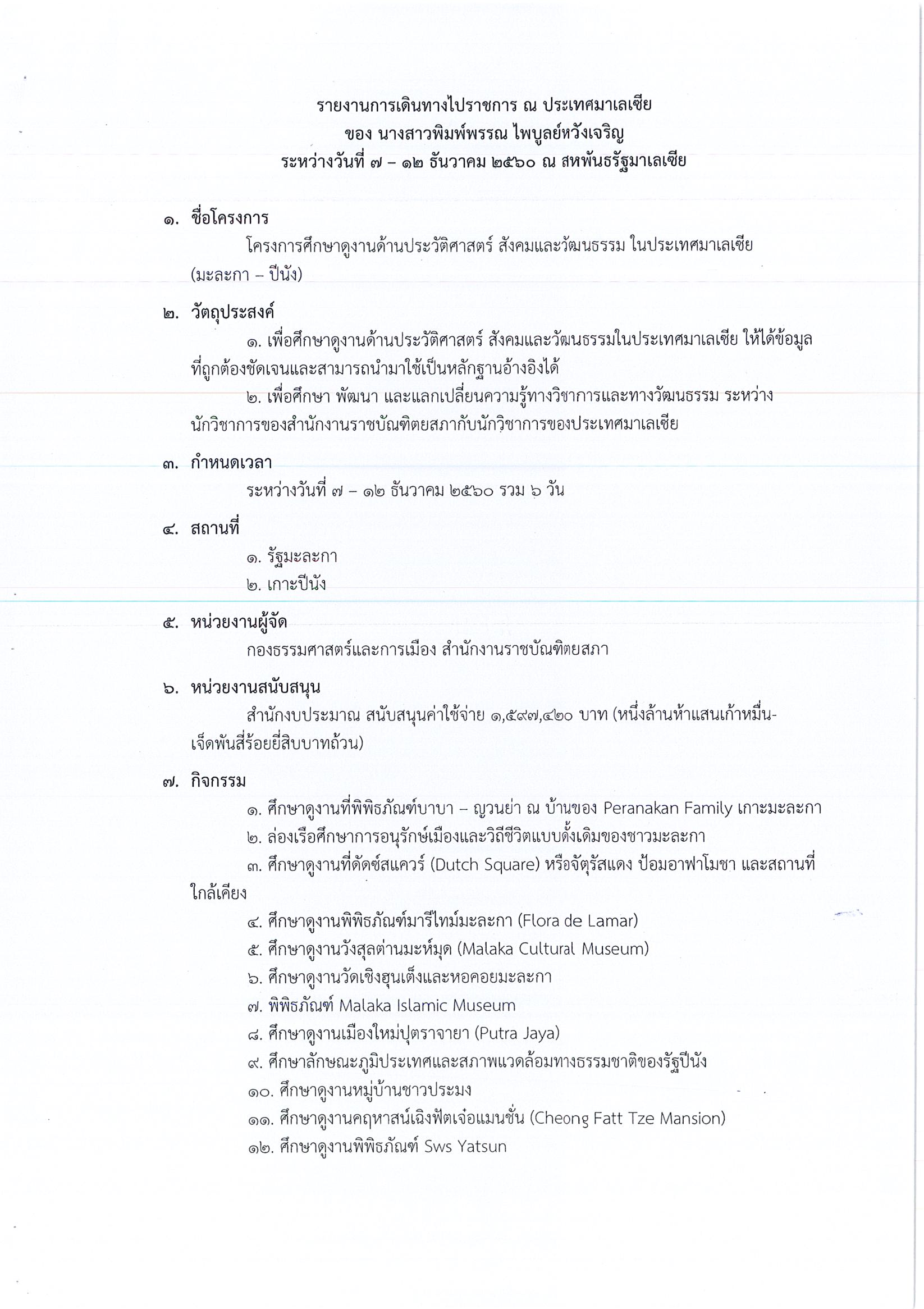 รายงานการเดินทางไปราชการ ณ สหพันธรัฐมาเลเซีย ระหว่างวันที่ 7 – 12 ธันวาคม 2560 โครงการศึกษาดูงานด้านประวัติศาสตร์ สังคม และวัฒนธรรมในประเทศมาเลเซีย (มะละกา – ปีนัง)