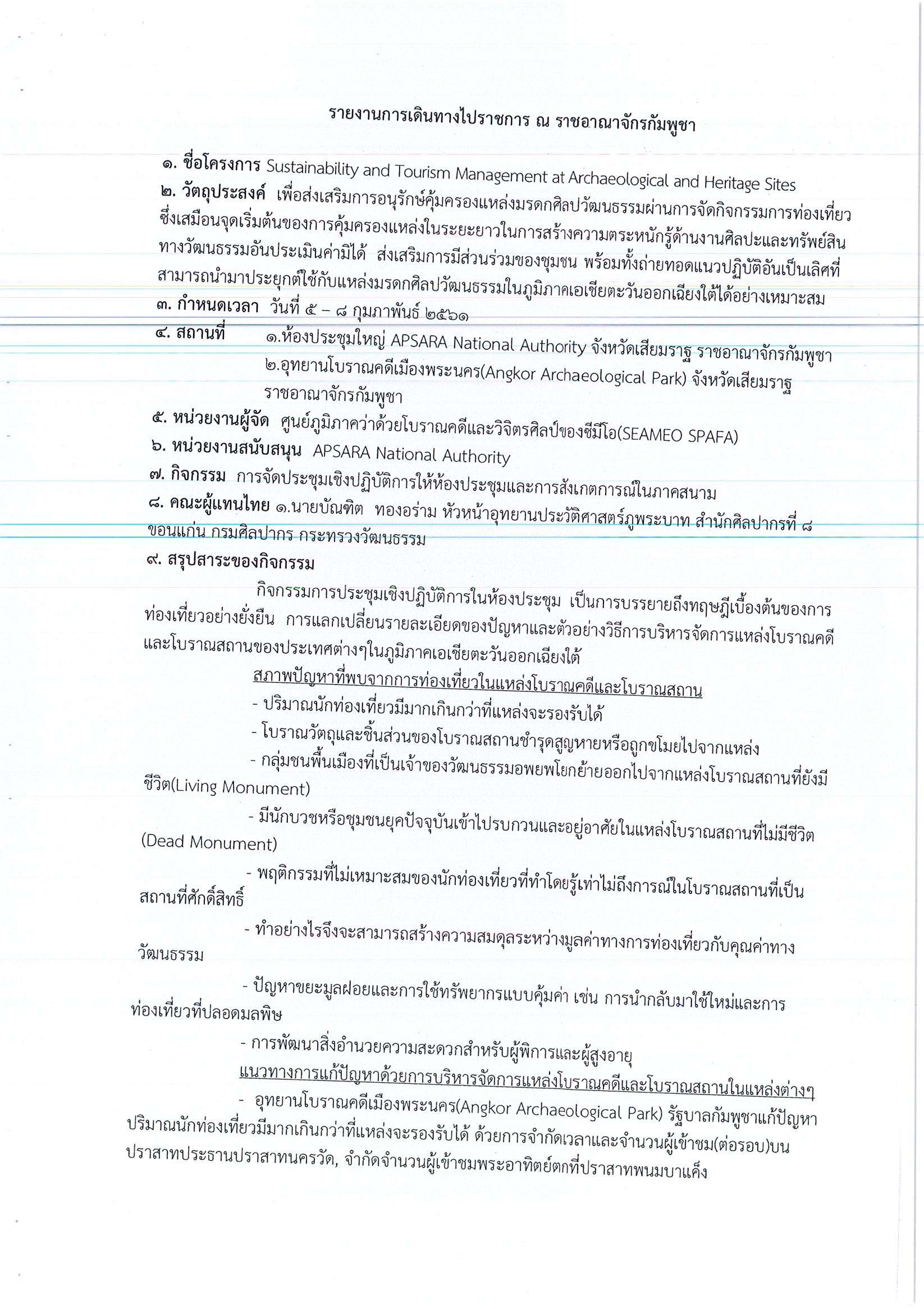 รายงานการเดินทางไปราชการ ณ ราชอาณาจักรกัมพูชา ระหว่างวันที่ 5 – 8 กุมภาพันธ์ 2561 โครงการประชุมเชิงปฏิบัติการ “Sustainability and Tourism Management at Archaeological and Heritage Sites”