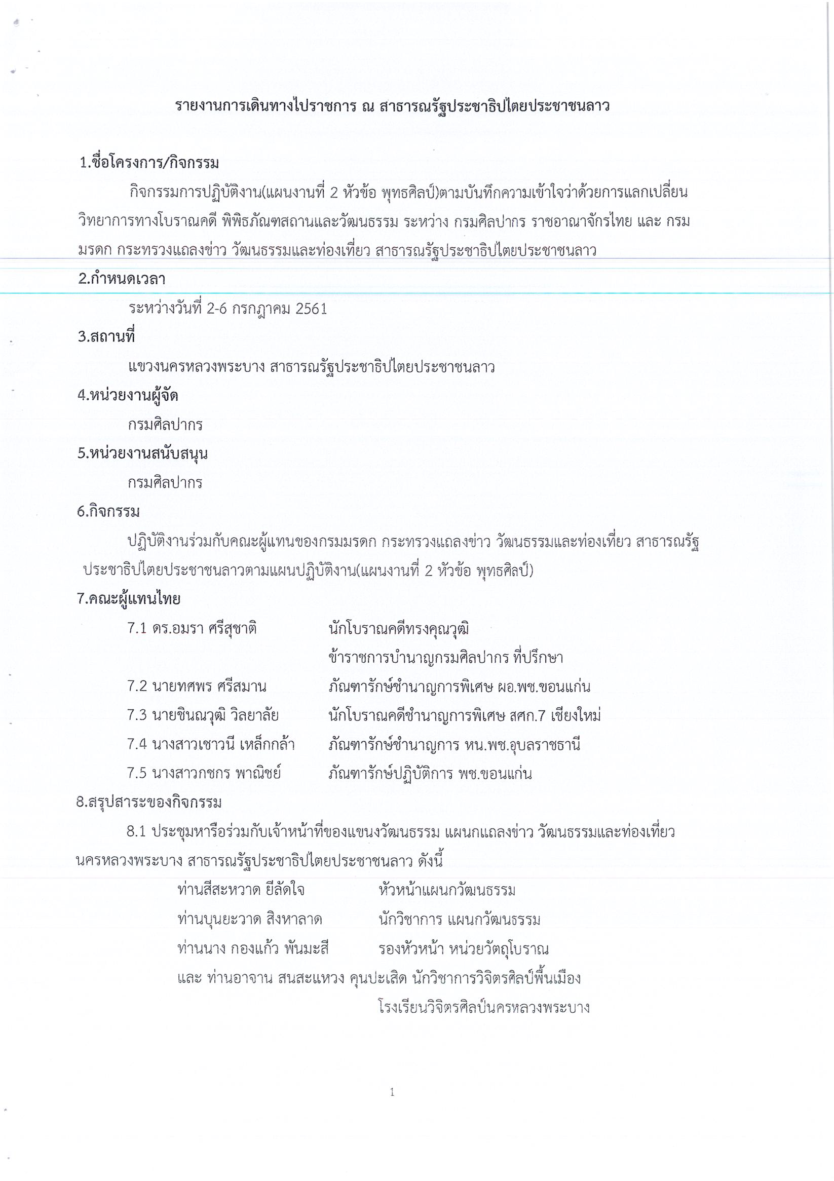 รายงานการเดินทางไปราชการ ณ สาธารณรัฐประชาธิปไตยประชาชนลาว ระหว่างวันที่ 2 – 6 กรกฎาคม 2561 โครงการปฏิบัติงานตามบันทึกความเข้าใจว่าด้วยการแลกเปลี่ยนวิทยาการทางโบราณคดี พิพิธภัณฑสถานและวัฒนธรรม ระหว่างกรมศิลปากร ประเทศไทย และกรมมรดก กระทรวงแถลงข่าวและการท่องเที่ยว สปป.ลาว