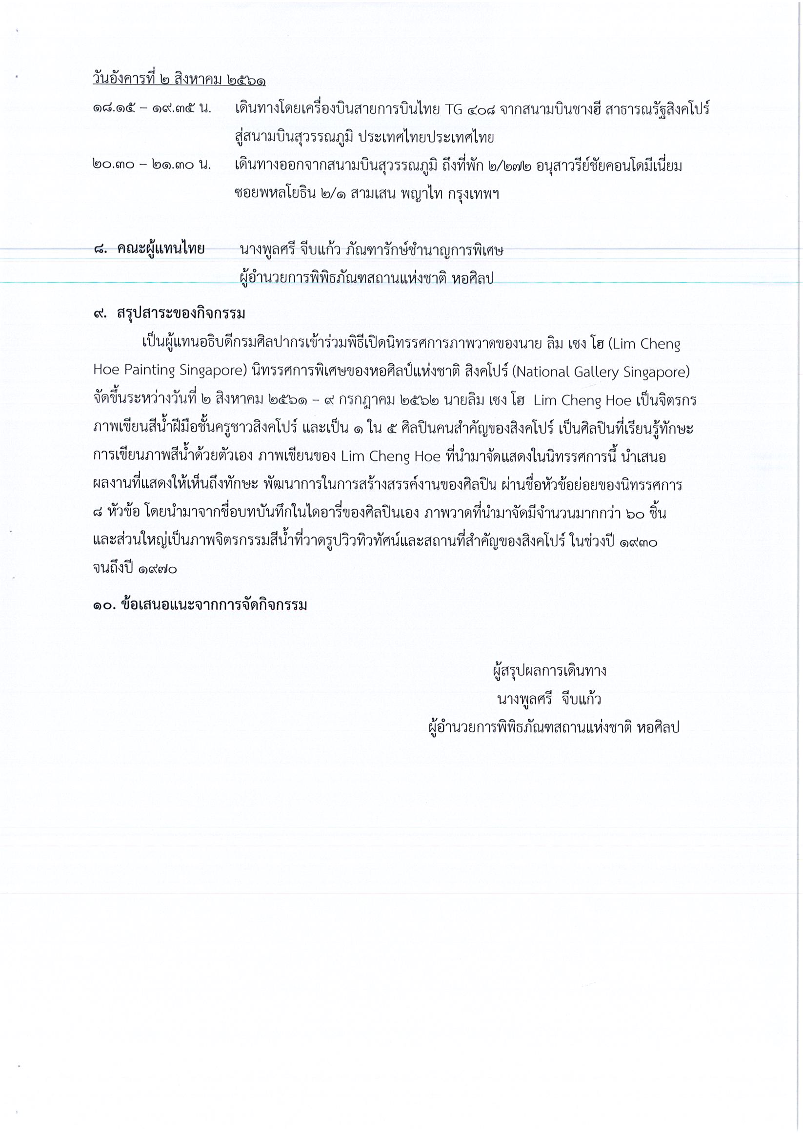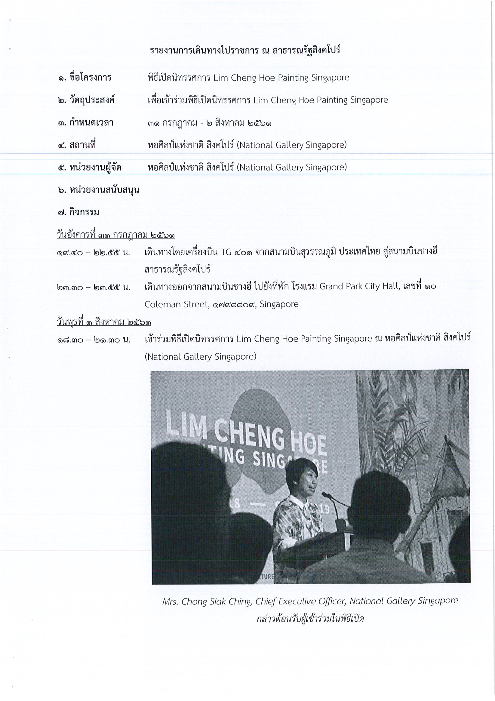 รายงานการเดินทางไปราชการ ณ สาธารณรัฐสิงคโปร์ ระหว่างวันที่ 31 กรกฎาคม – 1 สิงหาคม 2561 โครงการเปิดนิทรรศการ Lim Cheng Hoe Painting Singapore