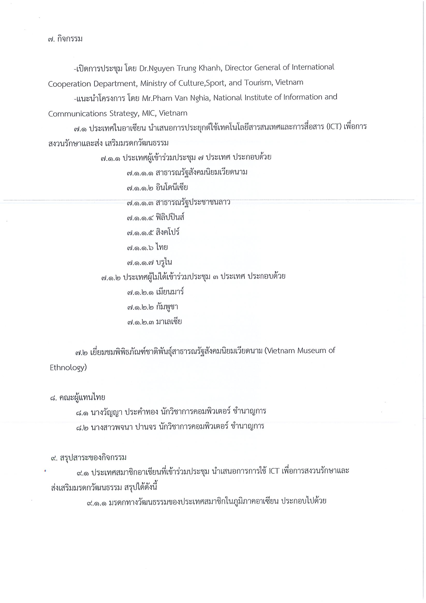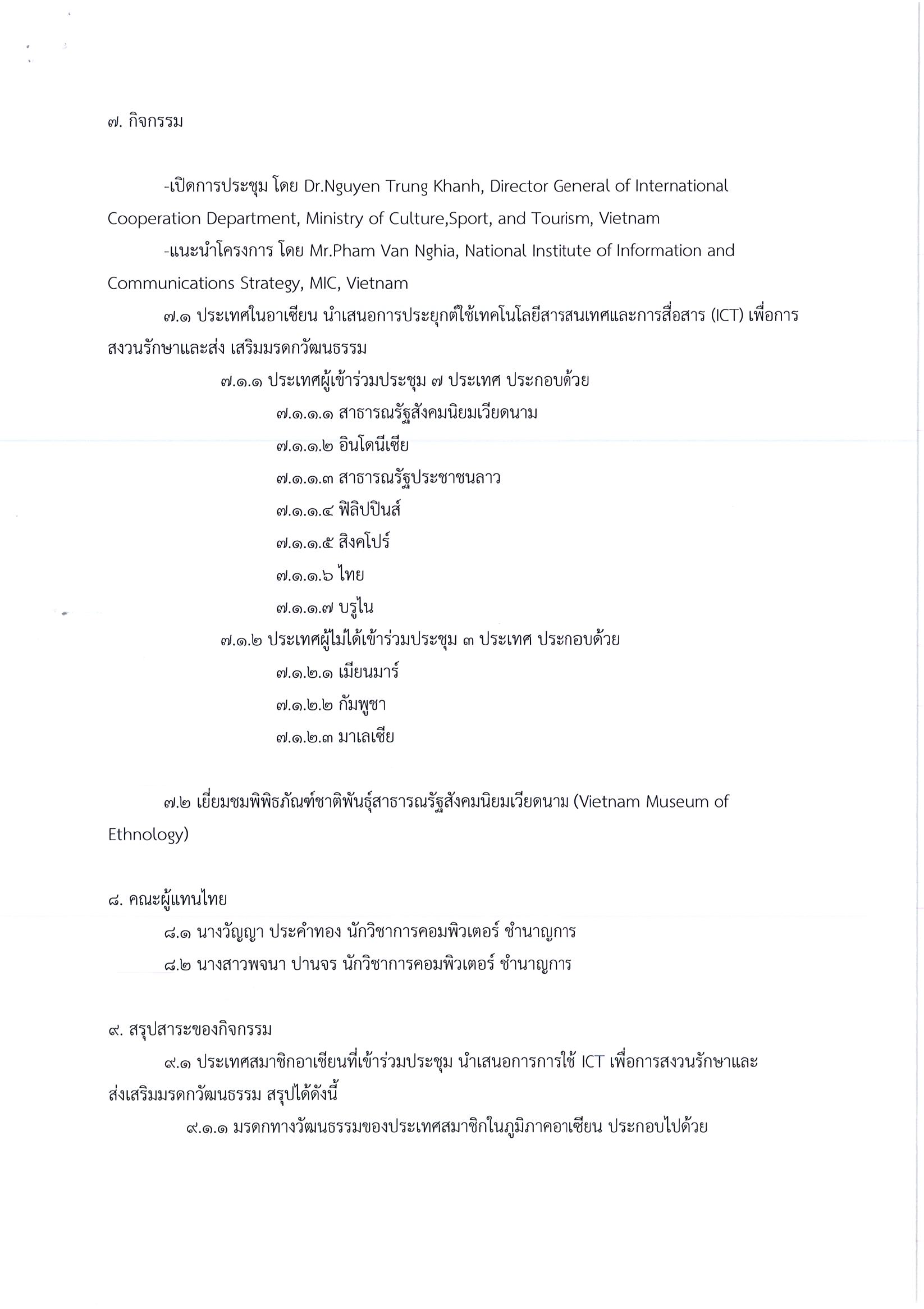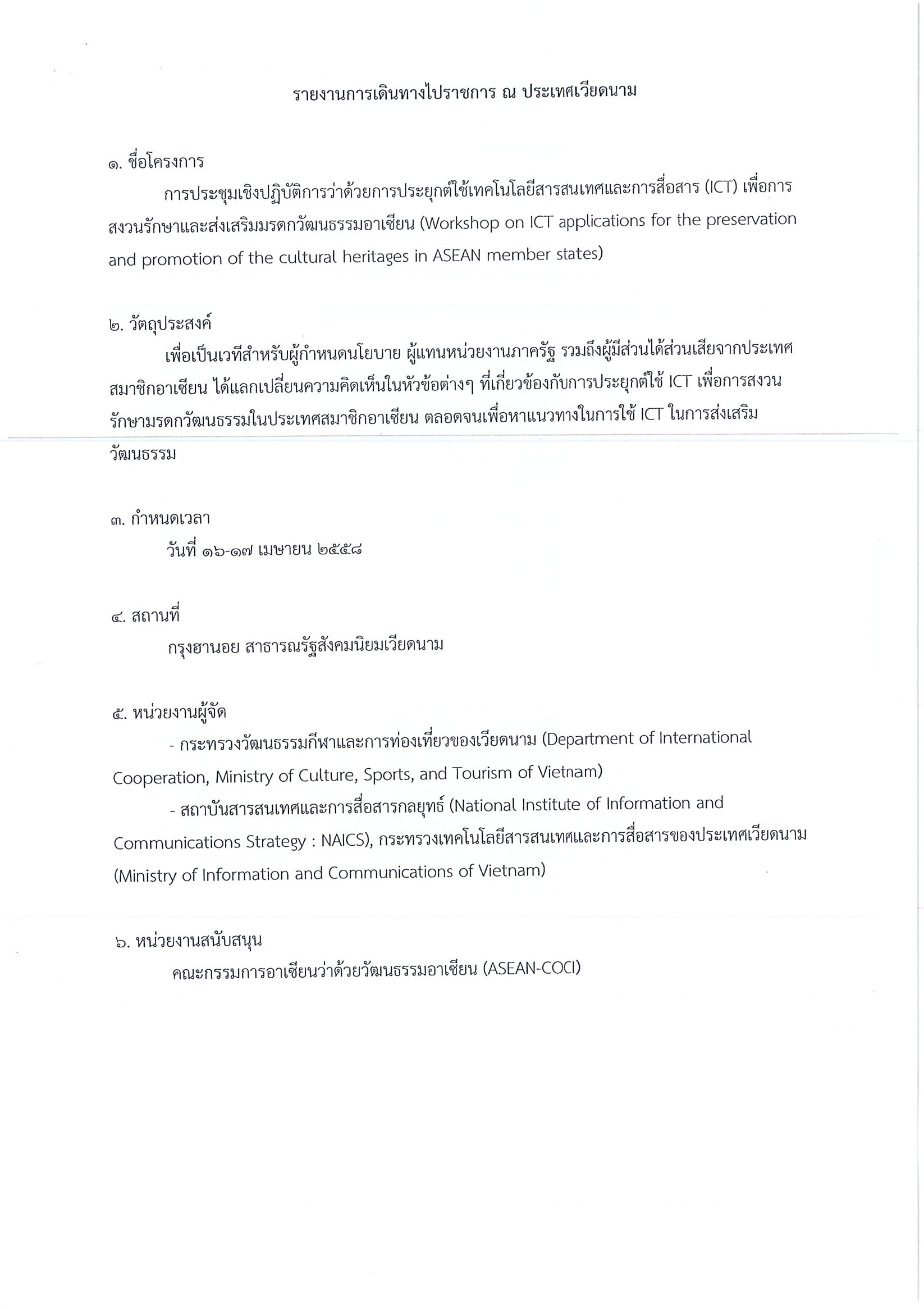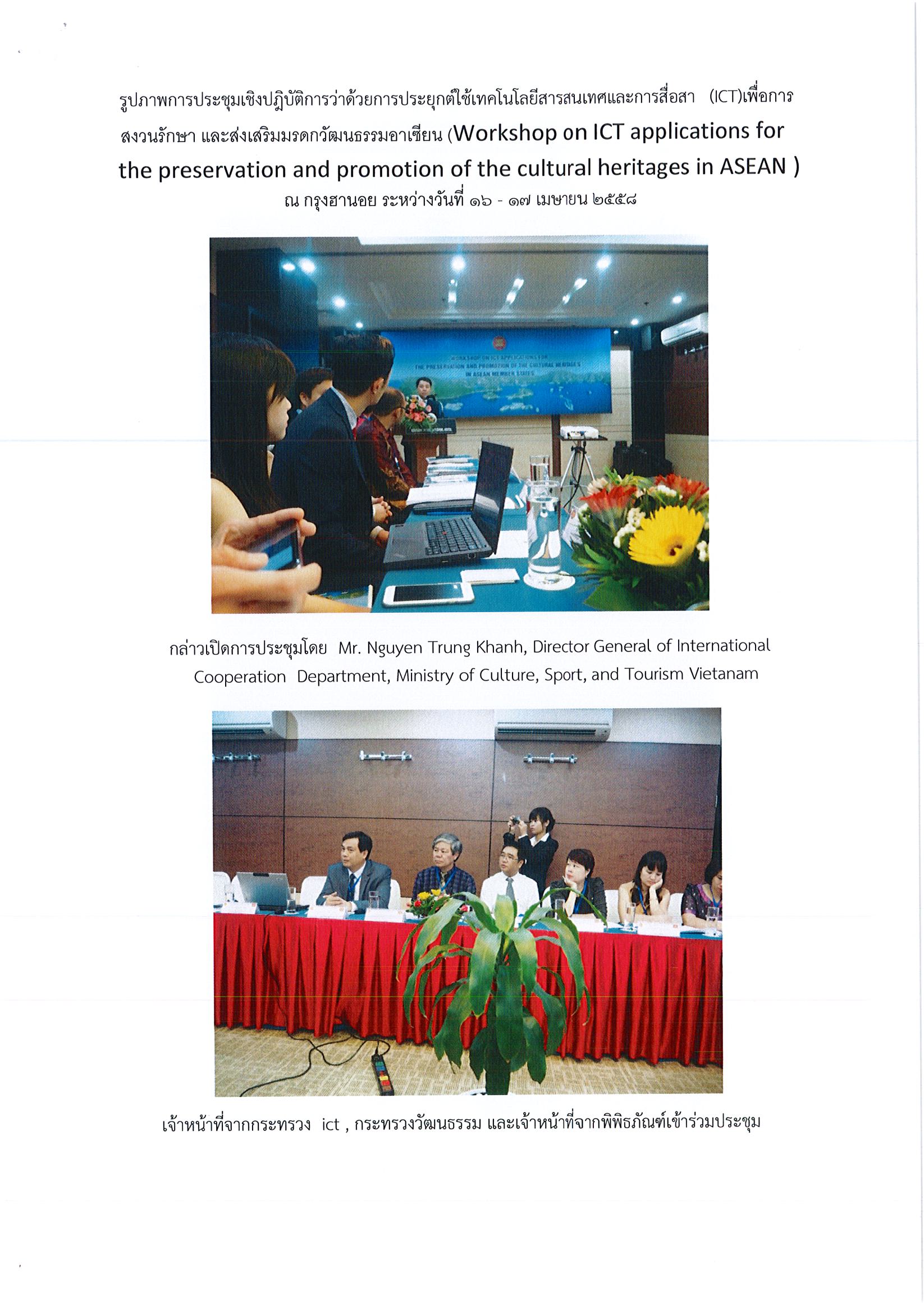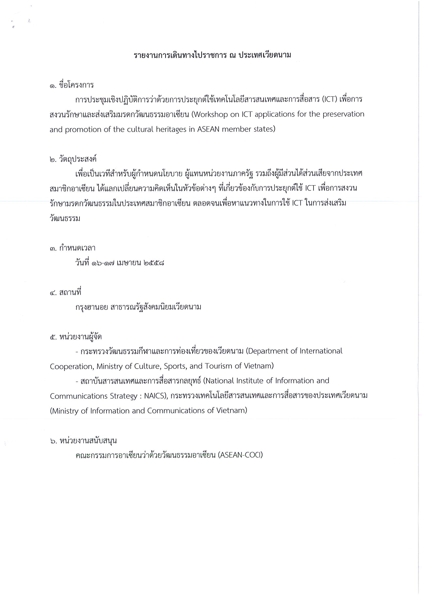 รายงานการเดินทางไปราชการ ณ สาธารณรัฐสังคมนิยมเวียดนาม ระหว่างวันที่ 16 – 17 เมษายน 2558 โครงการประชุมเชิงปฏิบัติการว่าด้วยการประยุกต์ใช้เทคโนโลยีสารสนเทศและการสื่อสาร เพื่อการสงวนรักษาและส่งเสริมมรดกวัฒนธรรมอาเซียน