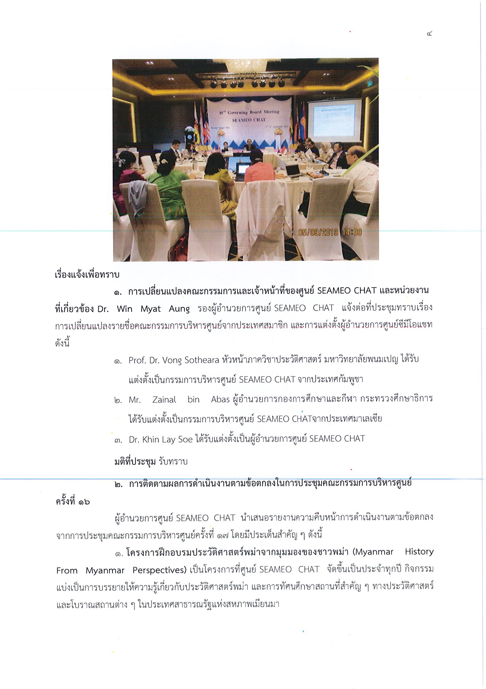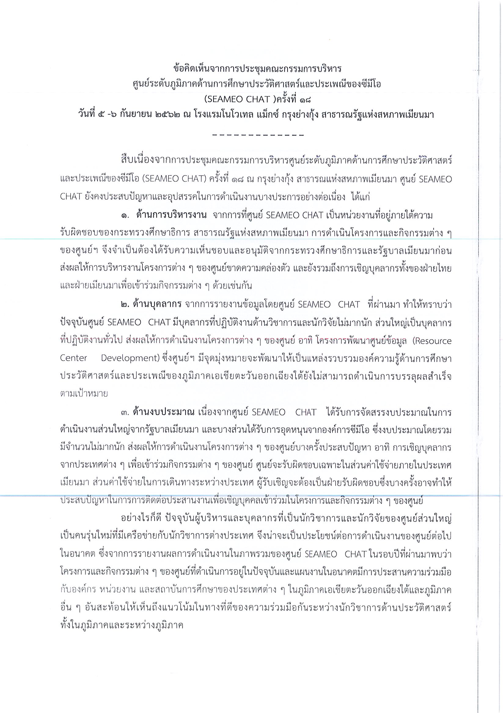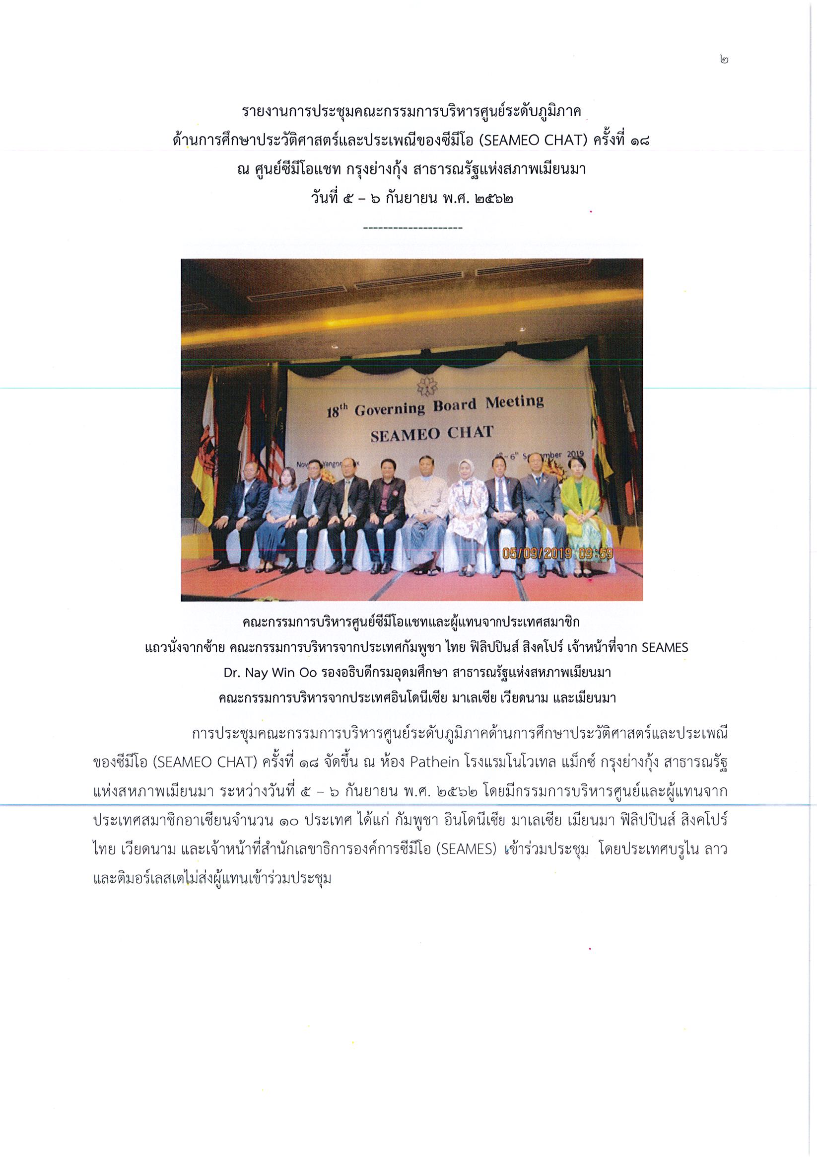 รายงานการเดินทางไปราชการ ณ สาธารณรัฐแห่งสหภาพเมียนมาร์ ระหว่างวันที่ 5 – 6 กันยายน 2562 โครงการประชุมคณะกรรรมการบริหารศูนย์ระดับภูมิภาคด้านการศึกษาประวัติศาสตร์และประเพณีของซีมีโอ ครั้งที่ 18