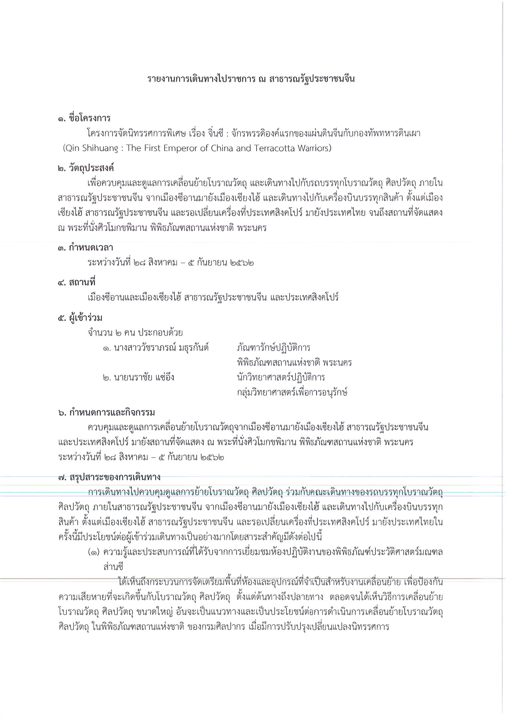 รายงานการเดินทางไปราชการ ณ สาธารณรัฐประชาชนจีน ระหว่างวันที่ 28 สิงหาคม – 5 กันยายน 2562 โครงการควบคุมและดูแลการเคลื่อนย้ายโบราณวัตถุเพื่อจัดนิทรรสการพิเศษ “จิ๋นซีฮ่องเต้: จักรพรรดิองค์แรกของแผ่นดินจีนกับกองทัพทหารดินเผา”