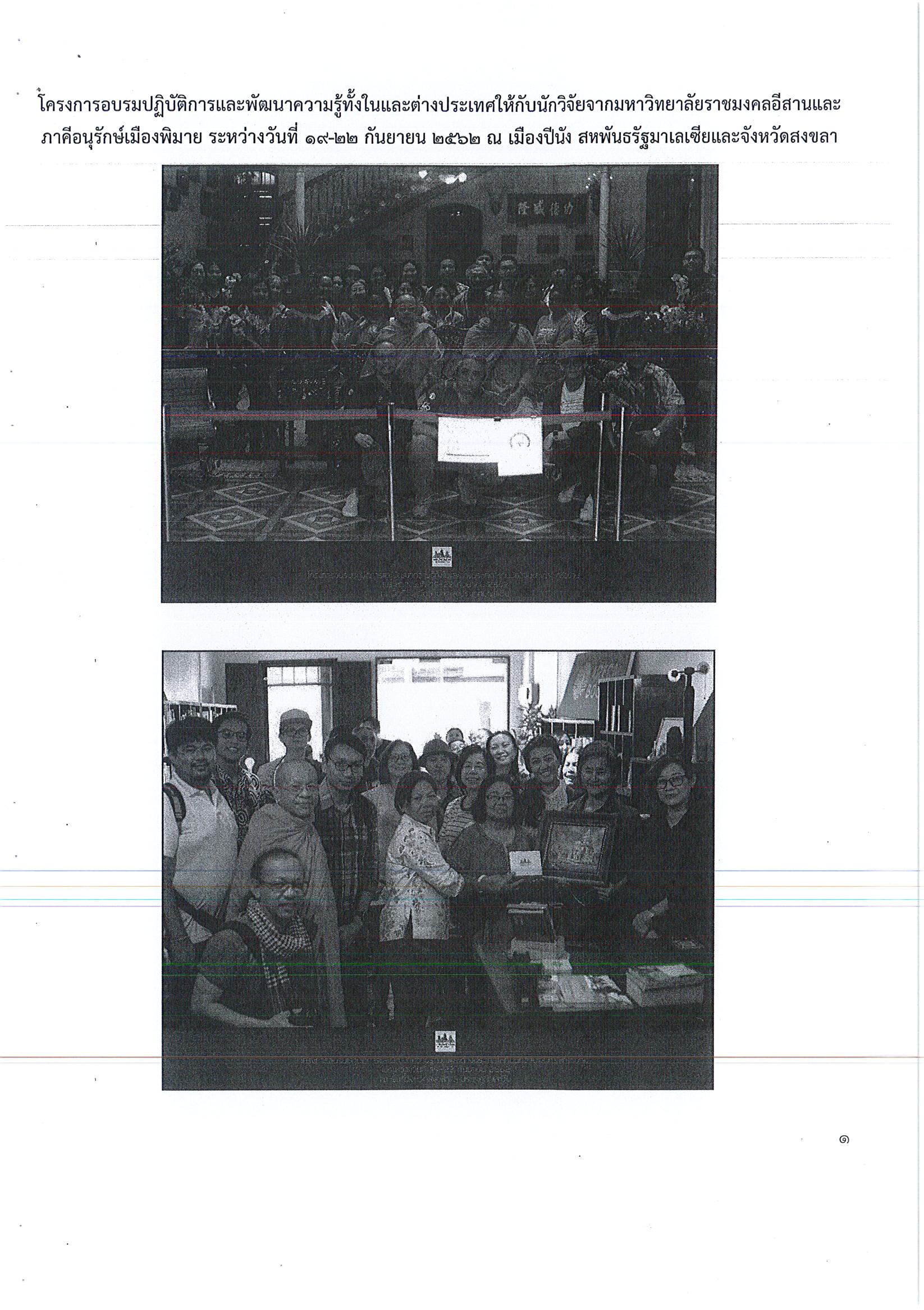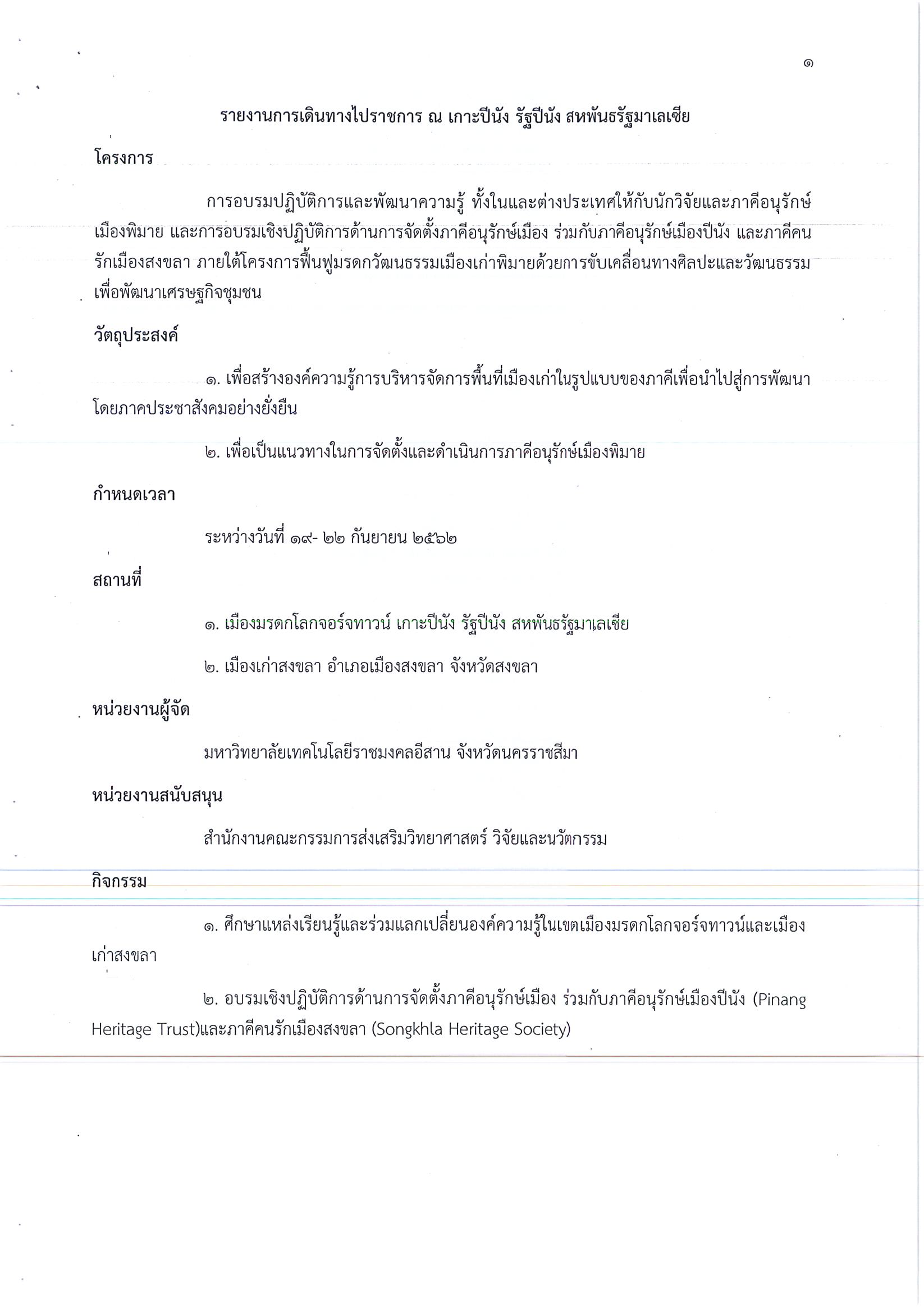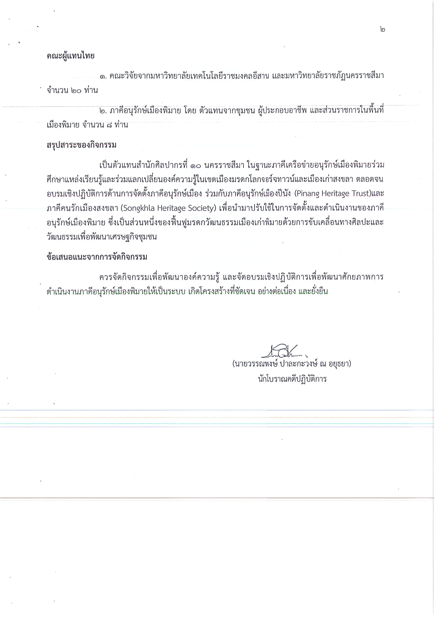 รายงานการเดินทางไปราชการ ณ สหพันธรัฐมาเลเซีย ระหว่างวันที่ 19 – 22 กันยายน 2562 โครงการอบรมปฏิบัติการและพัฒนาความรู้ ทั้งในและต่างประเทศให้กับนักวิจัยและภาคีอนุรักษ์เมืองเก่าพิมาย และการอบรมเชิงปฏิบัติการด้านการจัดตั้งภาคีอนุรักษ์เมือง ร่วมกับภาคีอนุรักษ์เมืองเก่าปีนัง และภาคีอนุรักษ์เมืองสงขลา ภายใต้โครงการฟื้นฟูมรดกวัฒนธรรมเมืองเก่าพิมายด้วยการขับเคลื่อนทางศิลปะและวัฒนธรรมเพื่อพัฒนาเศรษฐกิจชุมชน