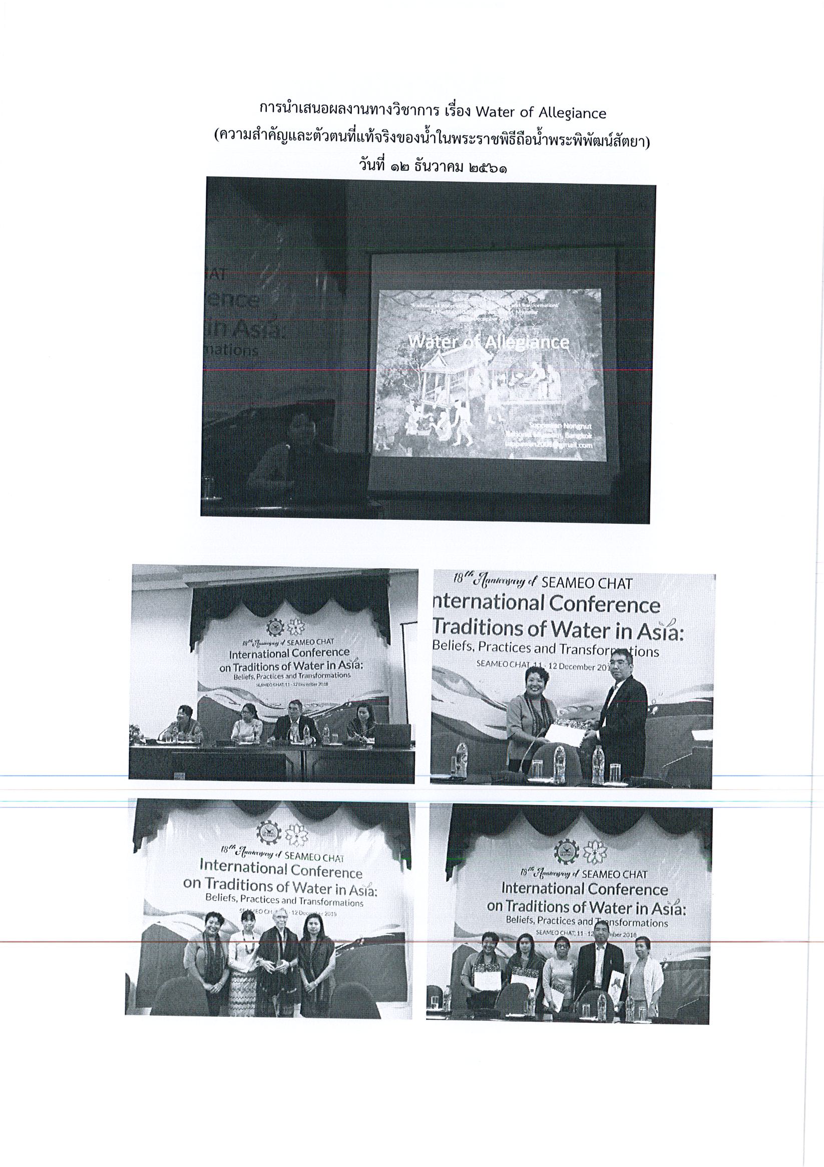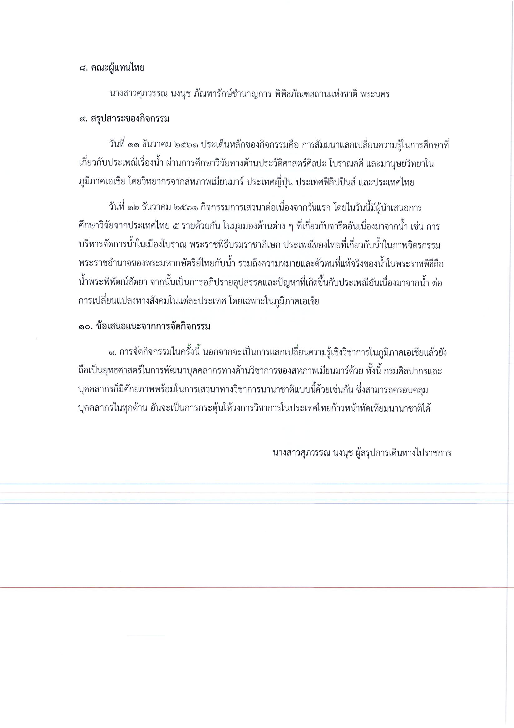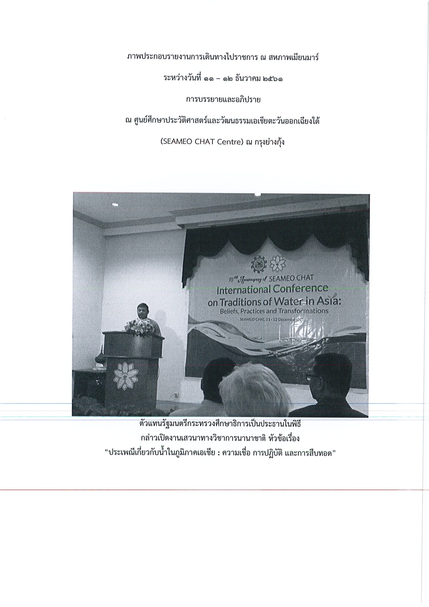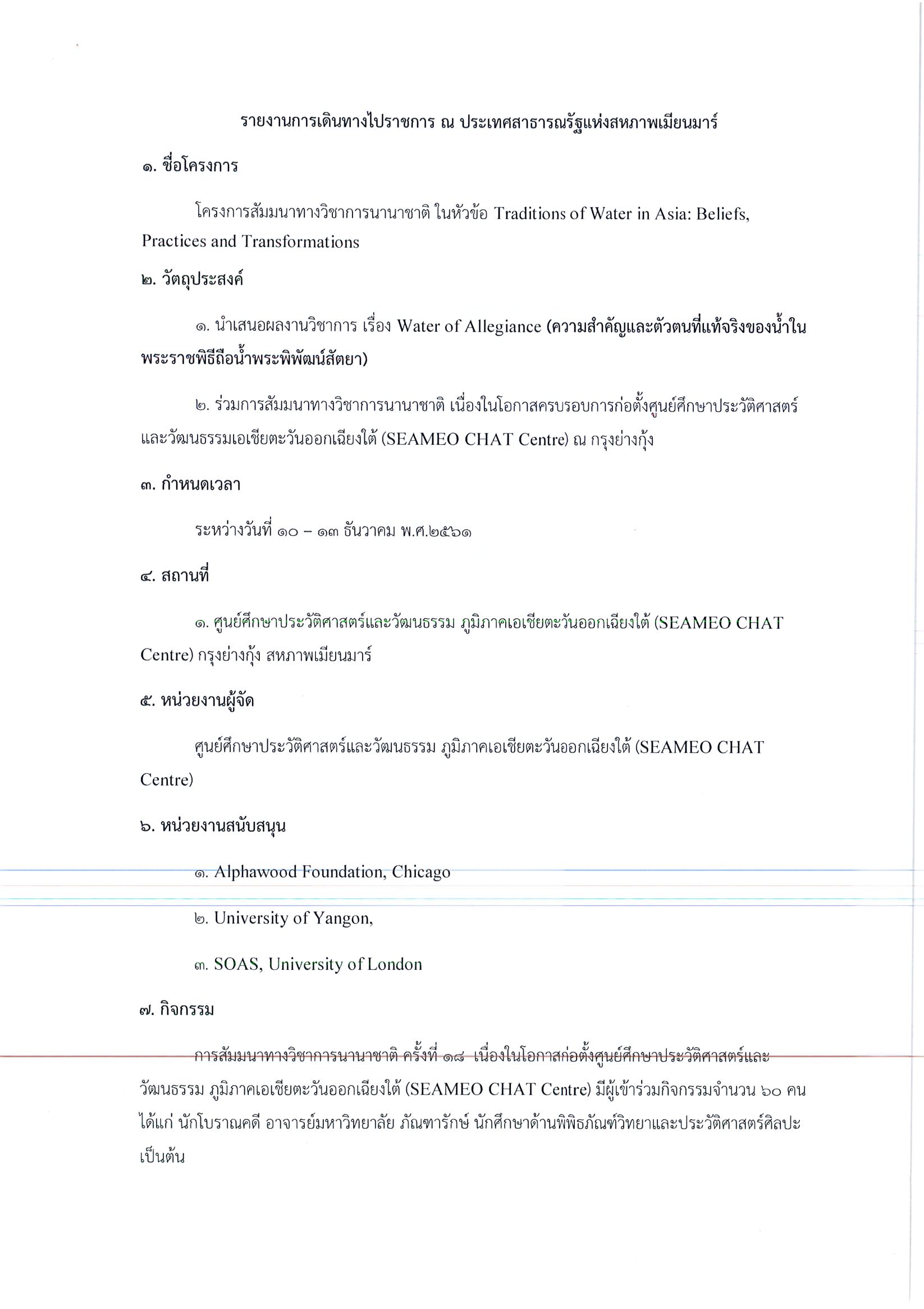 รายงานการเดินทางไปราชการ ณ สาธารณรัฐแห่งสหภาพเมียนมาร์ ระหว่างวันที่ 10 – 13 ธันวาคม 2562 โครงการสัมมนาทางวิชาการนานาชาติ Traditions of Water in Asia: Beliefs, Practices and Transformations