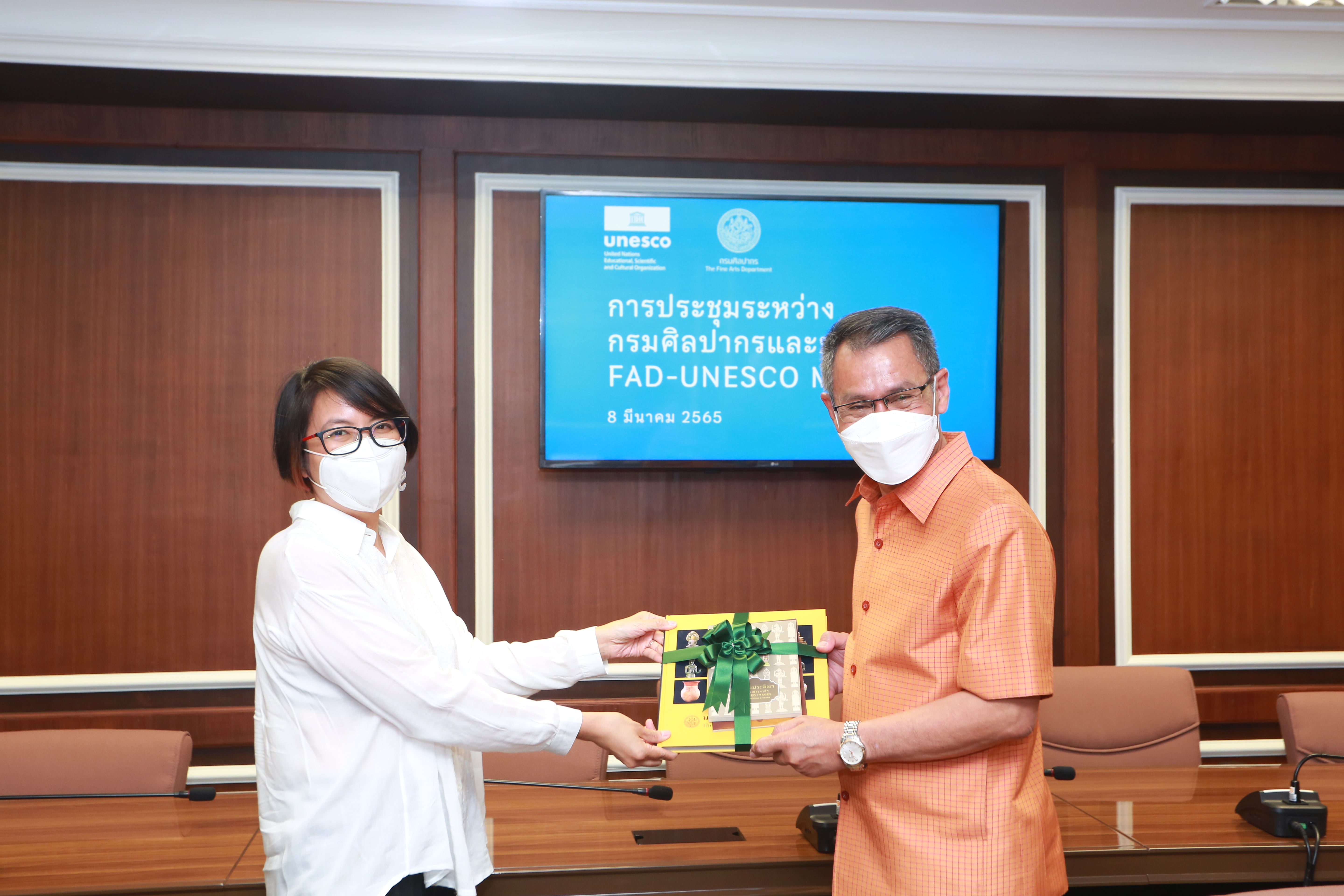 วันอังคารที่ ๘ มีนาคม ๒๕๖๕ เวลา ๑๑.๐๐ น. นายกิตติพันธ์ พานสุวรรณ อธิบดีกรมศิลปากร พร้อมด้วยนางรักชนก โคจรานนท์ ผู้อำนวยการสำนักบริหารกลาง นายชินณวุฒิ วิลยาลัย ผู้อำนวยการกองโบราณคดี ให้การต้อนรับดร.เซือง บิ๊ก ฮั่นห์หัวหน้าแผนกวัฒนธรรม องค์การยูเนสโก กรุงเทพฯ และคณะ ในโอกาสเข้าเยี่ยมคารวะและประชุมหารือ เพื่อขอความอนุเคราะห์กรมศิลปากรให้ความร่วมมือและอำนวยความสะดวกให้แก่นายไมเคิล เทอเทิล ที่ปรึกษายูเนสโก ในการเก็บข้อมูลเกี่ยวกับแหล่งมรดกโลกทางพระพุทธศานา รวมทั้งเชิญบุคลากรของกรมศิลปากรเข้าร่วมการอบรมเชิงปฏิบัติการ เรื่อง การเล่าเรื่องผ่านสื่อดิจิทัลสำหรับแหล่งมรดกโลก ณ ห้องประชุมชั้น ๘ อาคารกรมศิลปากร เทเวศร์