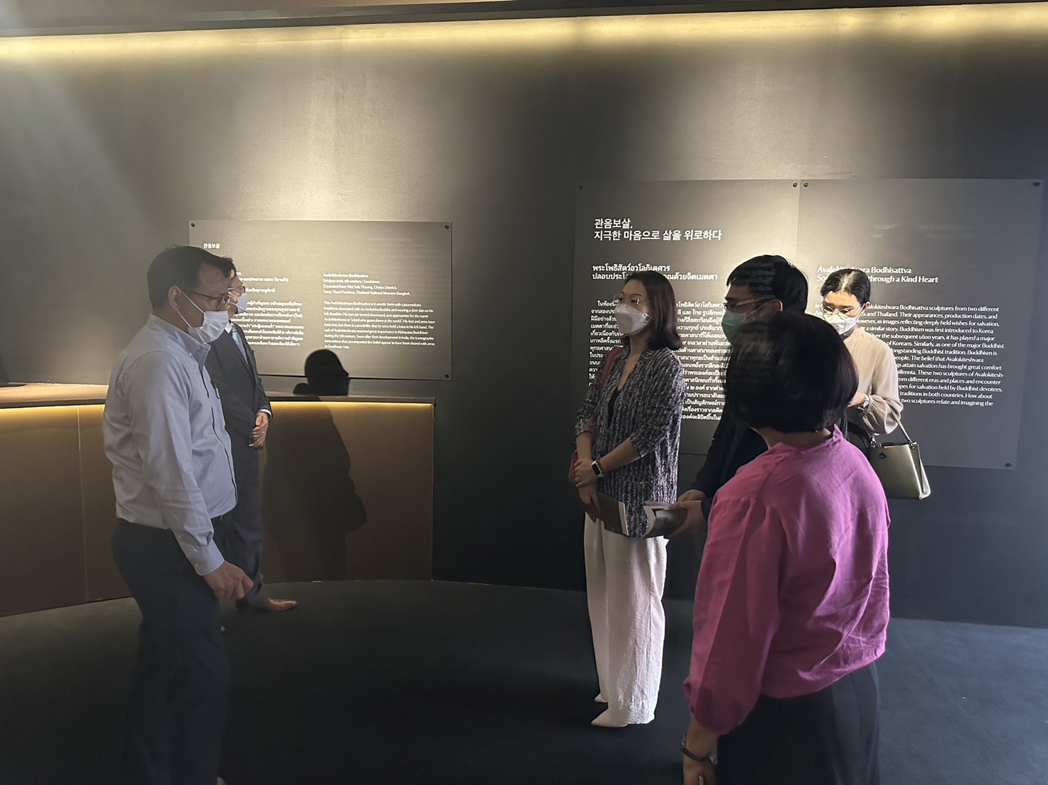 วันพฤหัสบดีที่ ๑๒ มกราคม ๒๕๖๖ เวลา ๑๔.๓๐น. Ms. CHANG Yumeng ที่ปรึกษาด้านวัฒนธรรมสถานเอกอัครราชทูตสาธารณรัฐประชาชนจีนประจำประเทศไทย เข้าเยี่ยมชมนิทรรศการศิลปะเกาหลีในโลกเสมือนจริง “A New Encounter: Immersive Gallery of Korean Art” ซึ่งจัดแสดง ณ ห้อง ๔๐๑ อาคารมหาสุรสิงหนาท พิพิธภัณฑสถานแห่งชาติ พระนคร ในโอกาสนี้ นายดิษพงศ์ เนตรล้อมวงศ์ ภัณฑารักษ์ชำนาญการพิเศษ ผู้อำนวยการกลุ่มวิจัย สำนักพิพิธภัณฑสถานแห่งชาติ พร้อมด้วยเจ้าหน้าที่กรมศิลปากรที่เกี่ยวข้องให้การต้อนรับ