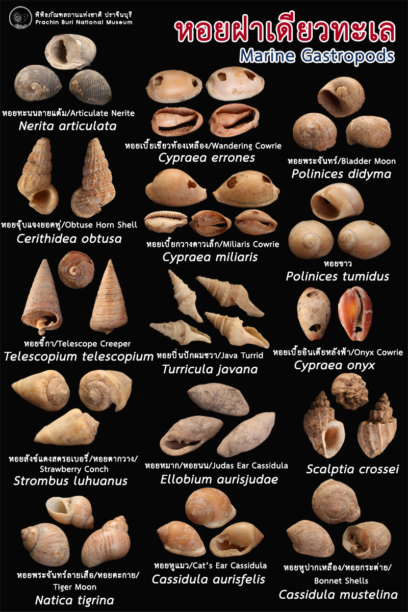 - หอยฝาเดียว (Marine Gastropods) ที่พบจำนวนมาก ได้แก่