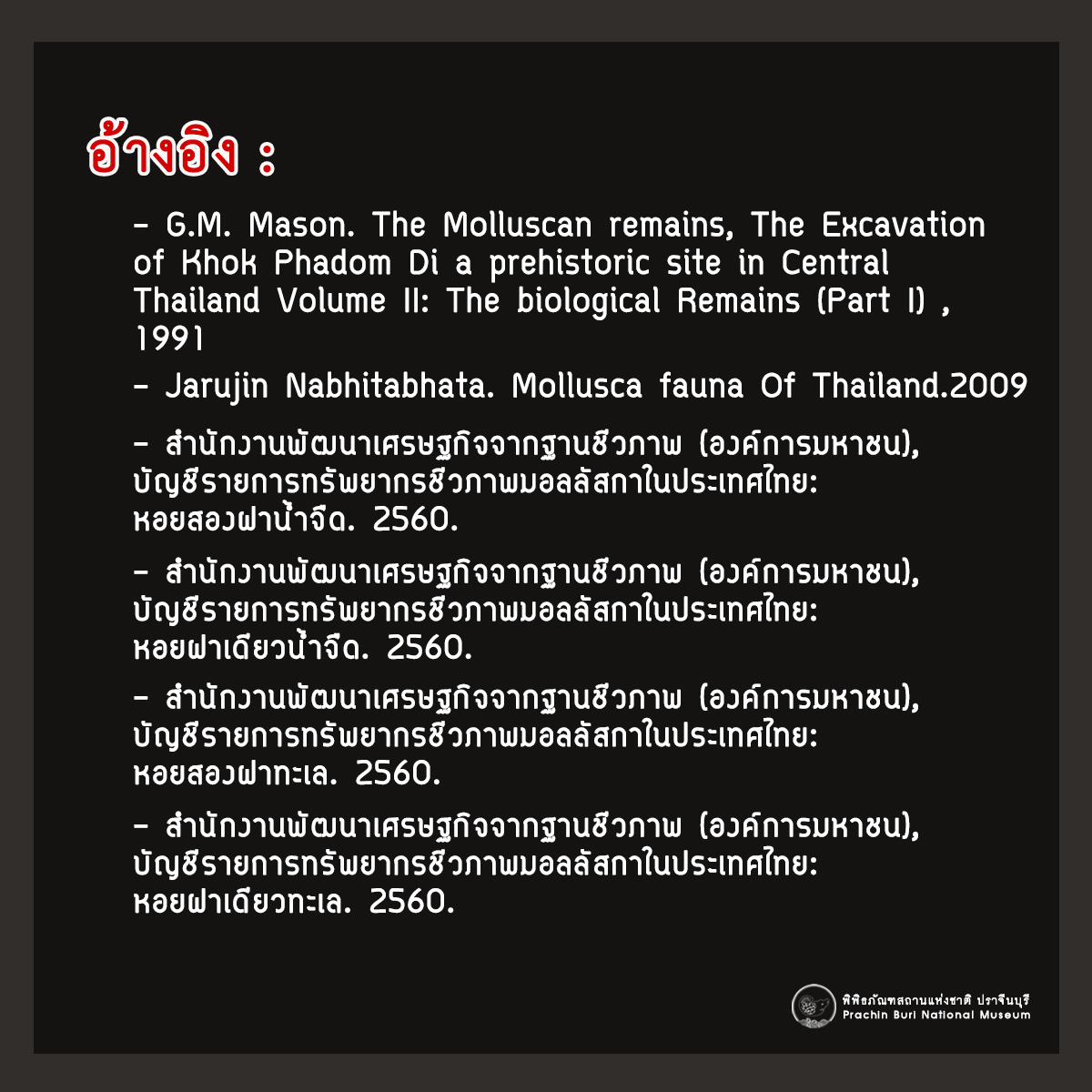 - สำนักงานพัฒนาเศรษฐกิจจากฐานชีวภาพ (องค์การมหาชน), บัญชีรายการทรัพยากรชีวภาพมอลลัสกาในประเทศไทย: หอยสองฝาทะเล. 2560.